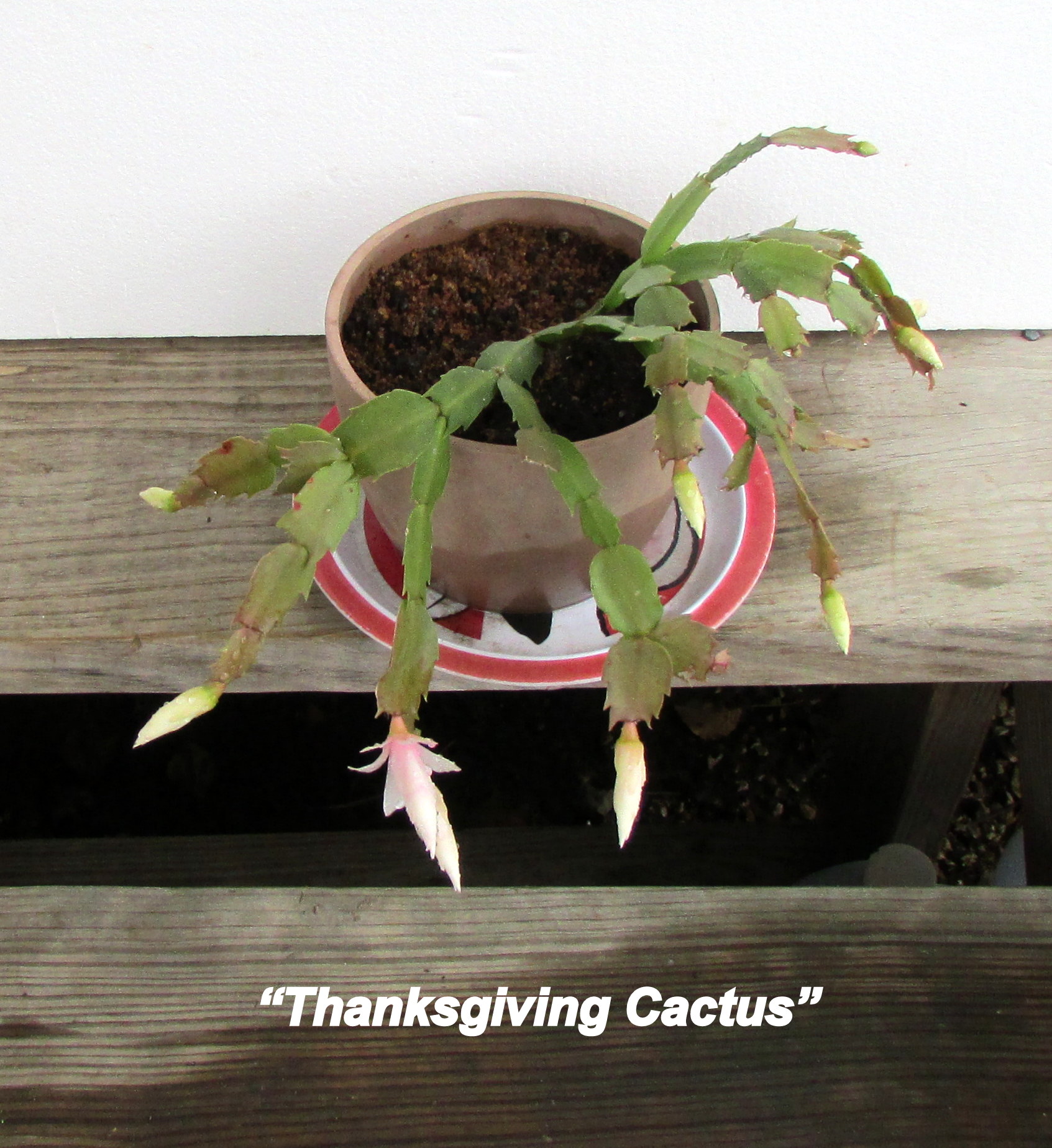 Now that the cactus is beginning to bloom, it has been identified as a “Thanksgiving Cactus.” A friend tells me her cactus is in full bloom–and beautiful.