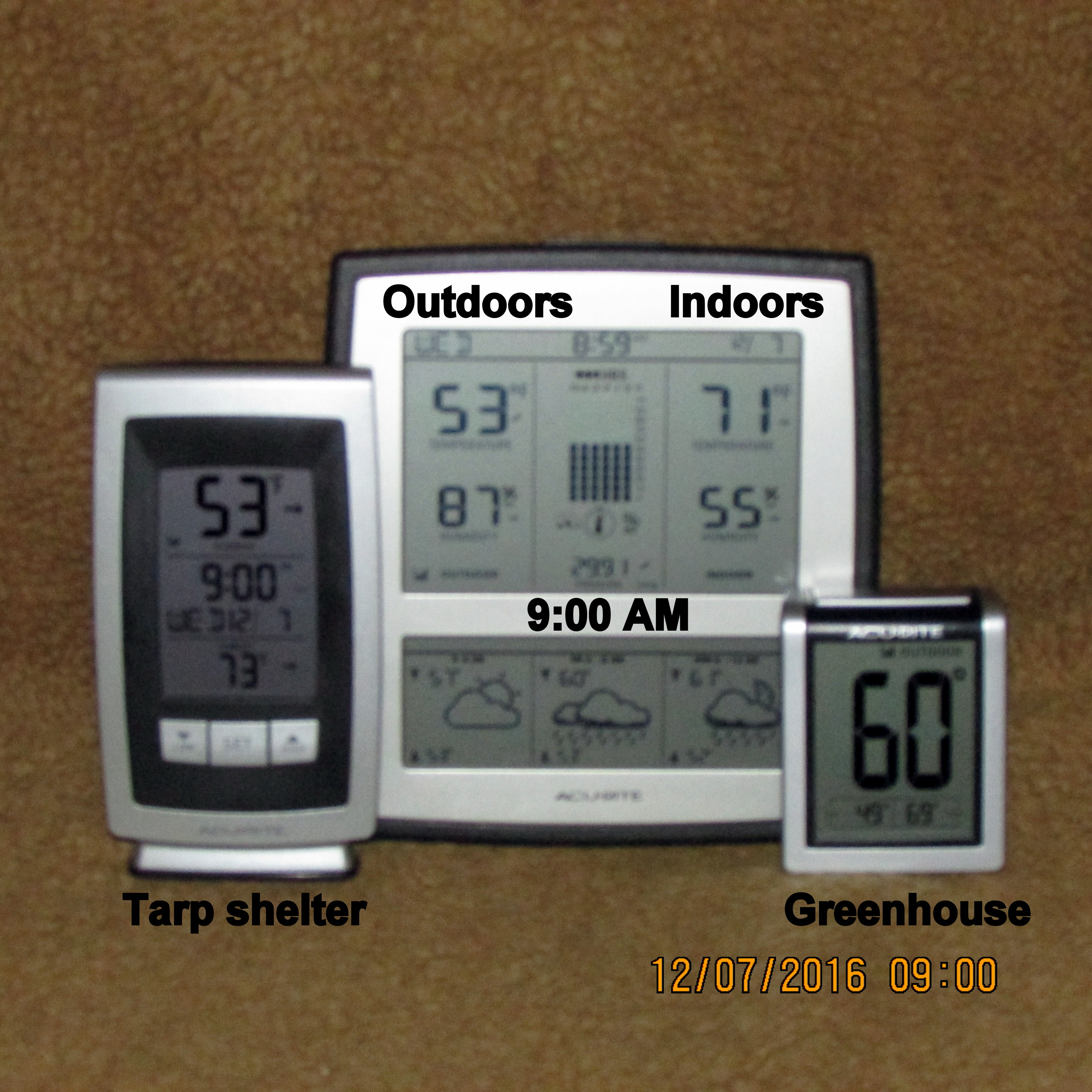 Yesterday, I specifically went shopping for another thermometer. The greenhouse now has the sensor formerly in the tarp shelter. With a “cold front” moving in, I want to monitor the temperature in the tarp shelter. More than thirty plants under cover; I can’t control the weather but I can protect the plants.