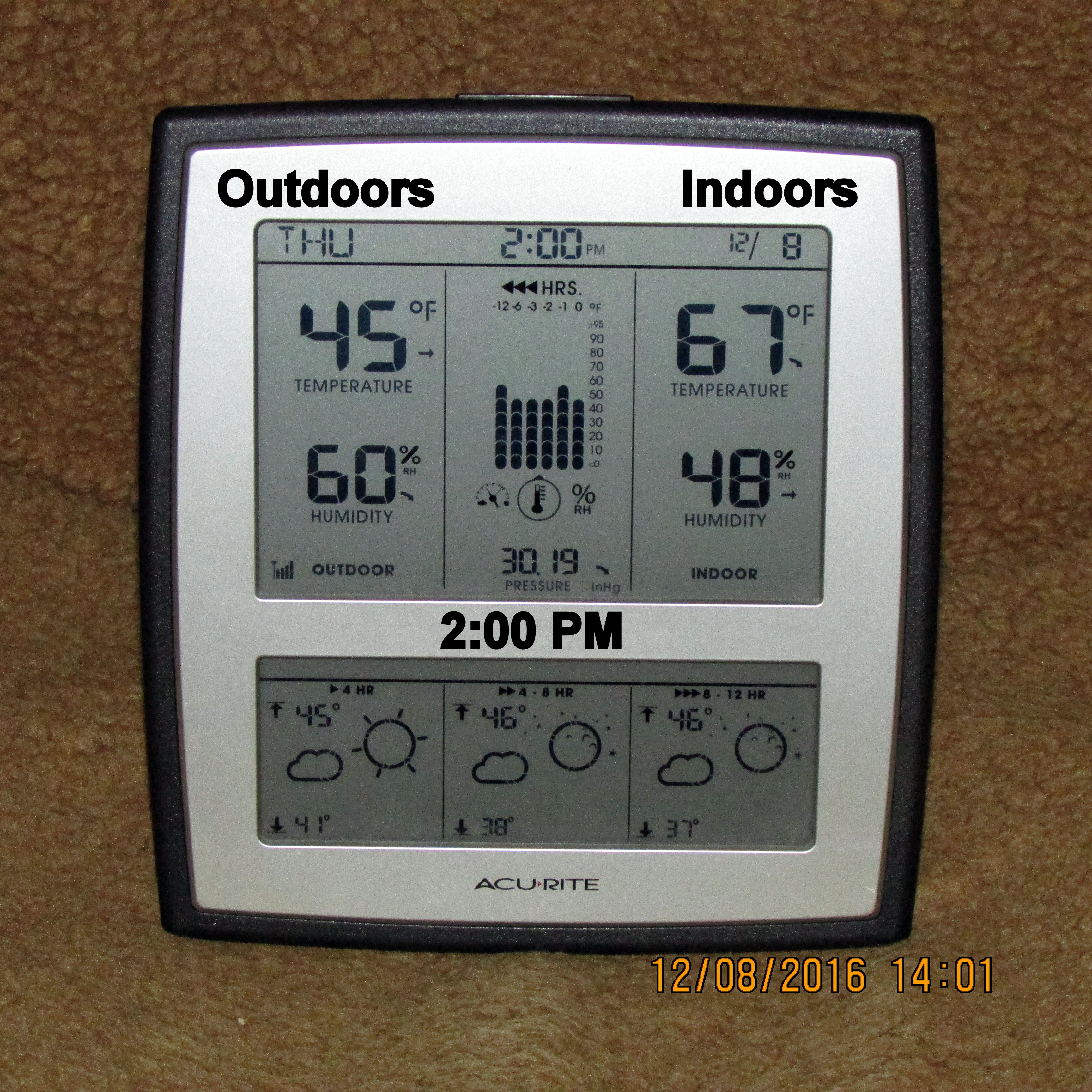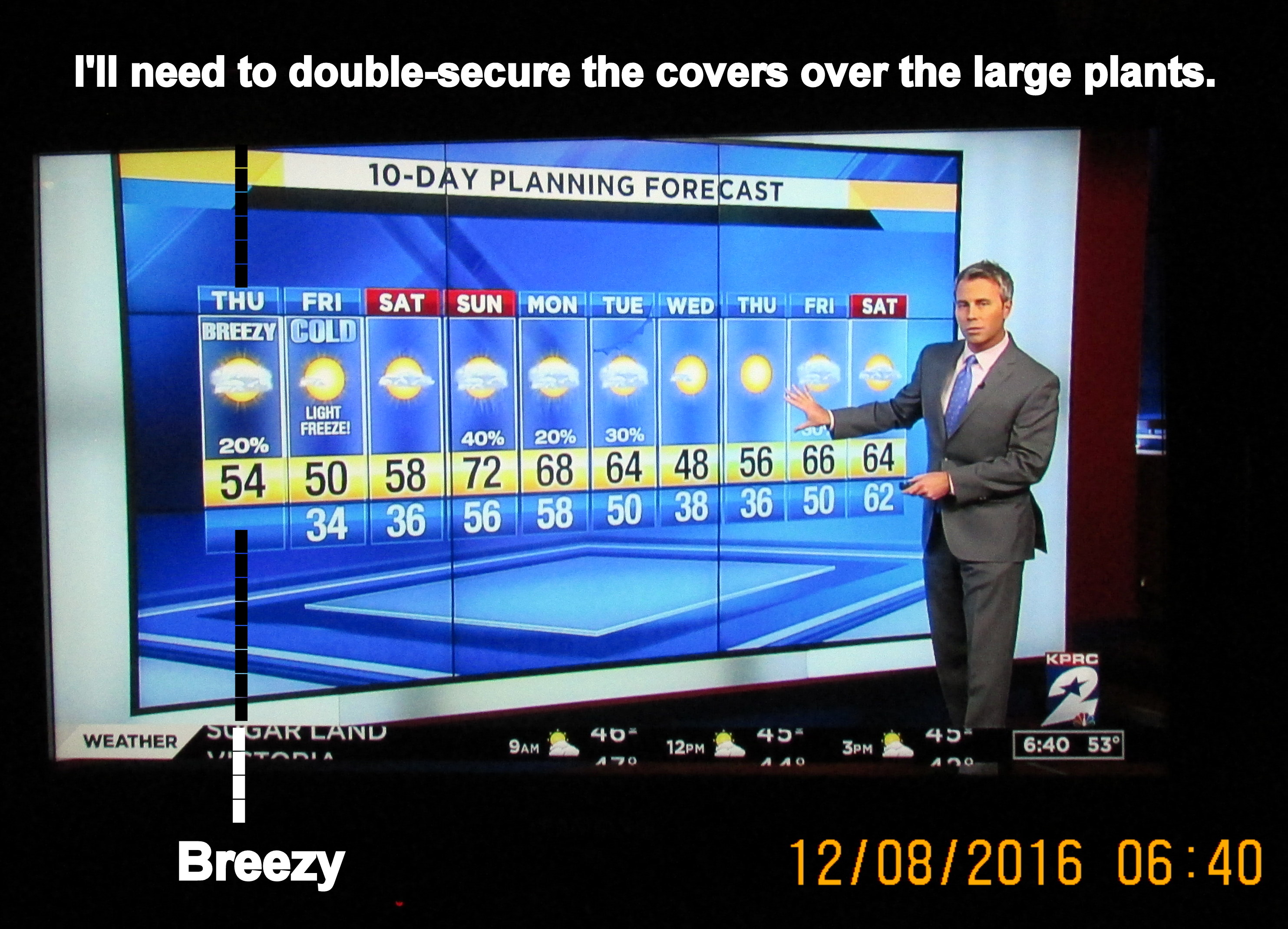 Today, I repeatedly checked temperatures and documented the drop in temperature. At 6:40, the meteorologist said “Freezing from midnight ’til nine.”