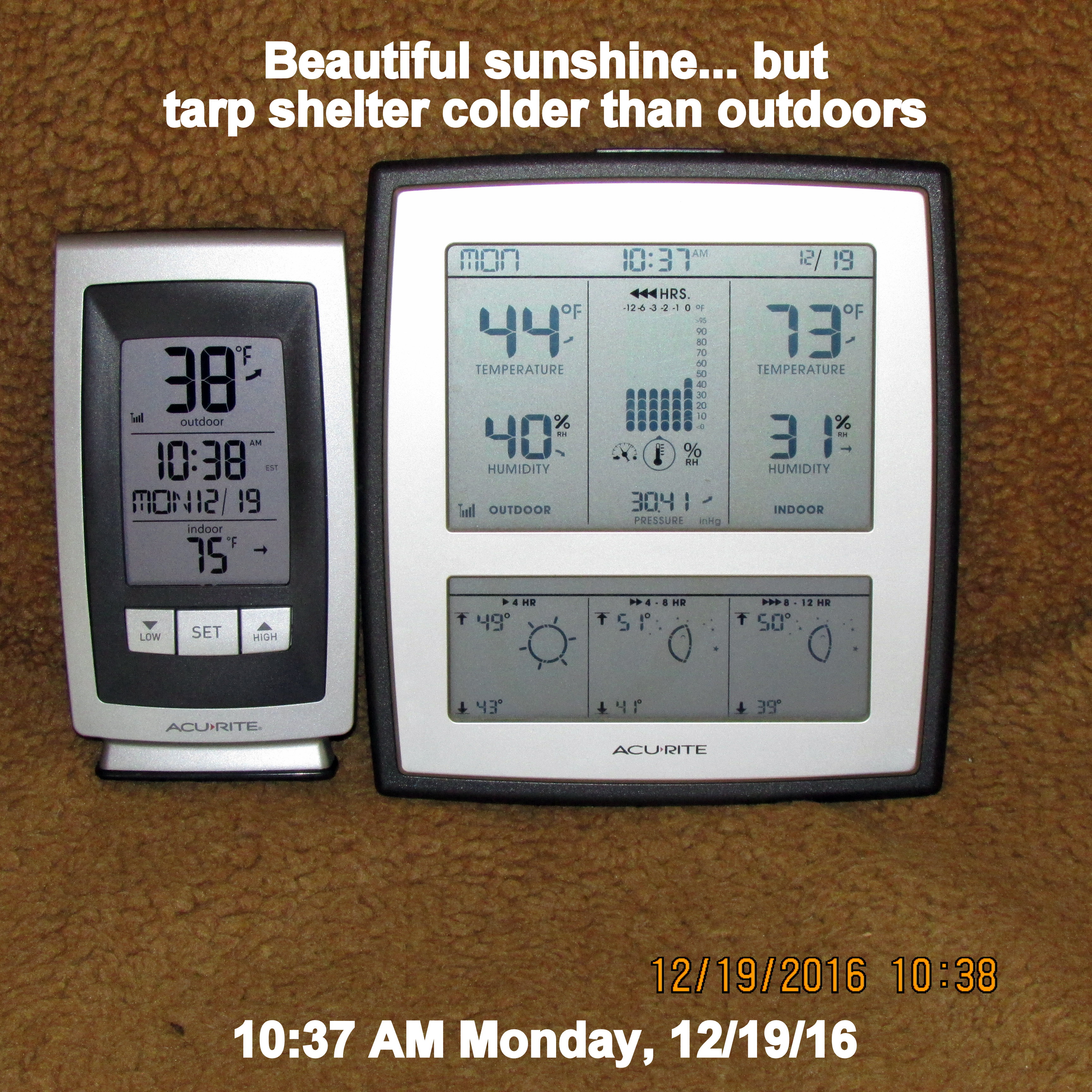 First and foremost: I identify with these two pictures. At 2:00 AM, I ventured out into the freezing temperatures to turn on the heater in the tarp shelter. That was an “exercise in futility” because it didn’t warm the area. At 9:00 AM, I brought it into my trailer home and (imho) a very poor excuse of a heater because virtually no heat!! It was an inexpensive heater so I got exactly what I paid for.