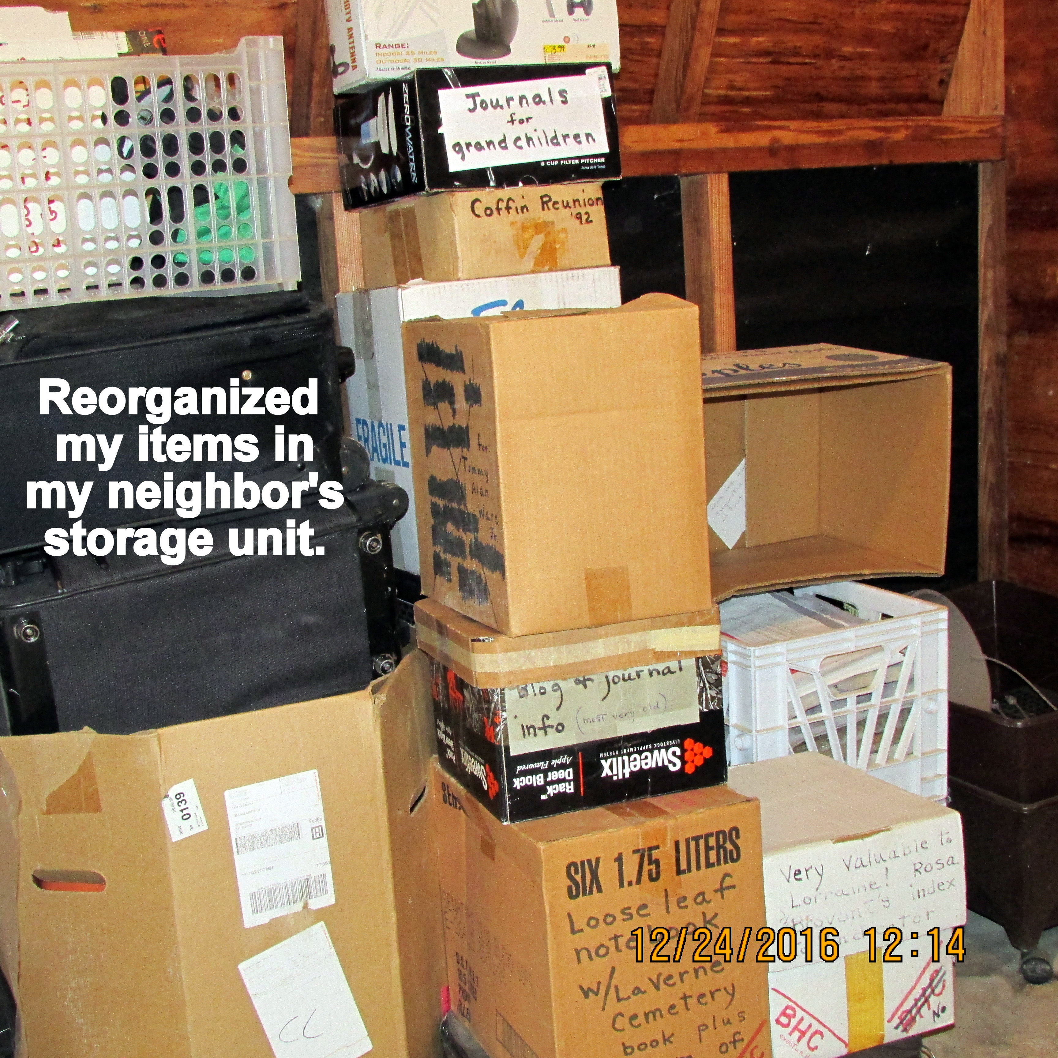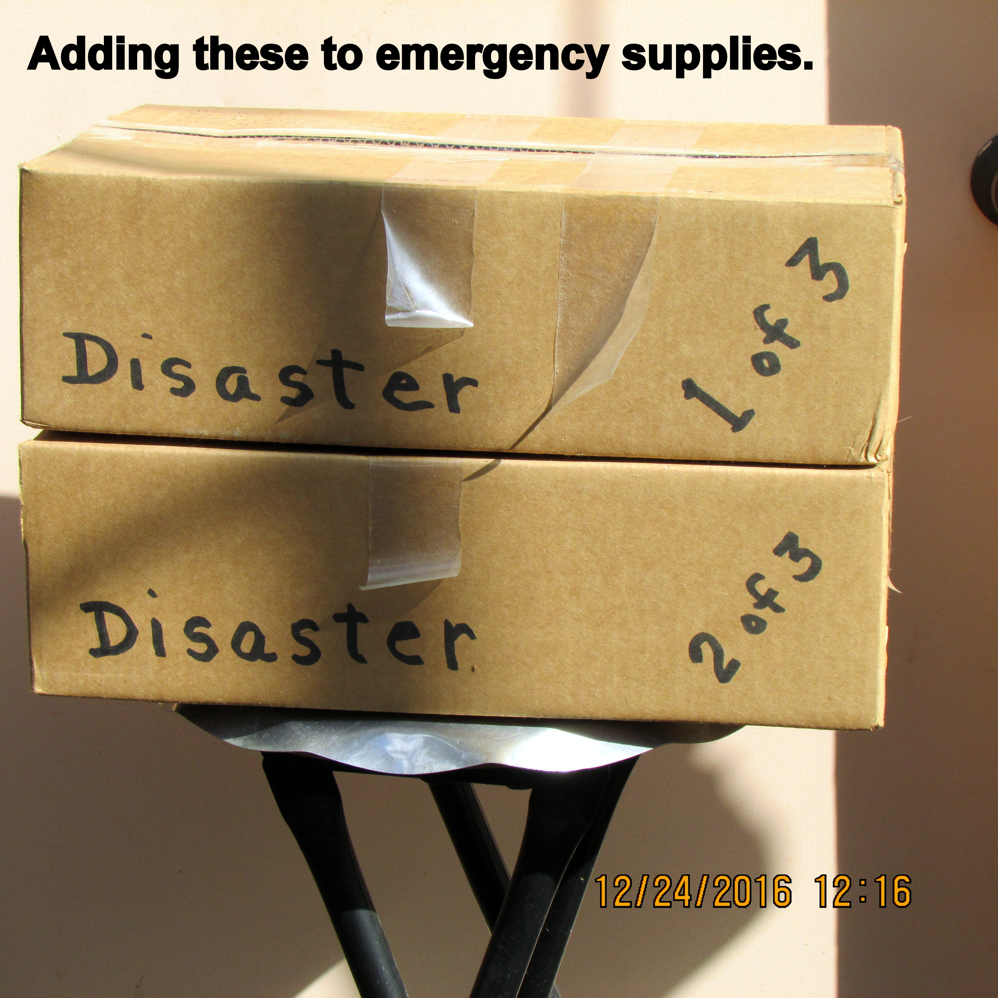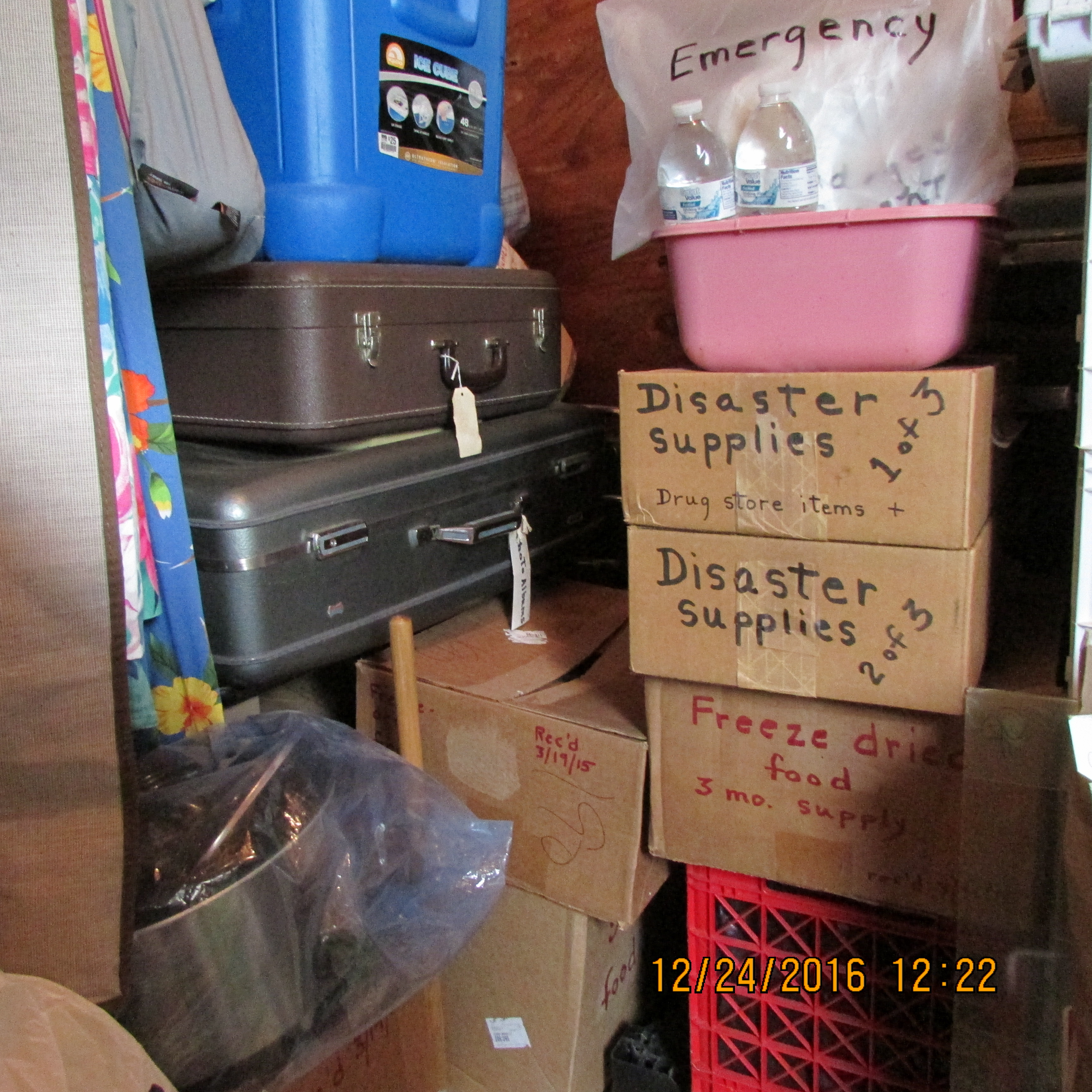 Recently, I shifted some of my “stuff” from the mini-storage (down the highway) to my neighbor’s almost empty storage building. Today, I organized… and hope to get the remaining “stuff” moved before the first of the year (so no more storage fees). ~~ When did I pack those disaster supplies?? Is it possible they are part of my “earthquake preparedness” from Southern California (prior to my 2004 move)?? I’ll add them to the supplies I purchased earlier this year.