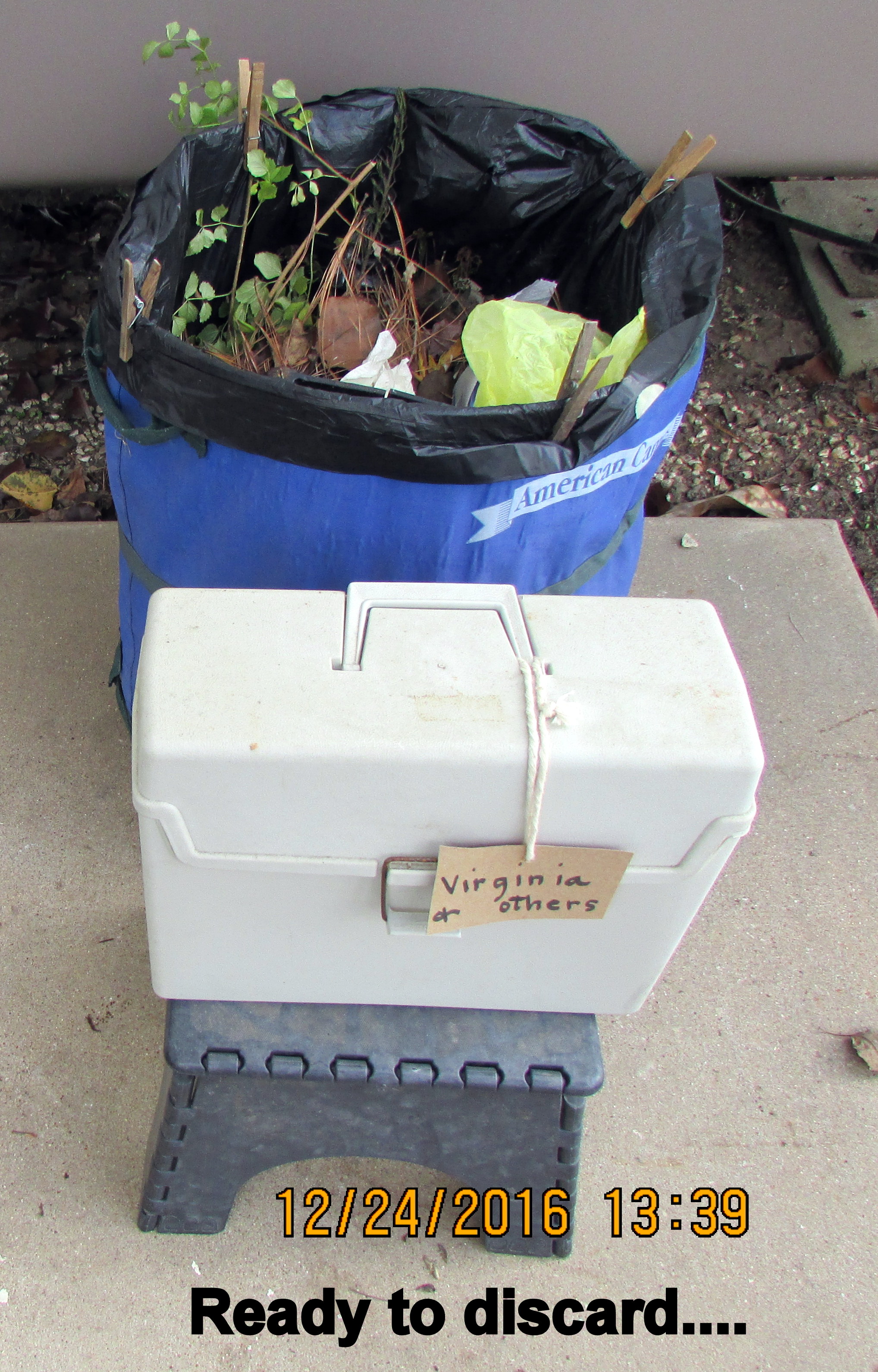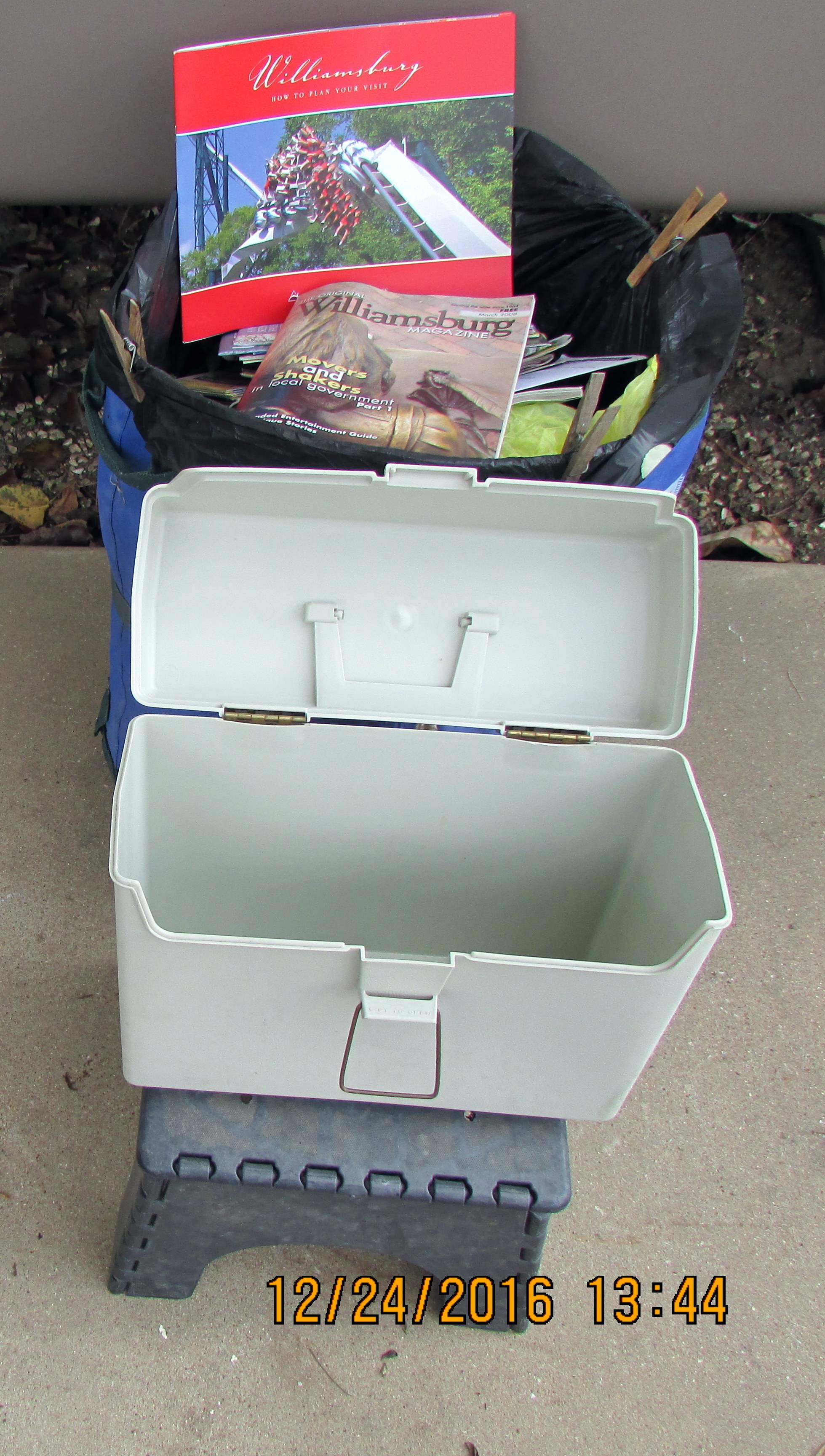 Long overdue: I MUST downsize!! At one time, I planned to expand details about my TaB Teardrop Travels (2010) and I’ve kept maps and brochures. Now they go into the trash. 😦 (That is only one of several containers!)