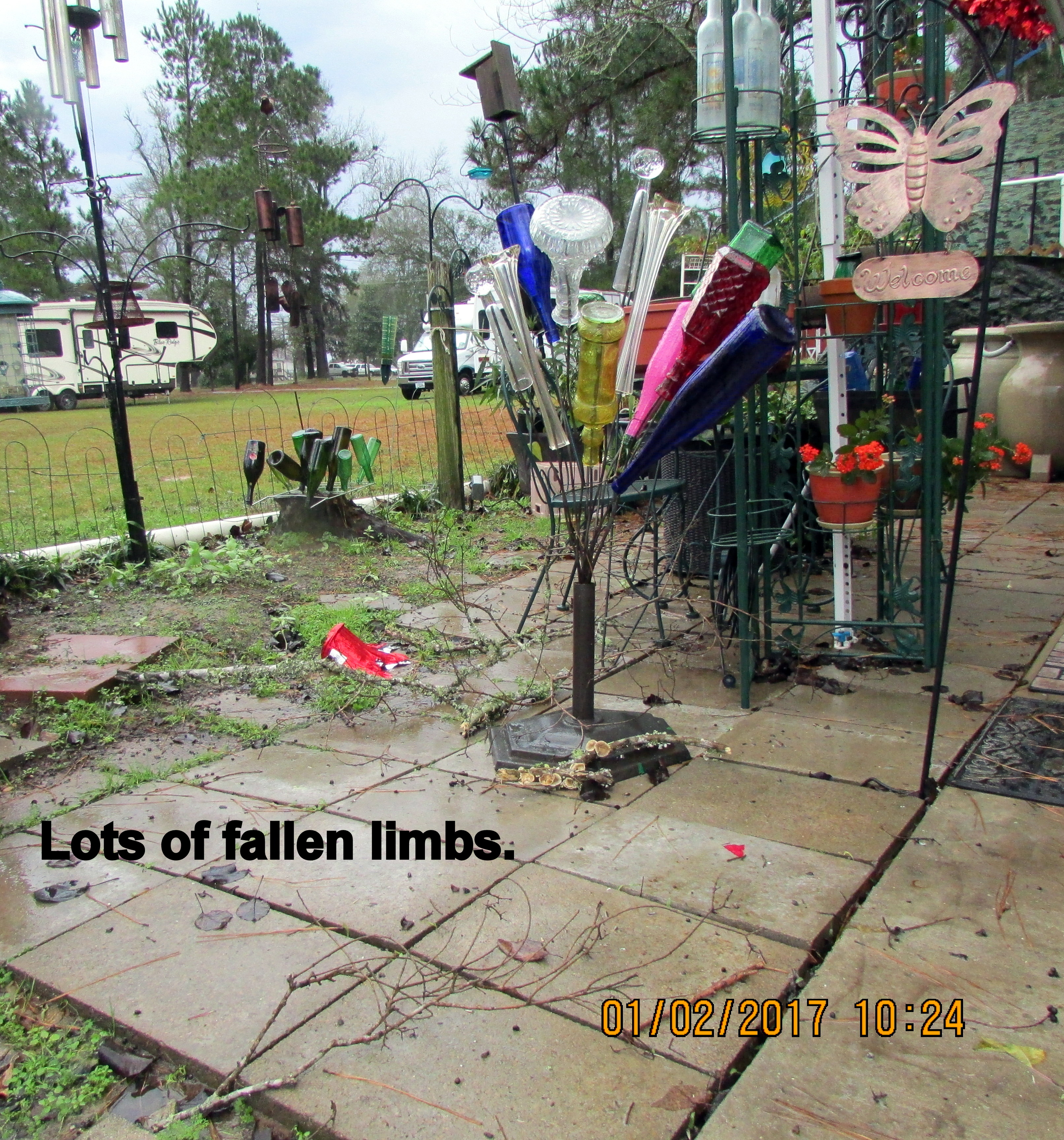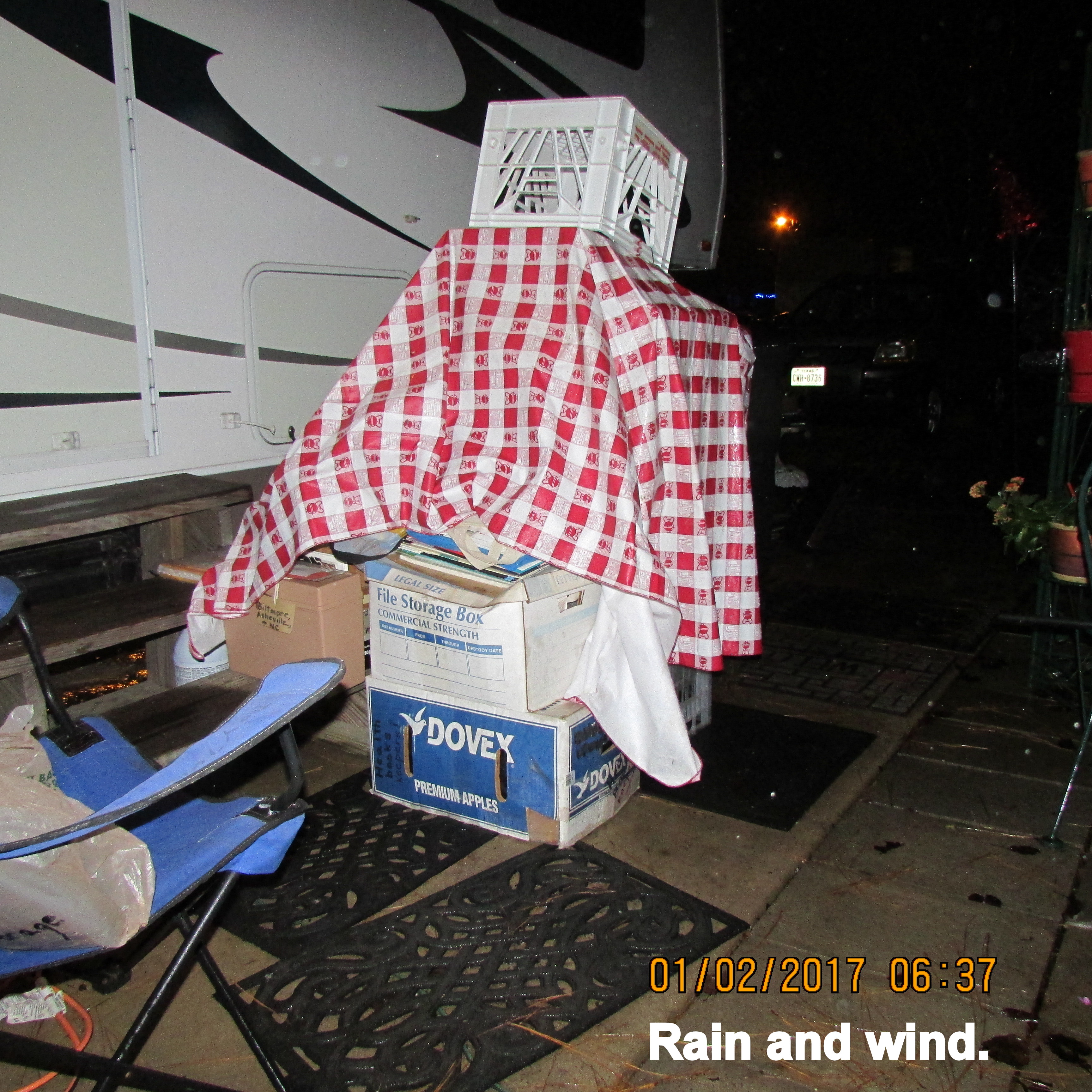 If you follow this blog, you know I am very conscious of the weather. However, a storm “snuck“ up on me. About six AM, I awakened to hard rain, wind, lightning and thunder. I’ve ventured into the foul weather to take two pictures. I’m concerned about boxes getting wet. These are boxes awaiting my “downsizing” attention. That bottom box is very heavy with books I’ve identified as “keepers.” No way I can lift it into my trailer home! (Wimpy!)