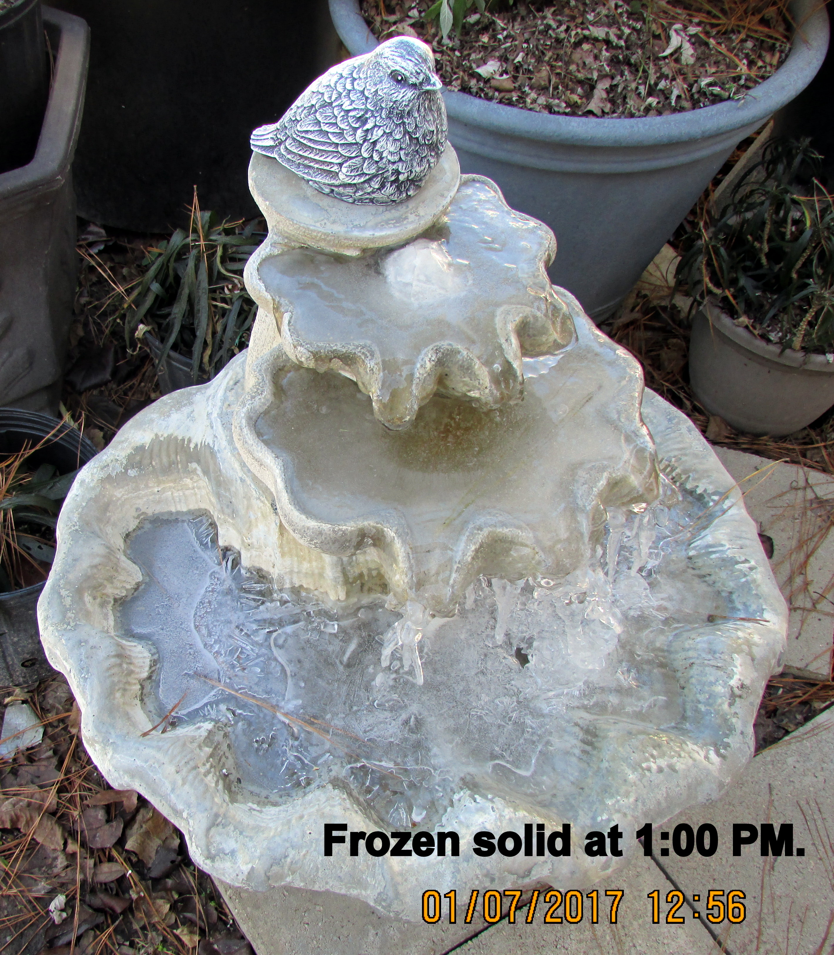 I ventured outdoors briefly to photograph the fountain. A quick tour of my “yarden” reveals many of my plants were killed by the hours of freezing temperatures!!