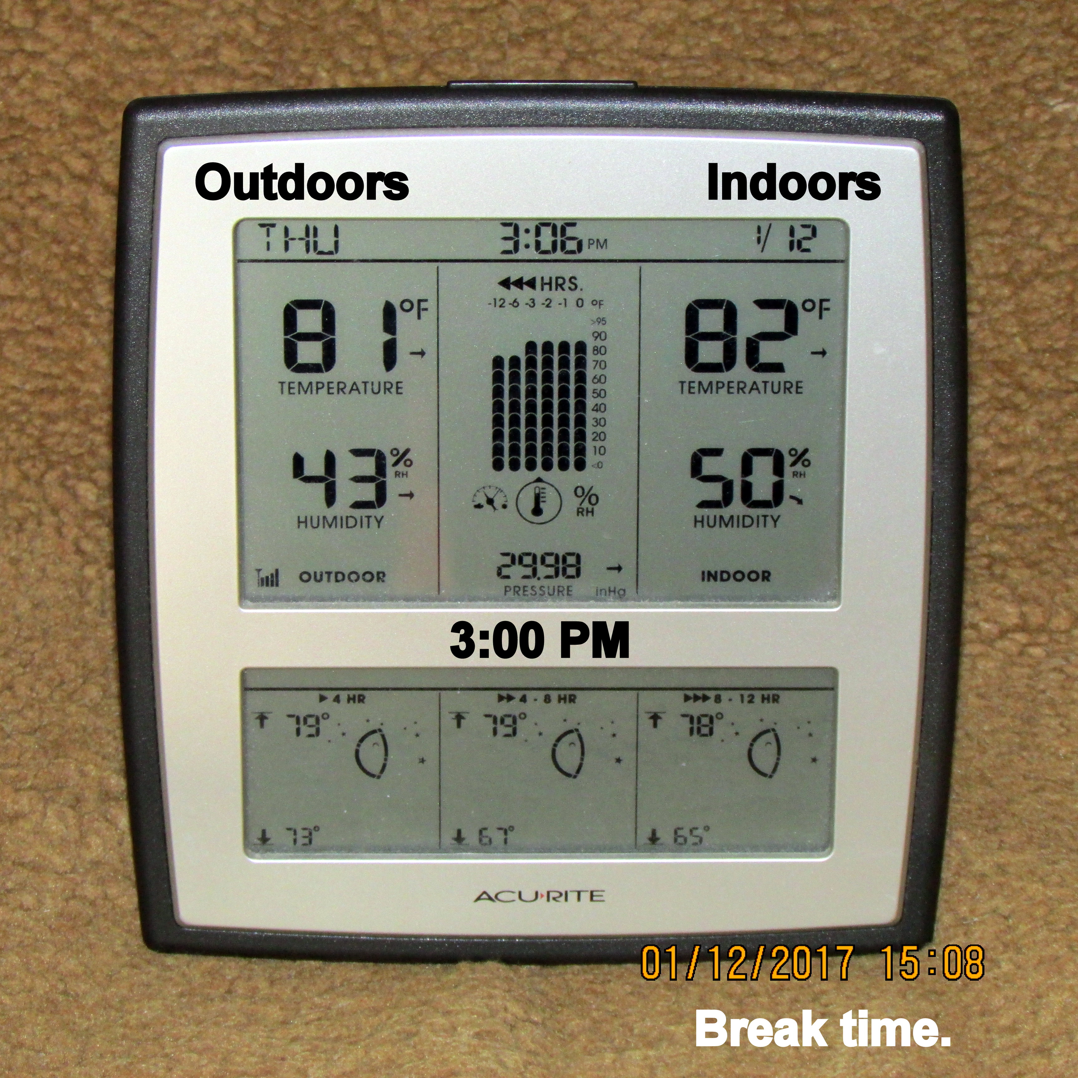 Look at the outdoor temperature. It’s difficult to comprehend the extreme change in weather in less than one week!! A brief six days ago, twenty-three degrees!!