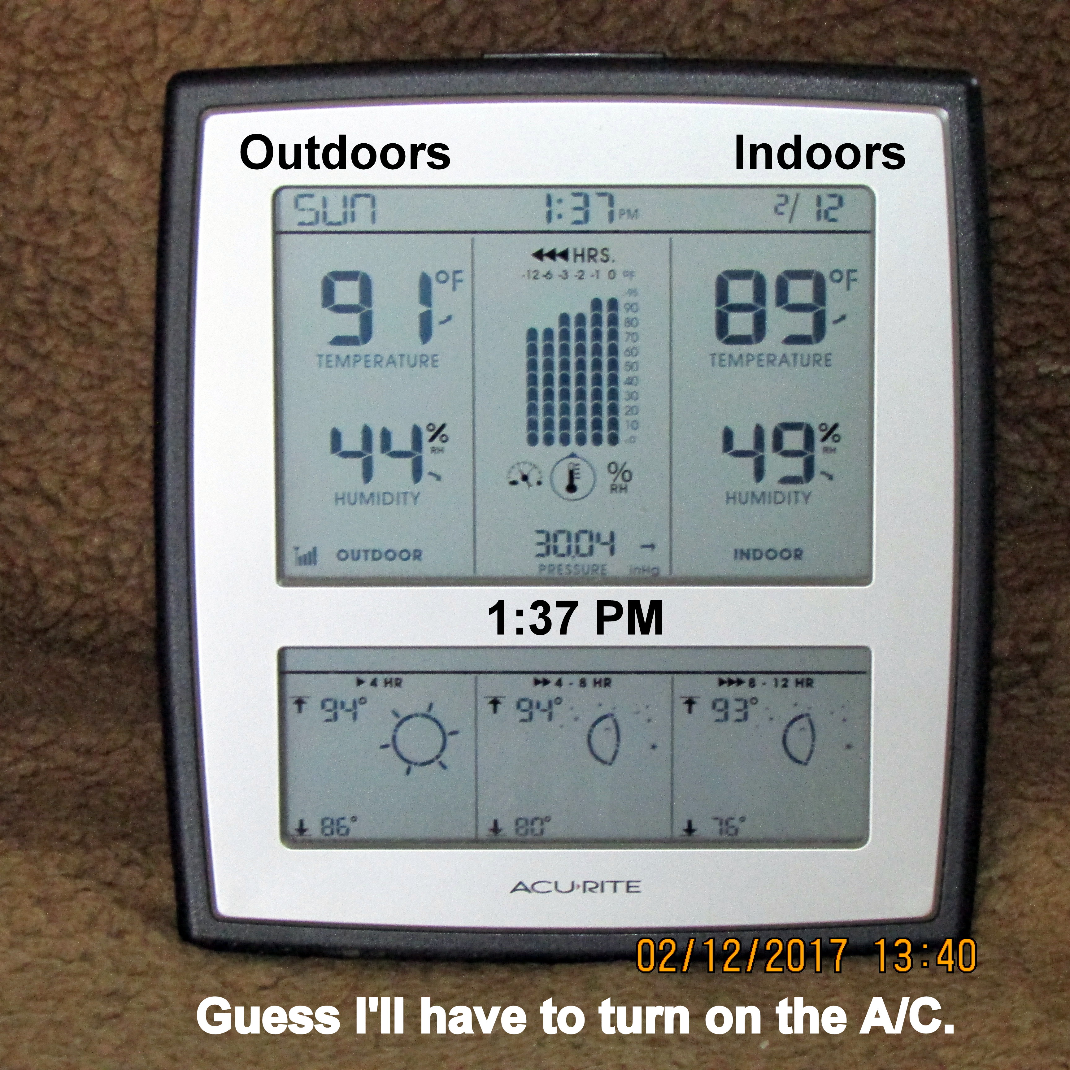 Time for A/C ?! Feb12 by Lorraine Frantz Edwards Any way you look at it, it is HOT!! In my humble opinion, mid-February is “too early” to turn on the air-conditioner!! Share this: Click to share on X (Opens in new window) X Click to share on Facebook (Opens in new window) Facebook Like Loading...