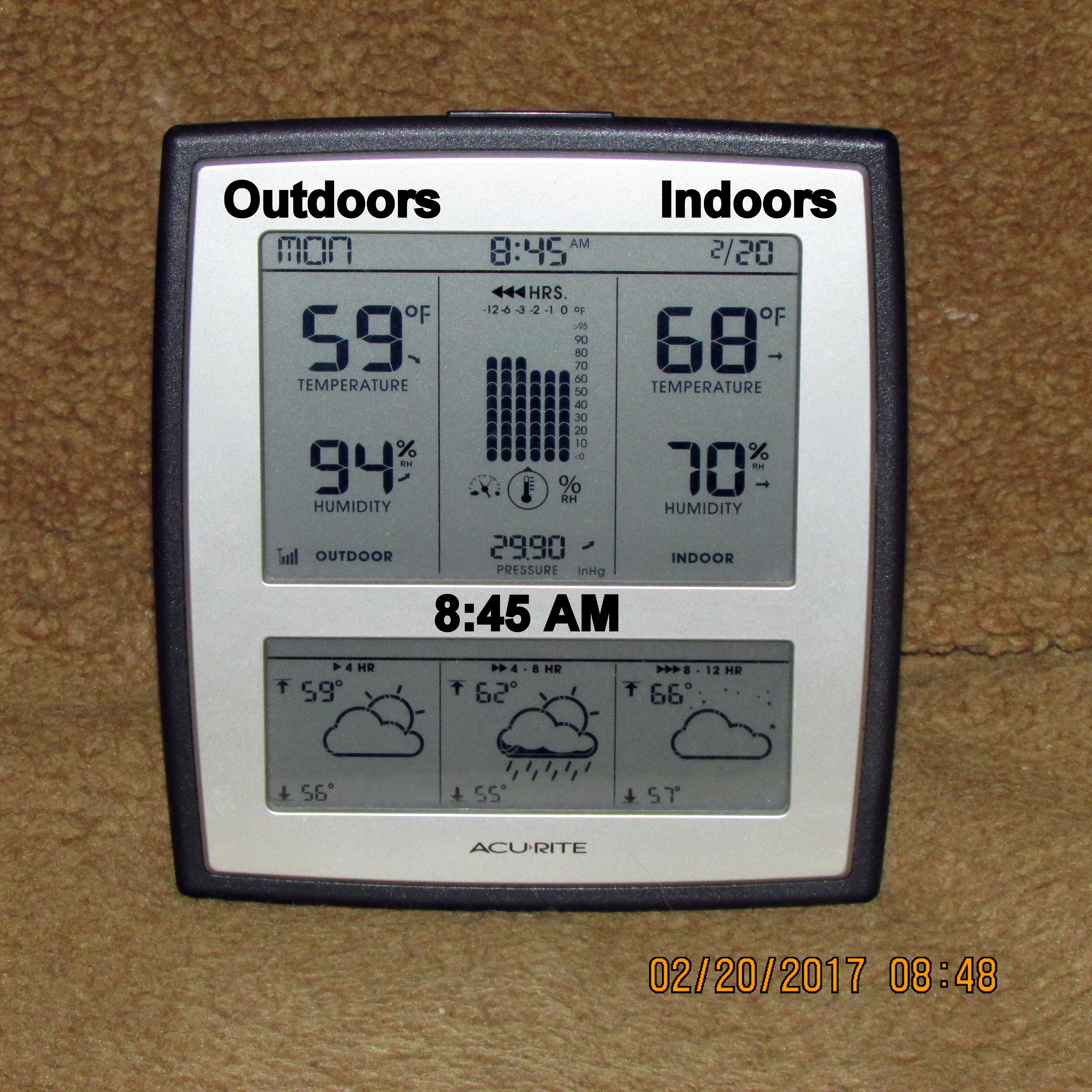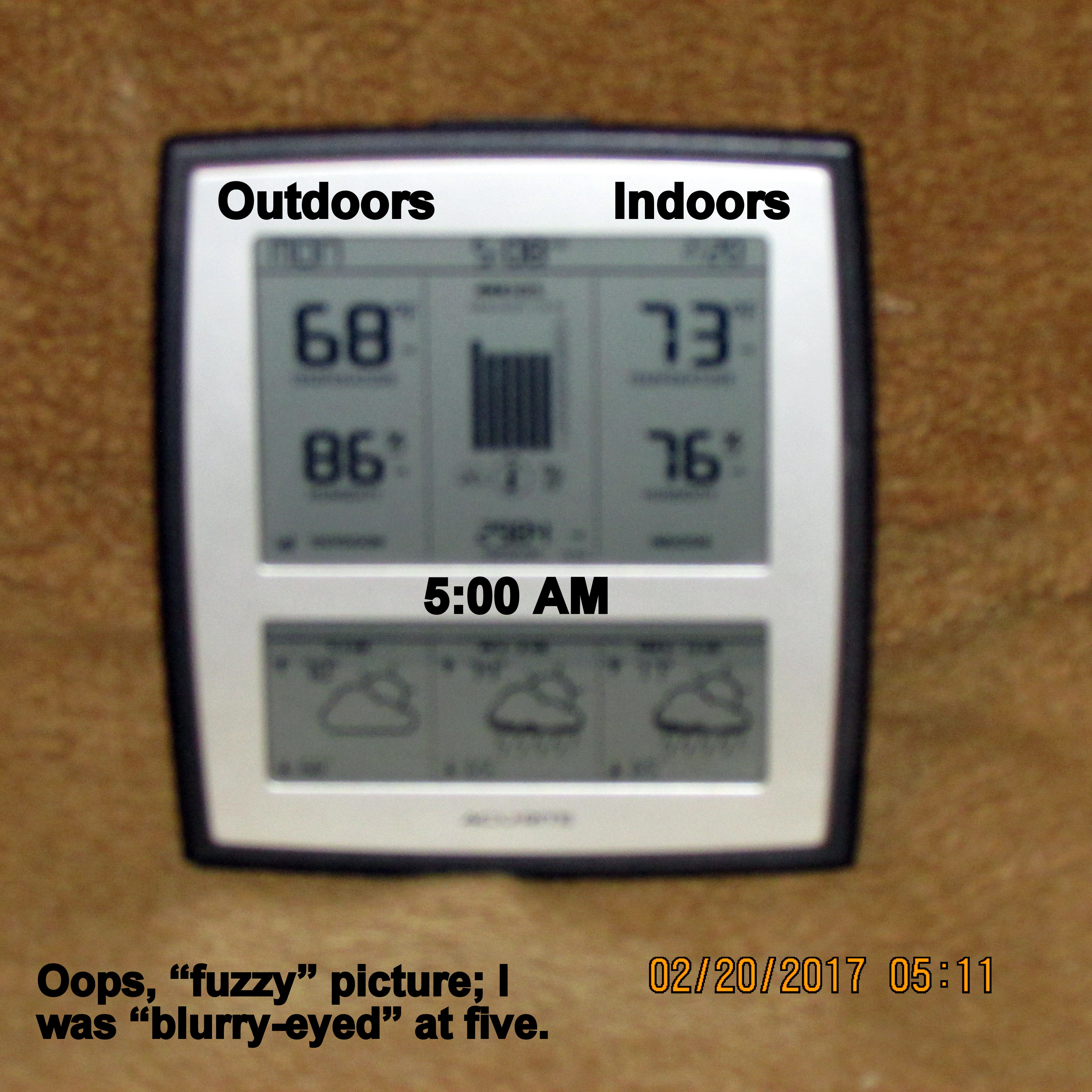 In between those hours (time and temperature)… I watched some TV weather news. The sky was an undescribable “eerie-color” that does not appear in the picture. ~~ I’m delighted to report that it appears we have escaped the wrath of the storm that moved East after so much damage in Southern California. As I write this (nine-fifteen), I’ll have more details when I watch the noon TV news.