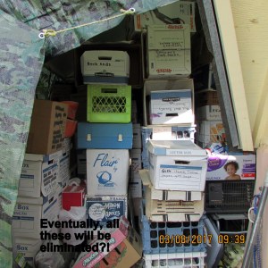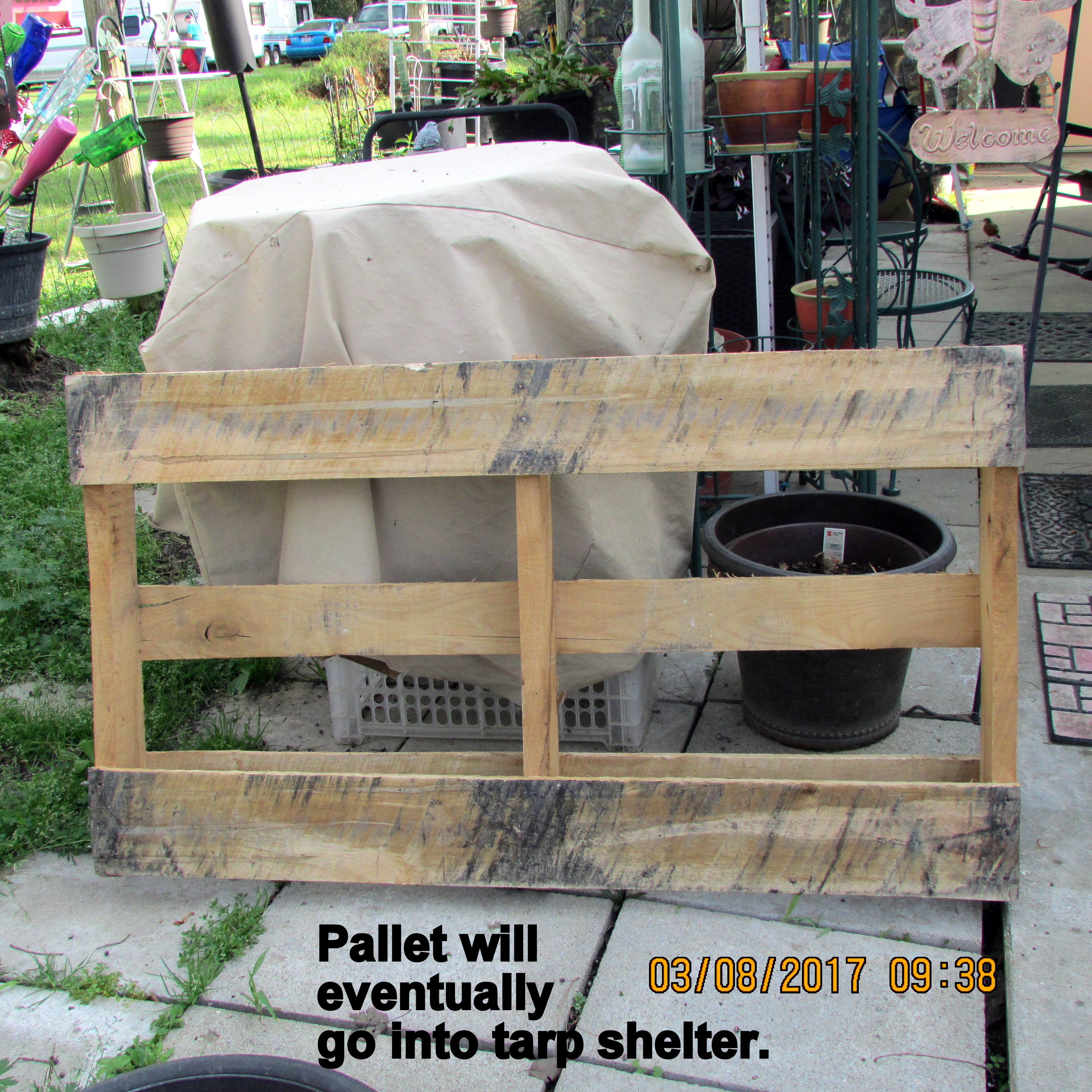 This morning, I dragged home a pallet. Remember, every time we have a hard rain, I am surrounded by “Lake Lorraine.” Many things (boxes, etc.) are elevated several inches off the ground. Eventually, the pallet will go into the tarp shelter but that is weeks (months?) away. First, I need to process all the boxes (genealogy, etc., etc.).