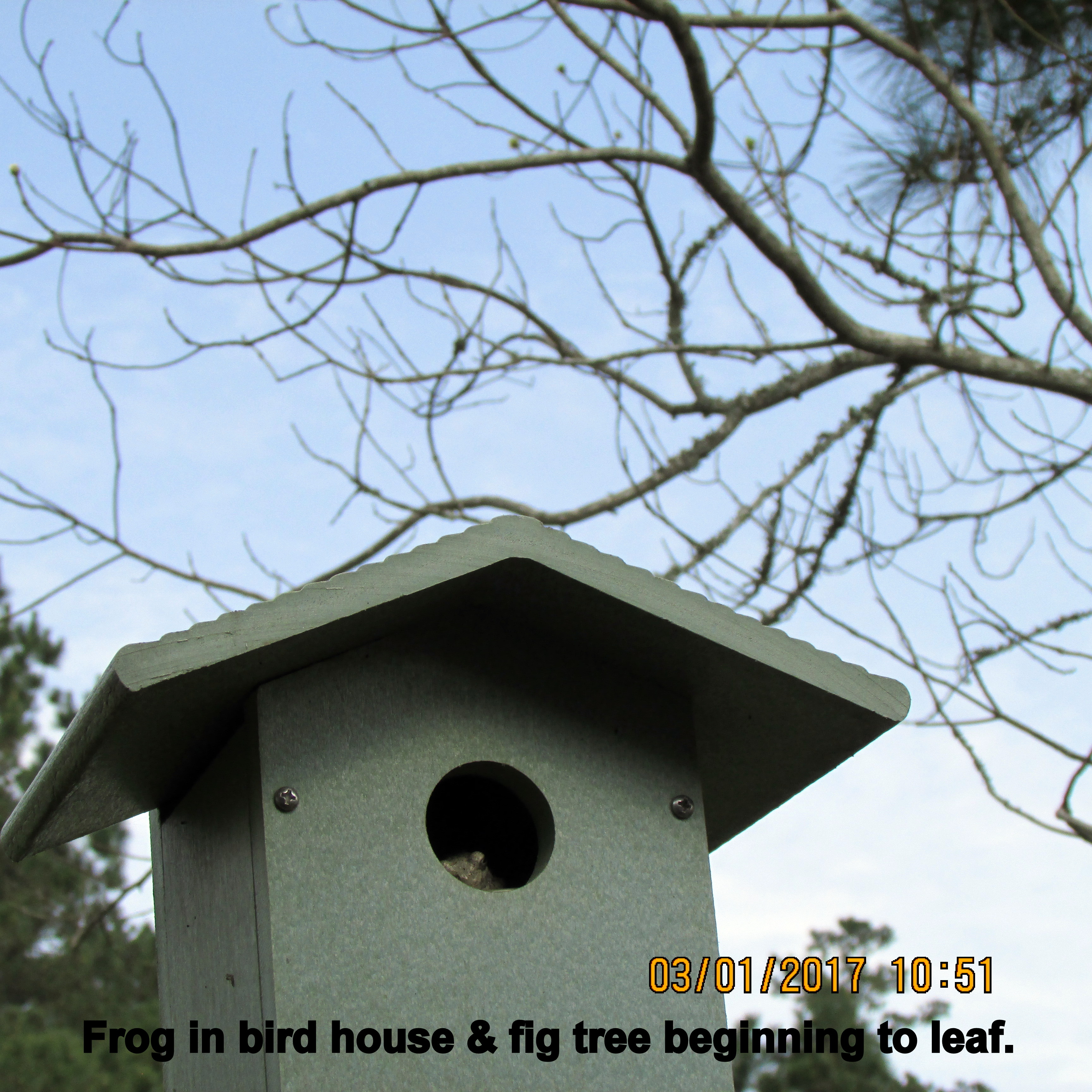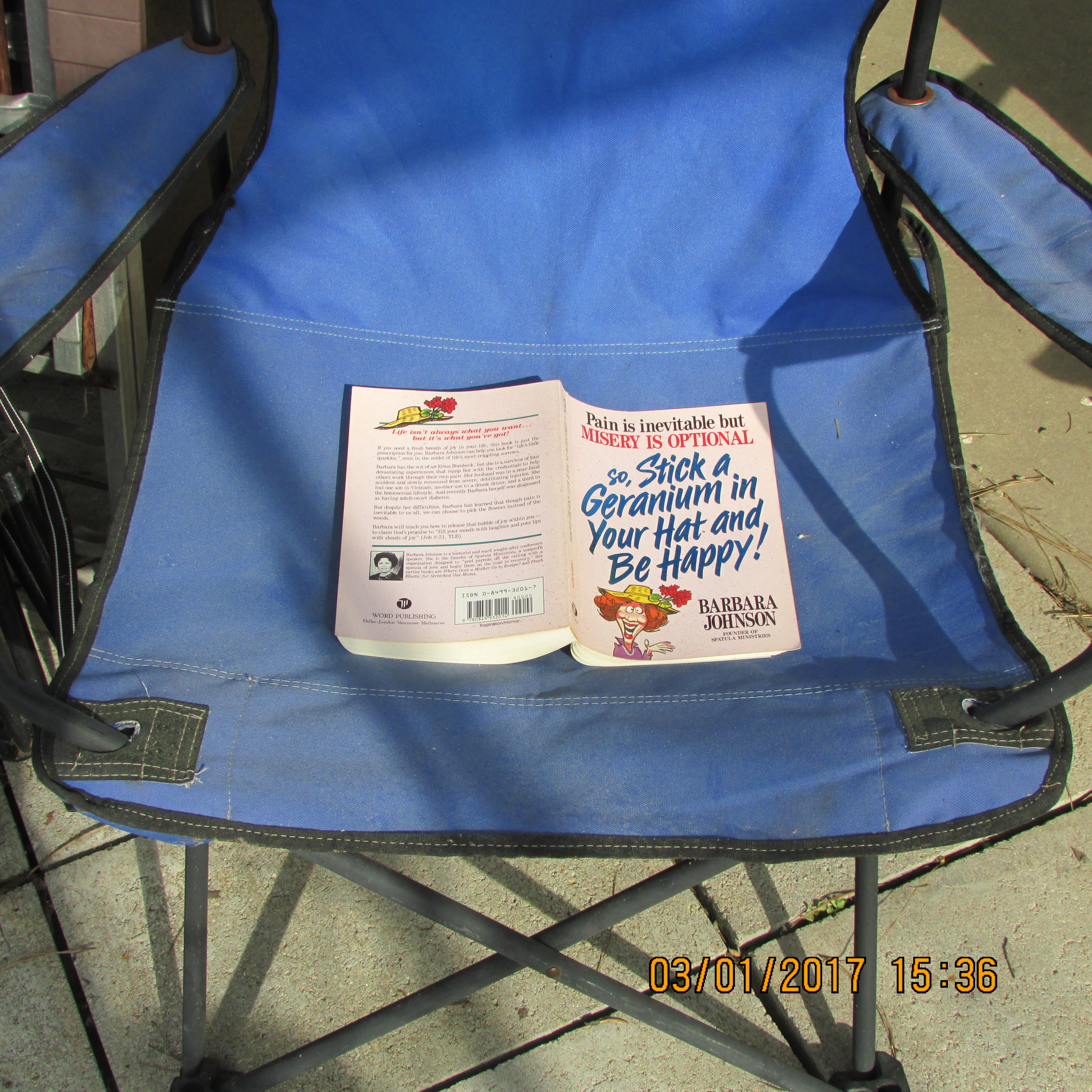 Like a magnet, the garden was pulling me. I spent the morning… and felt I made some progress. “Spring” brings weeds to pull, old leaves and pine needles to rake, patio to sweep, and plants to water. Sadly, many of my plants show no sign of recovery from the hard freeze. ~~ I sat on my patio reading Stick a Geranium in Your Hat, with an occasional eye on the Bluebirds and a squirrel on a bird feeder. Also: reminiscing about fond times with the dear friend who gave me the book, Janice Filbrun.
