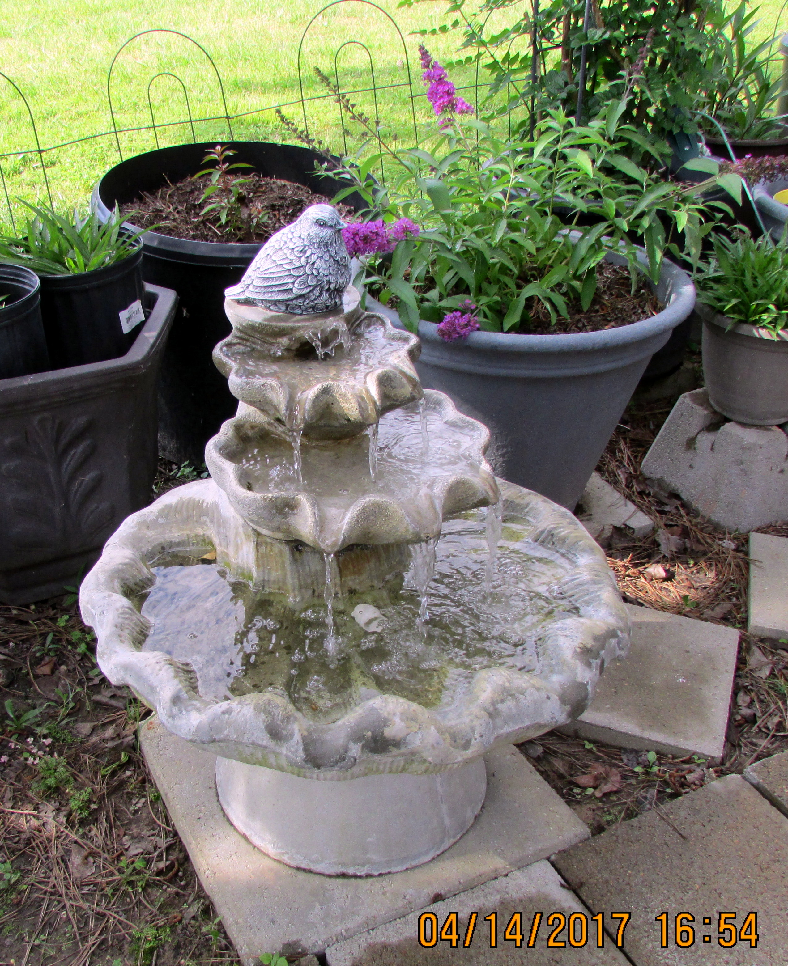 Almost the entire day working with thirty-four pages. My only accomplishment today: I installed a new pump on the fountain. I love the sound of the bubbling water and the birds and squirrels love to drink, and bath, therein. (Old pump failed two days ago. Yesterday, a special trip to Lowe’s.)