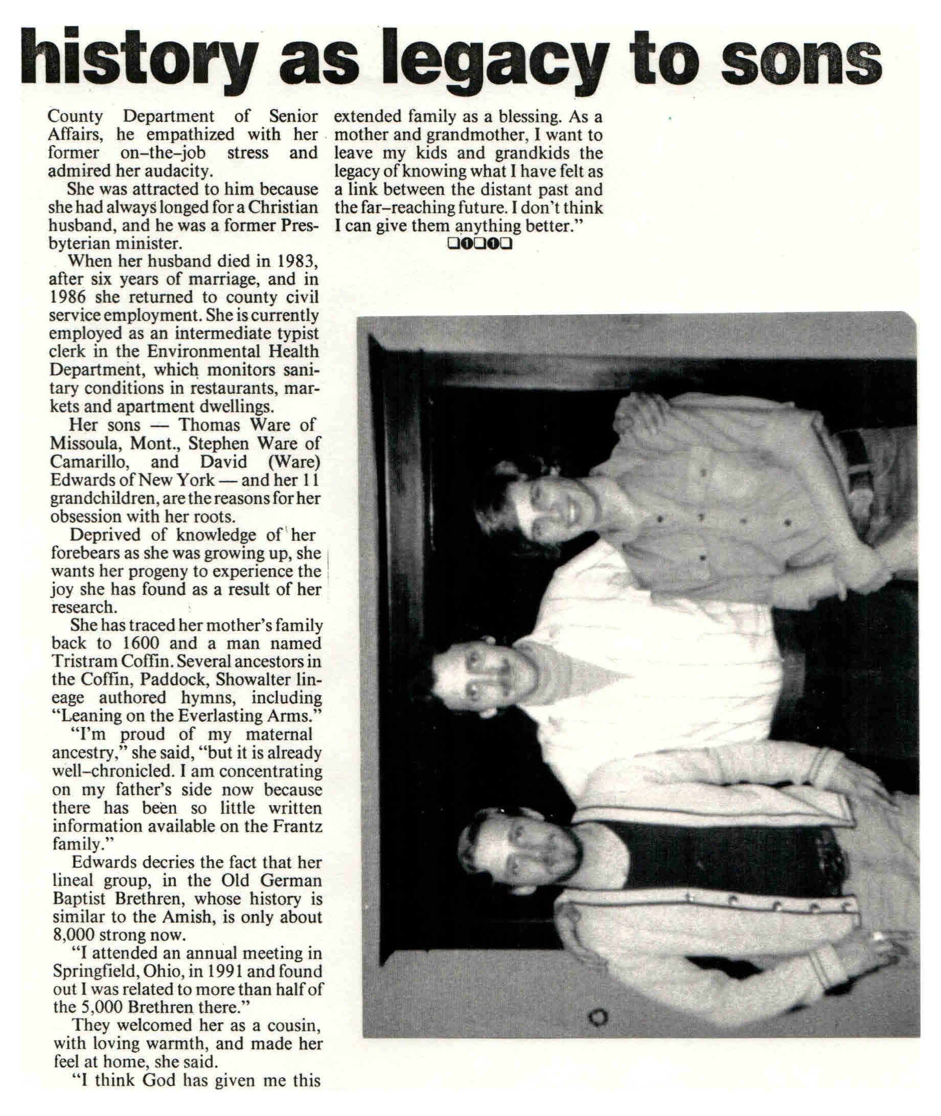 I am resolved to spend time outdoors to balance the mentally strenuous indoor project. Developing the website, organizing material previously scanned, I find that I am visiting “old friends.” Yesterday I did a Google search for a fellow genealogist who shared volumes of information with me (information yet to be scanned). Evelyn “Rosemary” Frantz has many listings on the Internet, and passed away in 2013.
