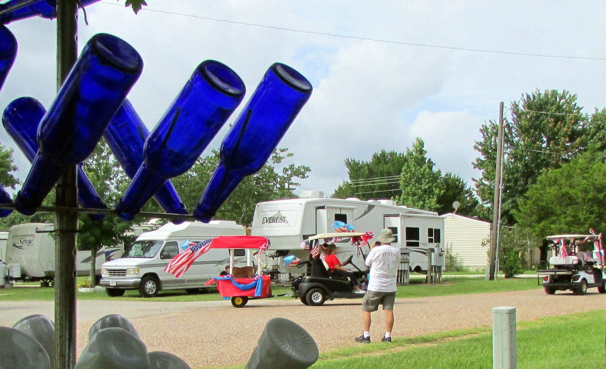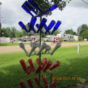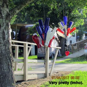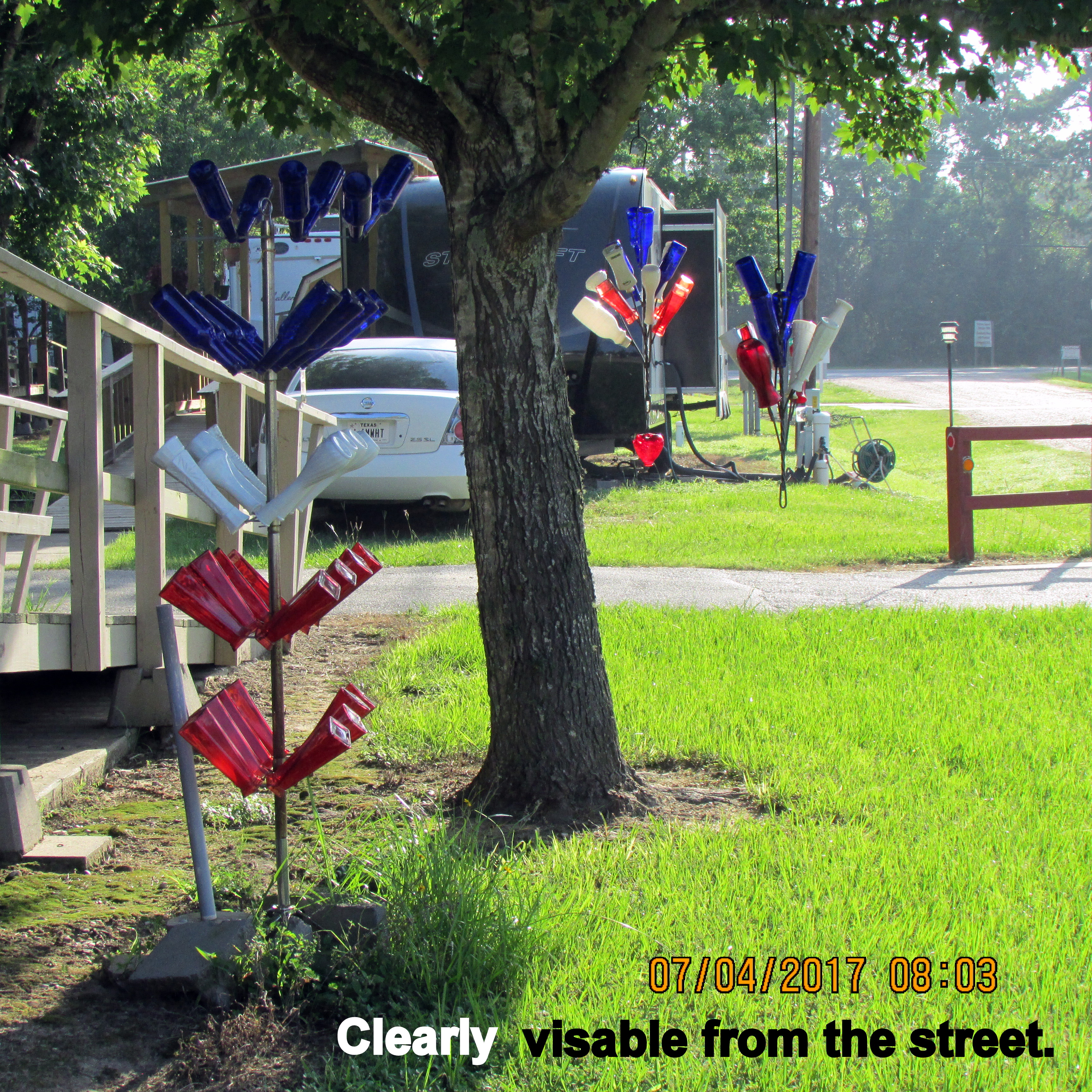 Gratefully, I had enough red vases to complete the patriotic theme on the bottle trees. (More red vases on order from Dollar Tree.) I also need more “milk glass” white vases (eventually, one-by-one, I’ll find them at the thrift shops). These… are in a neighbor’s yard–along the busy street.