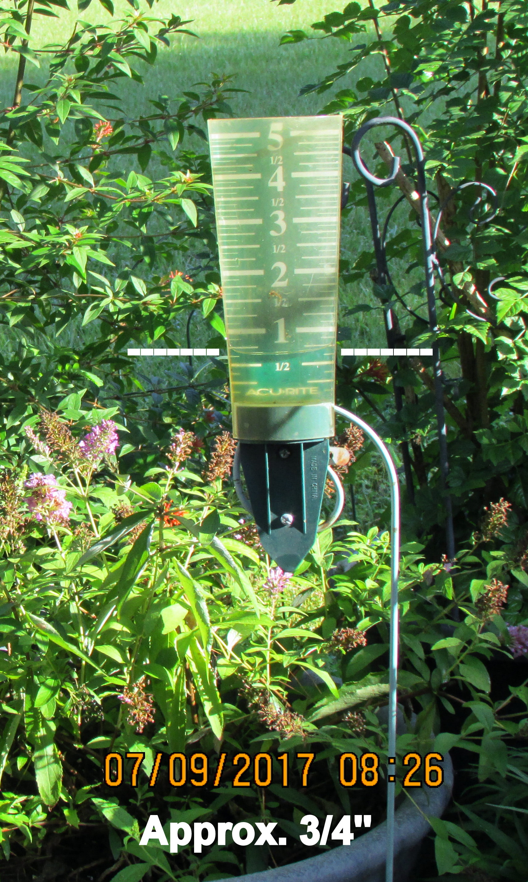 A violent storm last evening. Hard rain, seemingly unending lightning flashes!! Two strikes in our immediate area but (so far, 9:00 AM) no reported damage. Counting our blessings!! ~~ I went to bed early but was awaken by (restored power) the 10:00 PM TV news. ~~ This morning, I picked up a lot of fallen tree limbs. Approximately three-quarters inch of rain during the two-hour storm.