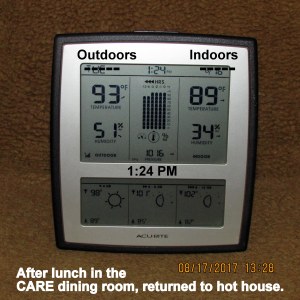 My air-conditioner has struggled the past couple of weeks. Several times a day, the A/C “pops the breaker.” I wait half-an-hour before I turn on again. Last night, at 9:30, it “popped” so I left off all night. It was a restless night as I tried to sleep in a “puddle of perspiration.” I’m not complaining; I’m just documenting in my blog/journal. Gratefully, I have a good fan–and the nearby CARE Center is cool and comfortable.