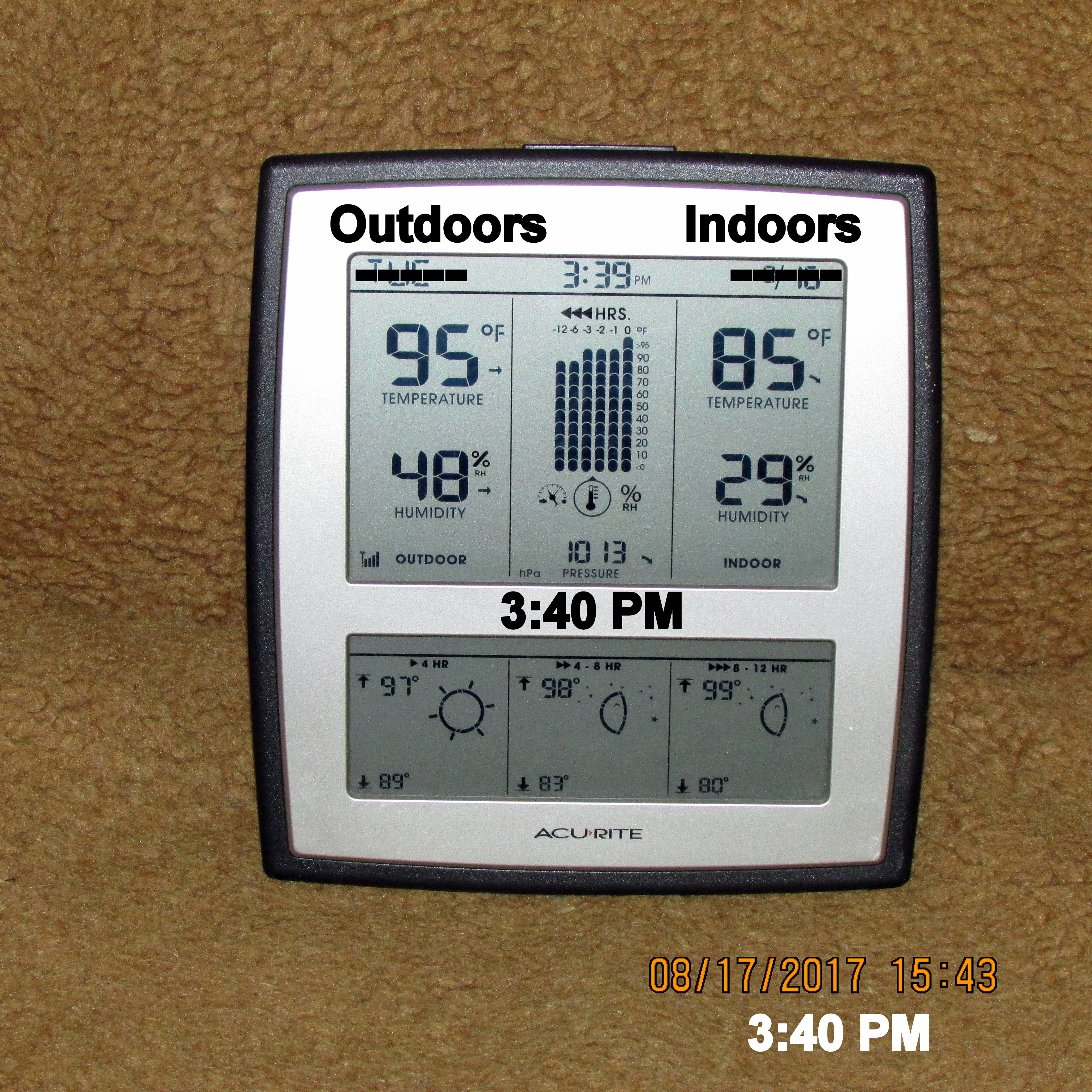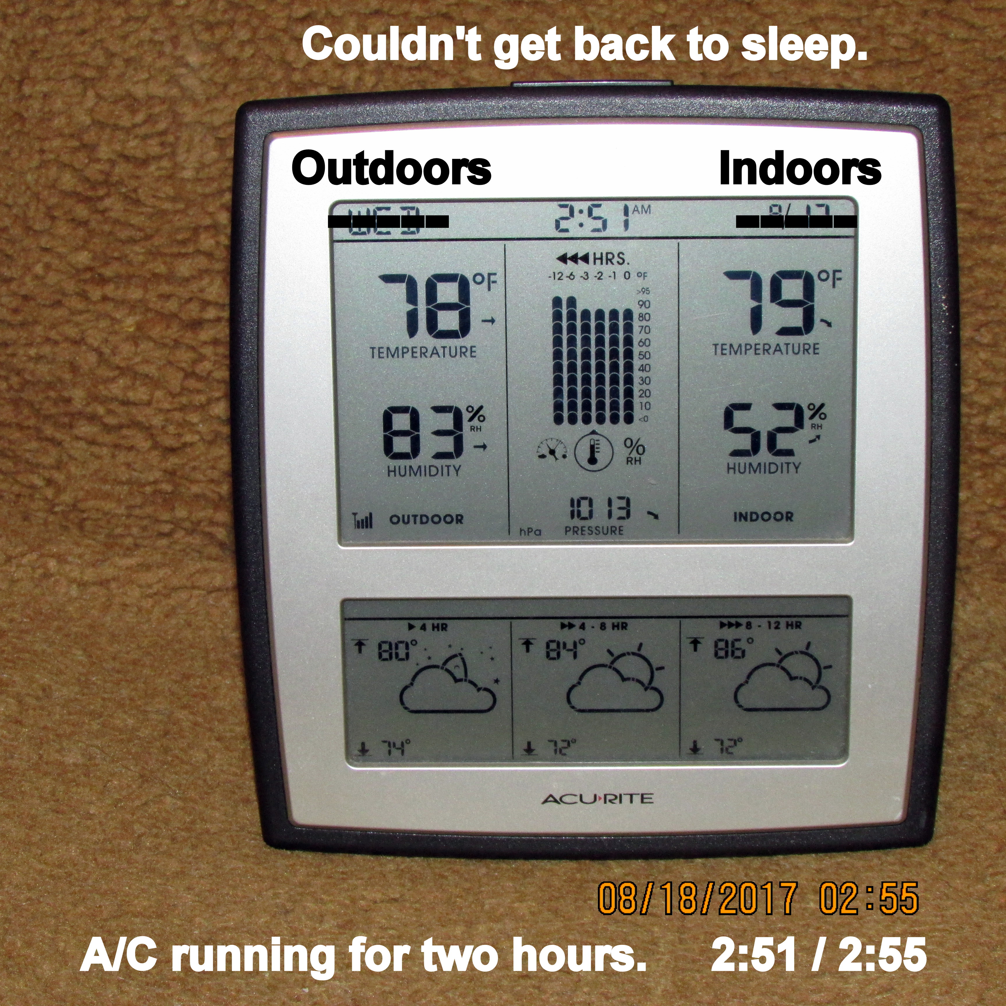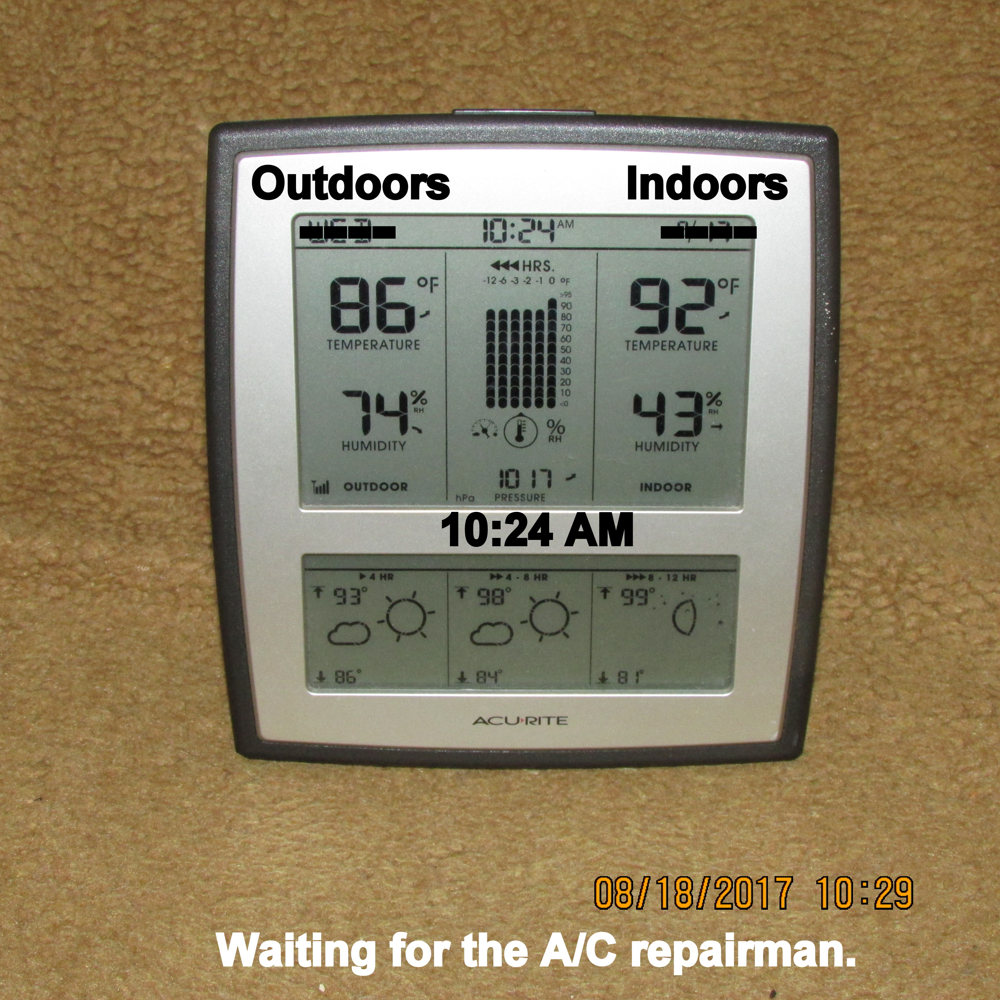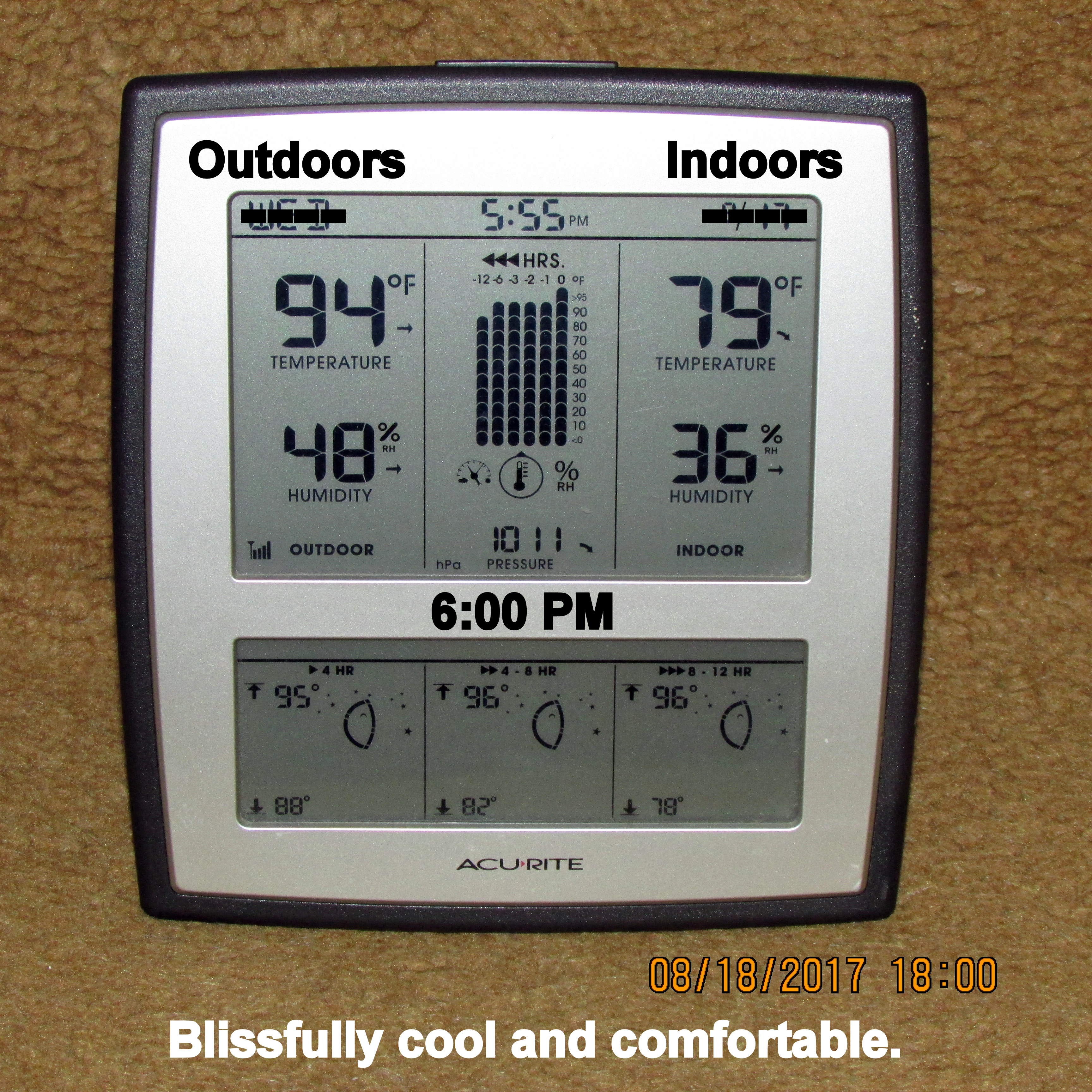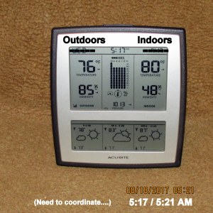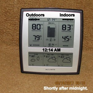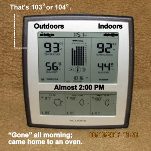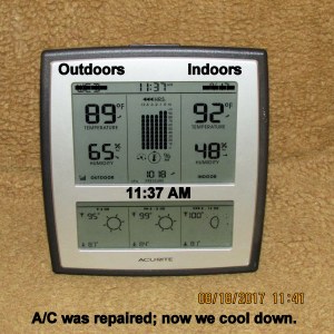 It’s an oven outdoors and indoors!! I’m so discouraged, I want to bawl!! I really believed the A/C repair had resolved the problem. I was gone all morning: Pancake breakfast, a seminar, and lunch. This is what I experienced walking across the driveway, stepping into my trailer home. Repeat: I’m so discouraged, I want to bawl!!