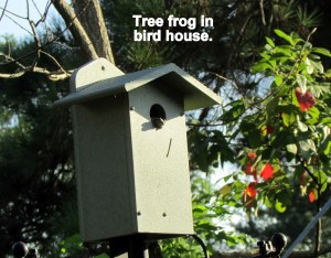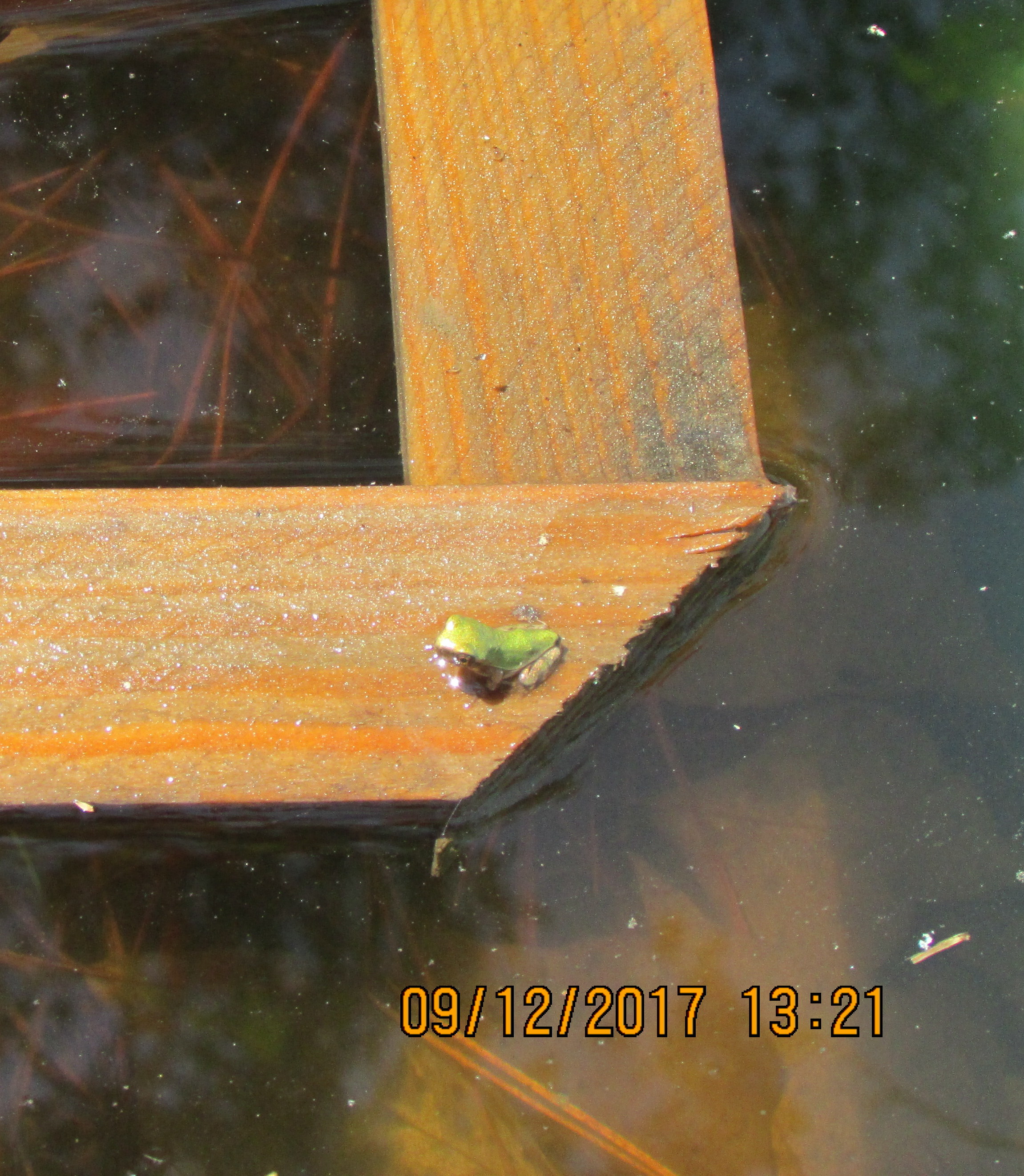 Unable to photograph but I see tadpoles with tail and hind legs; baby frogs.