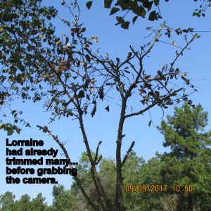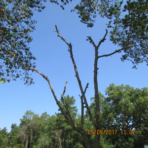 To the left, Bluejack Oak several days ago. I’ve been “nursing” him for several weeks. Today (for no particular reason) I decided to trim limbs back to “bare” in hopes of a healthy start next Spring. I was forcing myself to work in my “yarden” versus watching television news of pending storm Hurricane Irma. I get so “blue” (depressed) thinking of displaced families, and devastation, in the wake of the disaster.