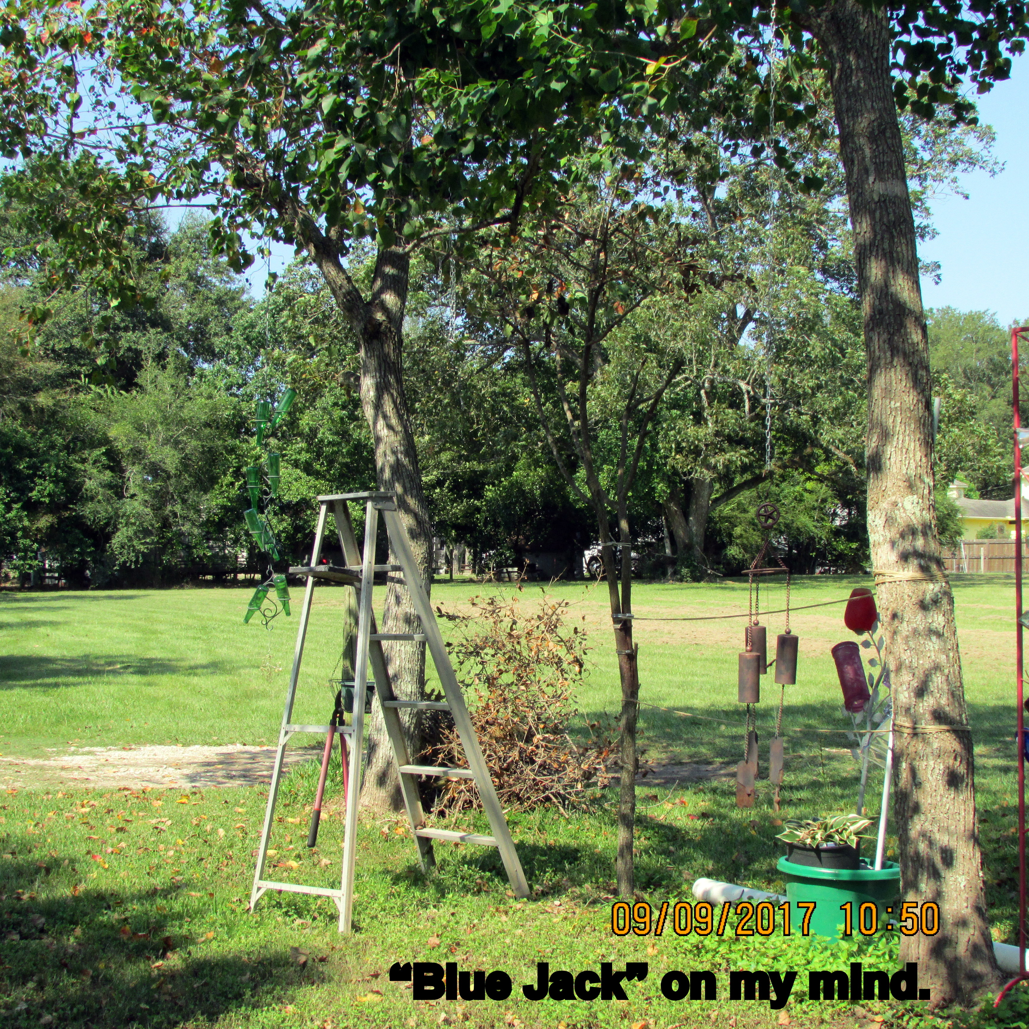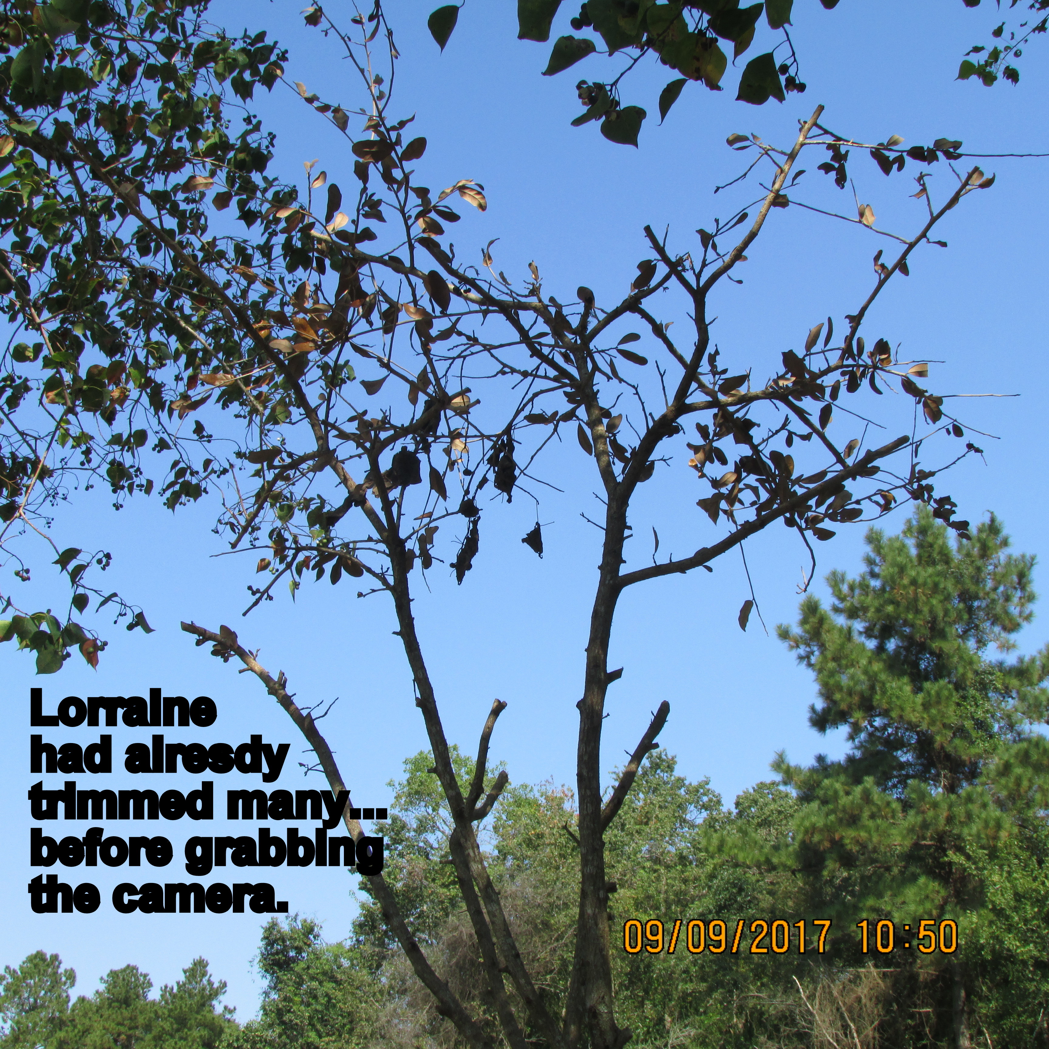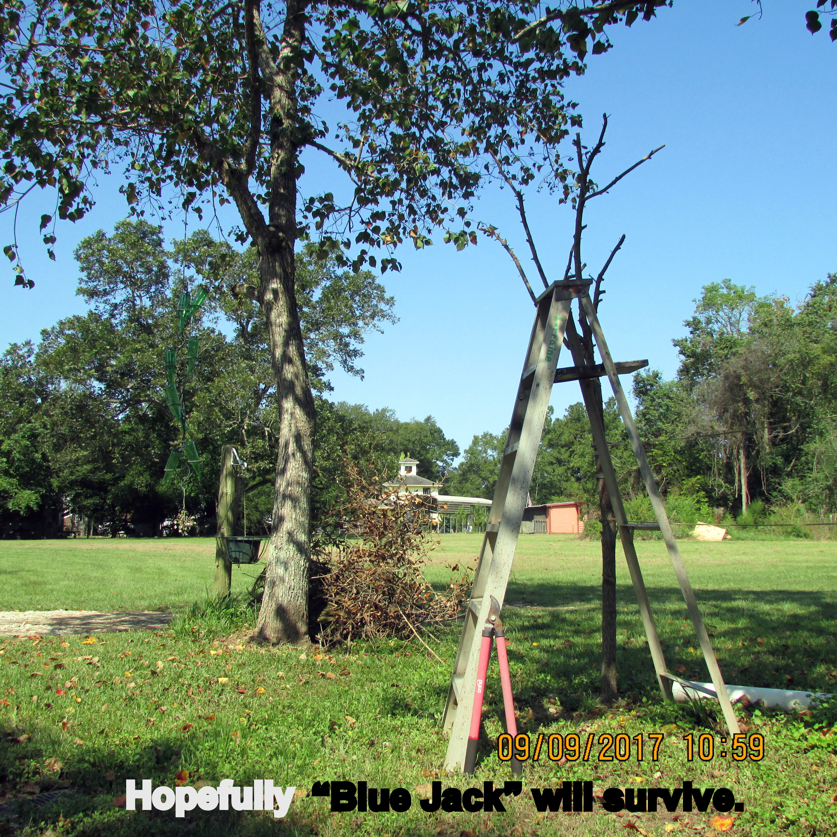 To the left, Bluejack Oak several days ago. I’ve been “nursing” him for several weeks. Today (for no particular reason) I decided to trim limbs back to “bare” in hopes of a healthy start next Spring. I was forcing myself to work in my “yarden” versus watching television news of pending storm Hurricane Irma. I get so “blue” (depressed) thinking of displaced families, and devastation, in the wake of the disaster.