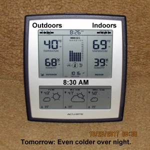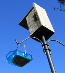 I dashed outdoors to get the feeder, and mealworms, despite the temperature. Last night was our coldest since last January. My furnace was not functioning!! I was cold under a mountain of blankets!! Then, gratefully, I remembered the “heat strip” installed (fifteen months ago) in the new air-conditioner. Pressed into service for the first time, the heat strip operated, and warmed my trailer home.