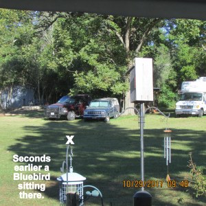 Due to our extreme Summer temperatures, the Bluebirds presumably flew North. This morning, I was so thrilled to see a beautiful male sitting on the post. Such a welcome sight!! I rushed out to my storage building for the feeder and mealworms. I’m waiting to see him/them on the feeder.