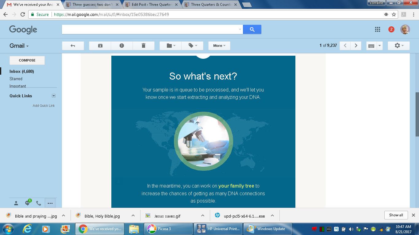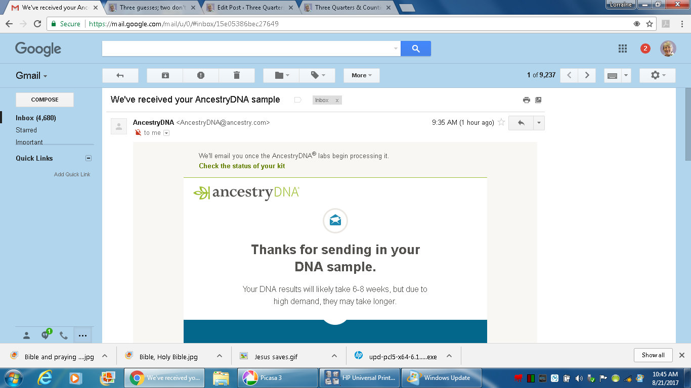 Individually, click the three pictures (below) to enlarge. They are an image of the email notification, from Ancestry, saying my DNA sample received.