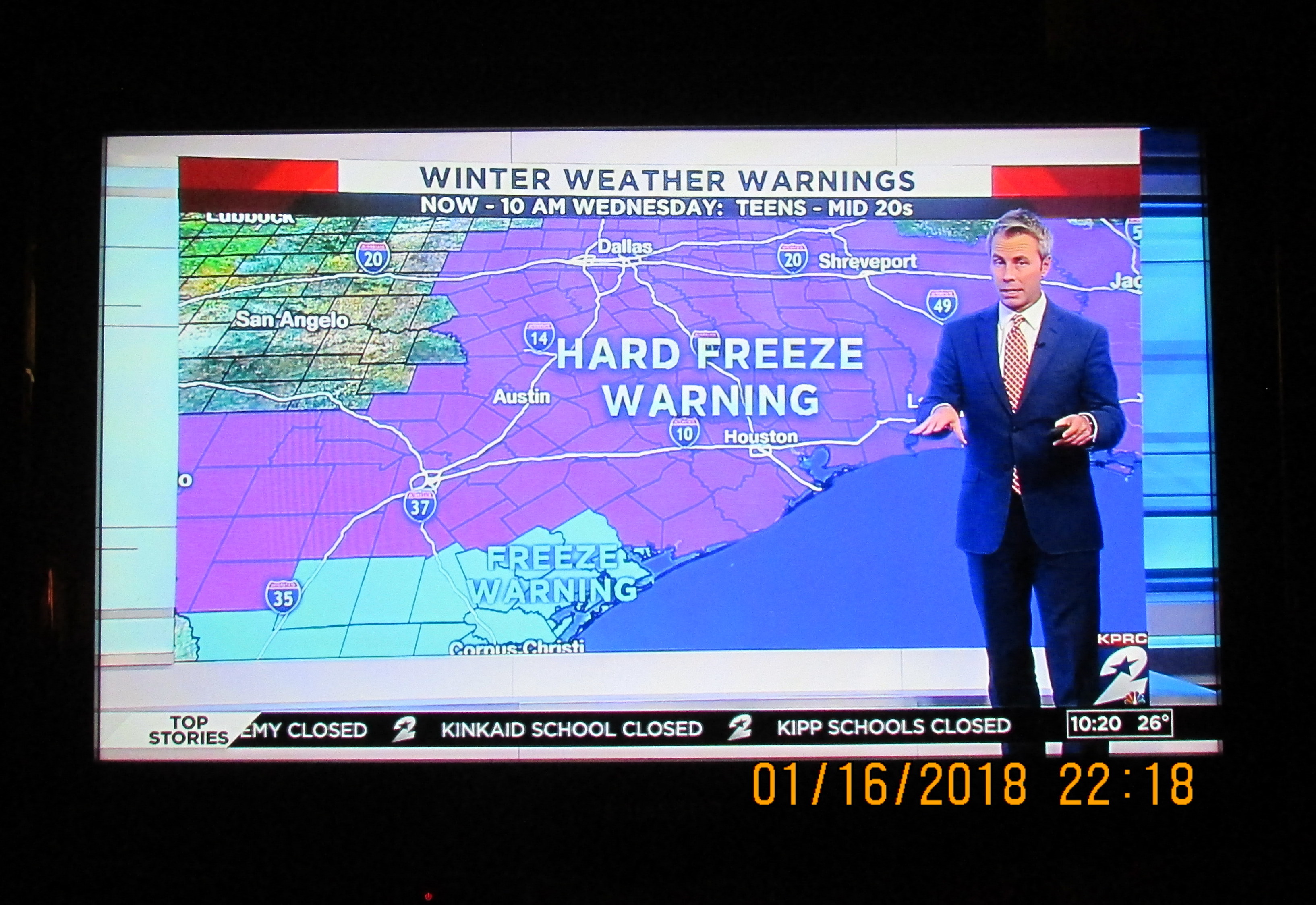 Oh no, my water is frozen!! I was preoccupied with blog messages and did not have a trickle from the faucet. This is not good!! Our freezing temperature is due to continue for another thirty-six to forty-eight hours. This is Tuesday at seven PM. It never occurred to me to use precaution during the day. ~~ Complacent; taking things for granted. ~~ Because my trailer is parked under a roof, my handyman, Jim, did not think my hose would freeze. Ironically, “electric” wrap for water hose is unavailable in the jumble of stuff in the cargo trailer.