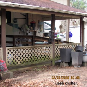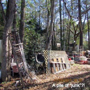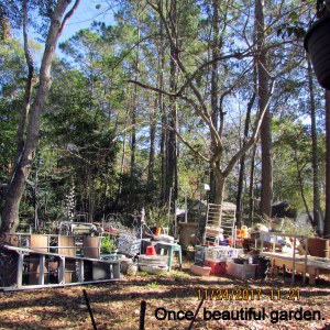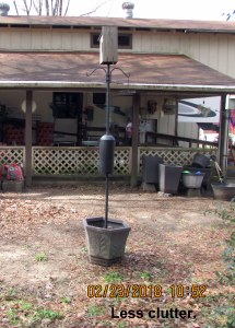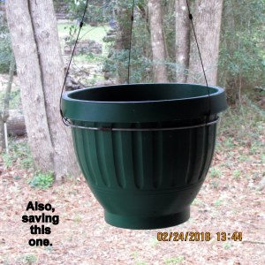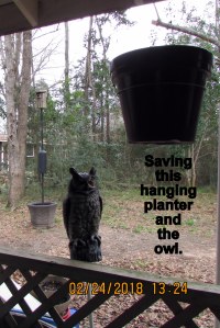 Earlier, I worked under the carport arranging, and rearranging, yard sale items. I confess to “saving” a few items “in case I need them.” I may want the owl to protect a veggie garden? (I’m seriously considering veggies in my Garden Tower.) Perhaps I’ll use the hanging planters?