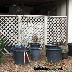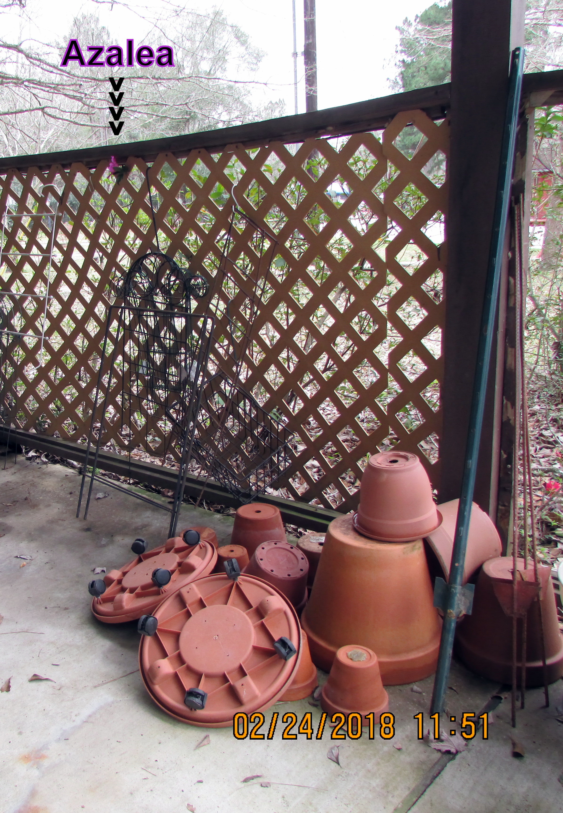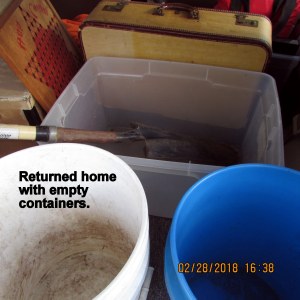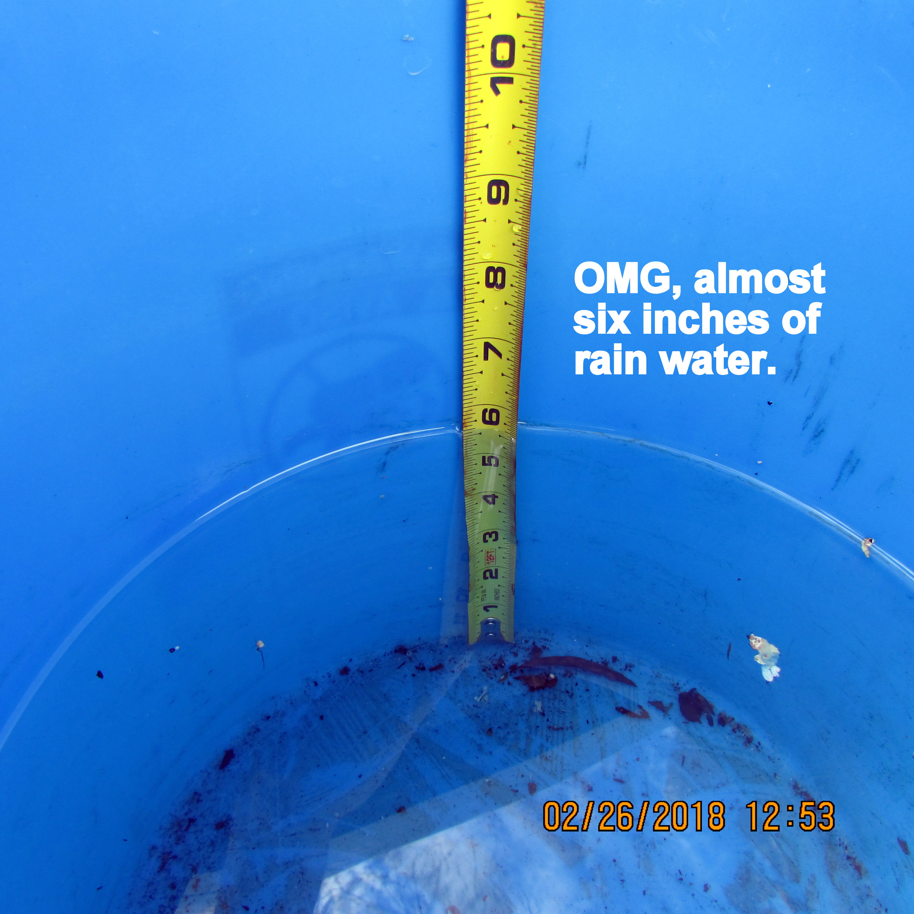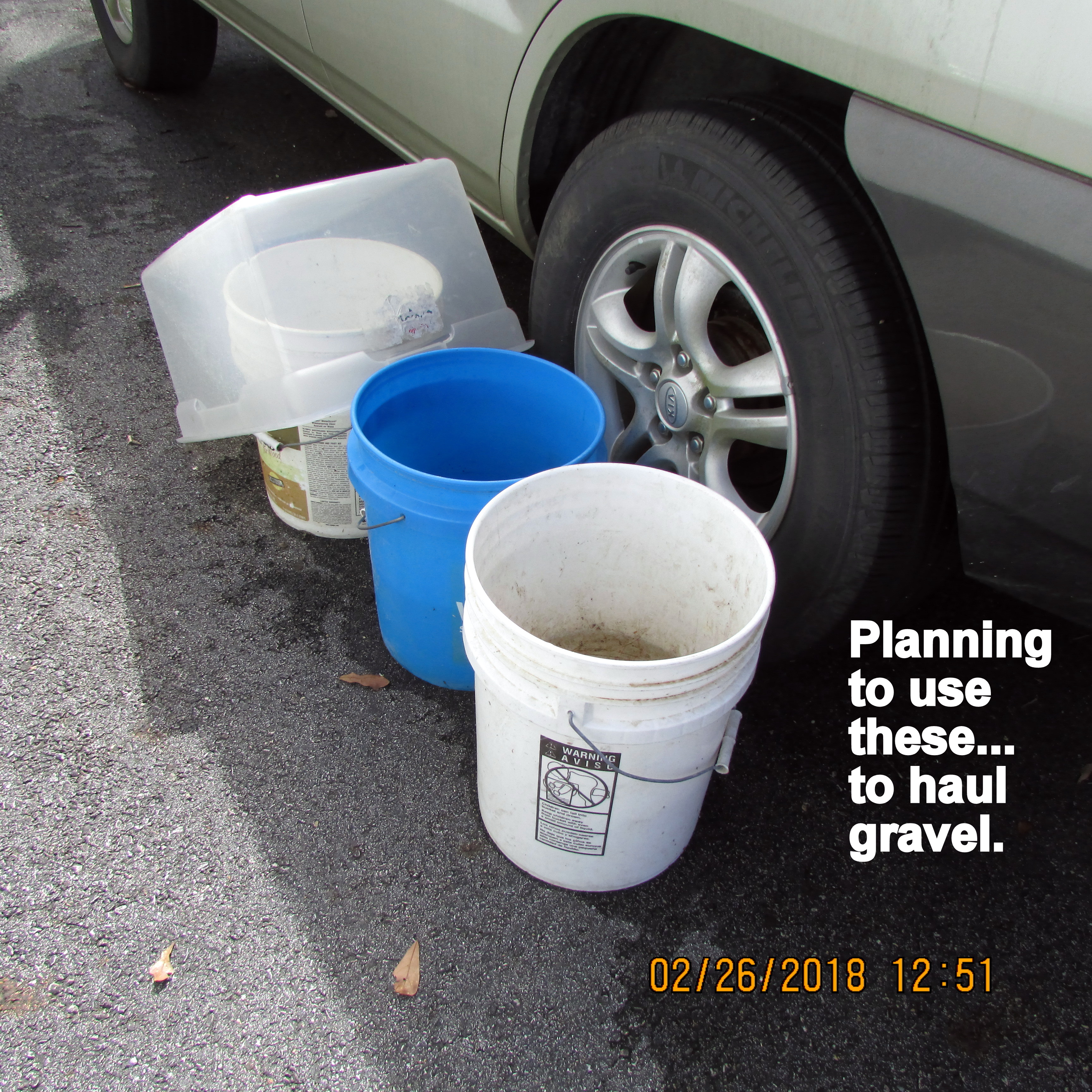 From the amount of water in this pail, apparently we had almost six inches of rain the past couple of days. The containers were/are sitting near back of my KIA in preparation for a trip to retailer selling sand and gravel (for the cement blocks walkway project).