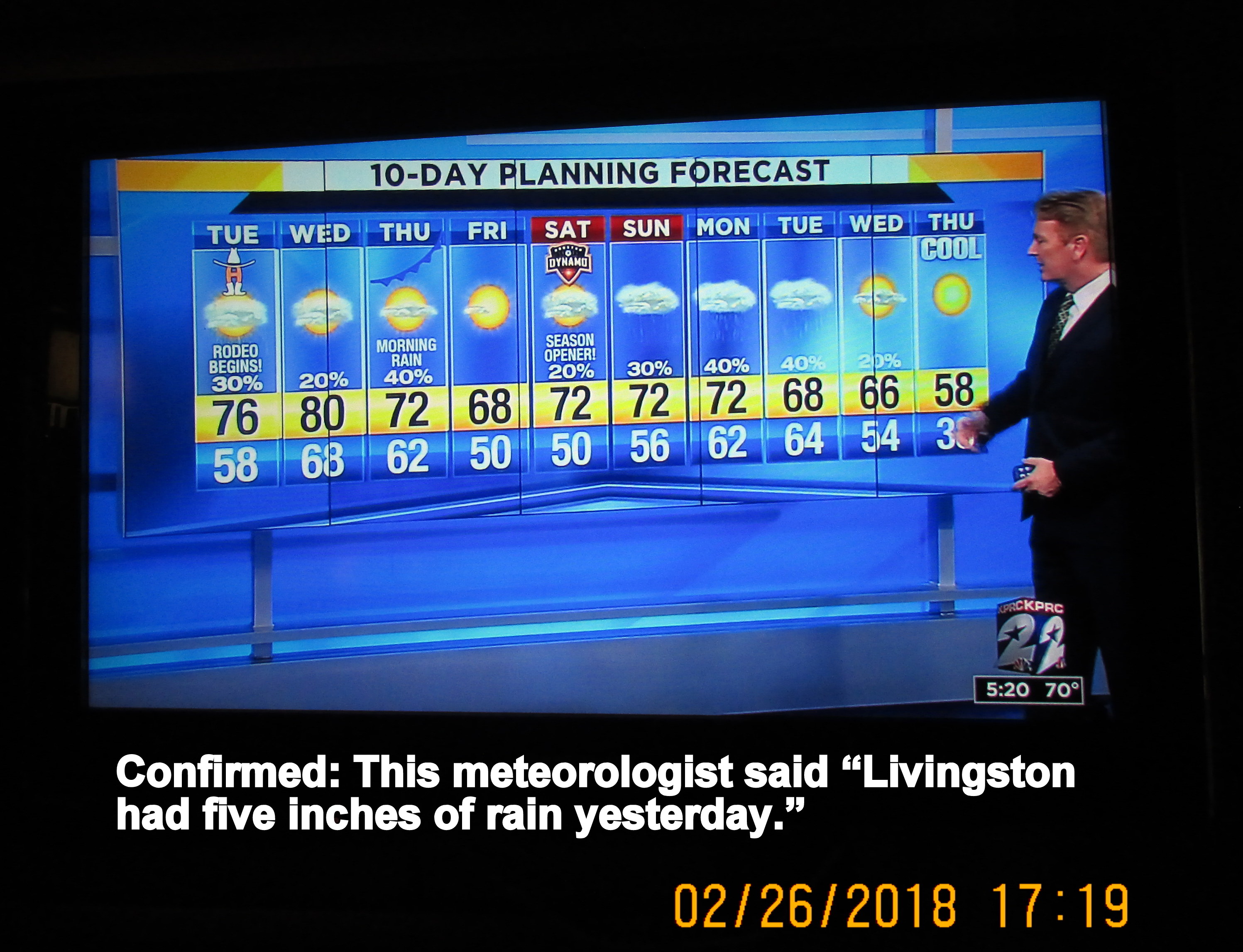 That’s an exact quote by the Houston NBC-TV meteorologist just before 7:00 AM.