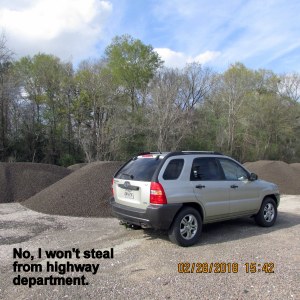 Yours truly did not want to pay big bucks, at Lowe’s, for coarse sand or fine gravel (for cement block walkway project). A reasonably reliable source gave me specific directions to an independent retailer. Miles from my home in Polk County, I drove through Liberty County into Hardin County. Thirty miles from home and forty minutes into the trip, I turned around at a highway department gravel site (and I did not “help myself” to their property). I never saw a sign for a retailer!! In total: Fifty-nine miles and one-hour-thirty-five minutes trip. True story: In the four-plus years I’ve lived in Livingston, Texas, I have NEVER ventured this far, nor this long, from home. (Lengthy shopping trips are an exception, of course. I mean an hour, or more, random driving.)