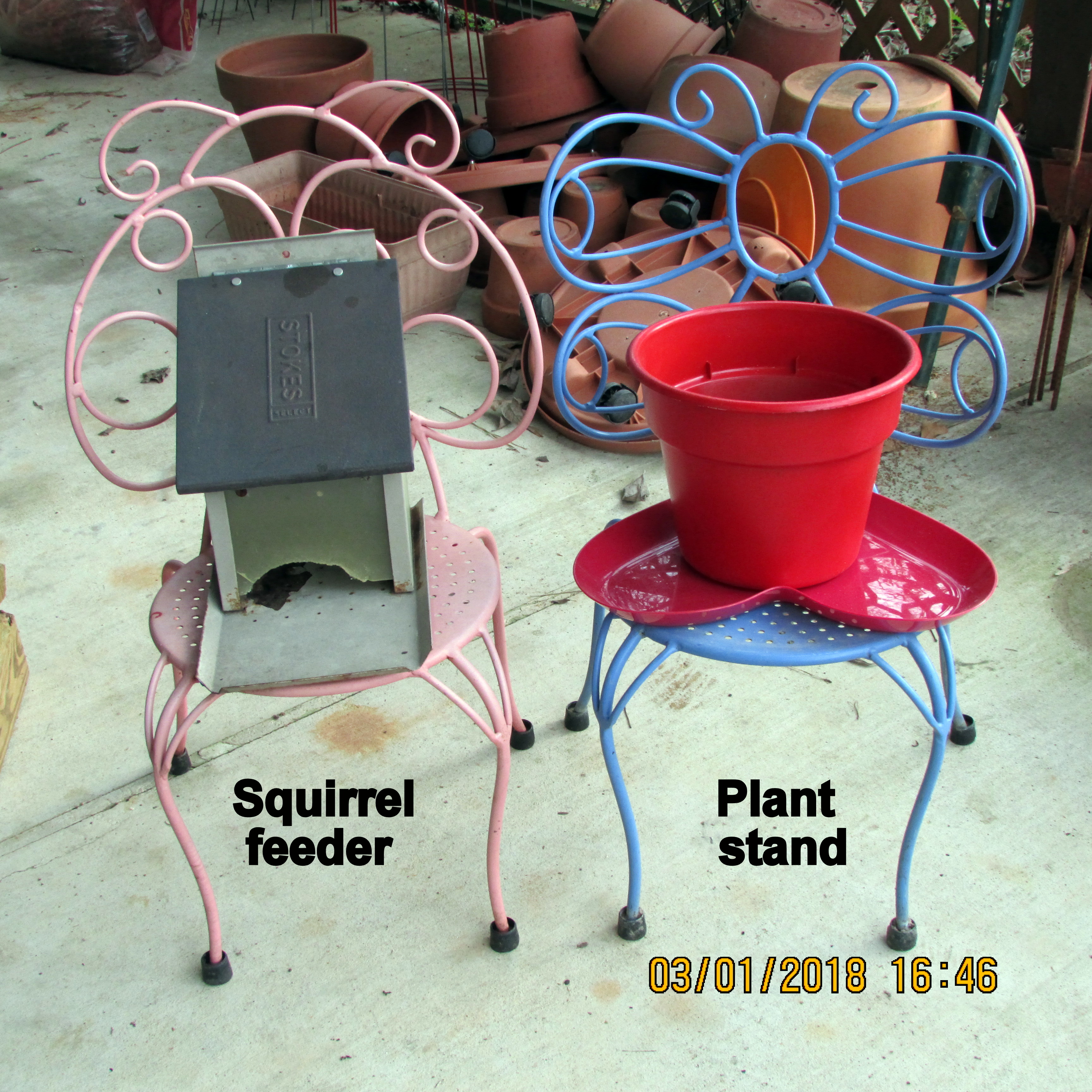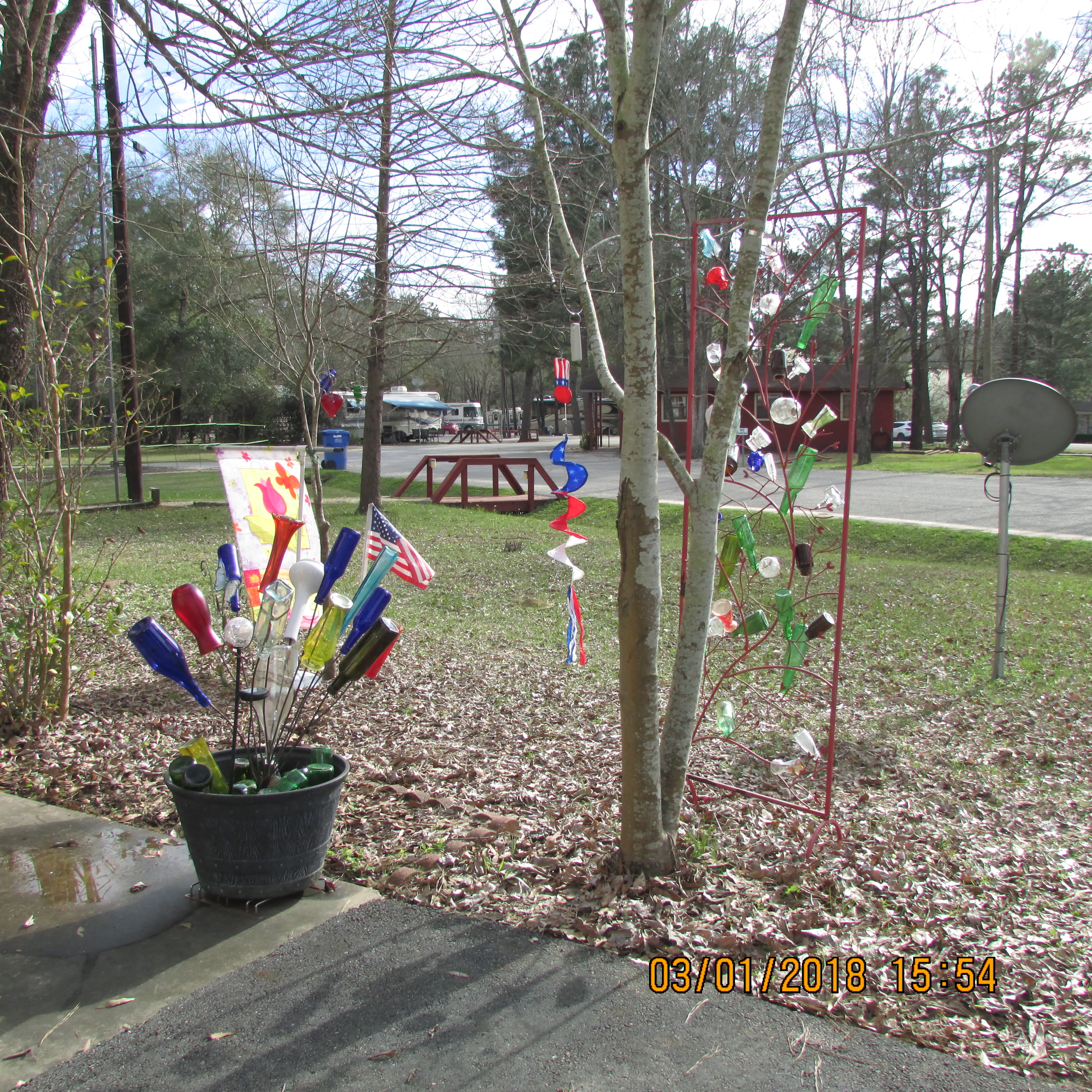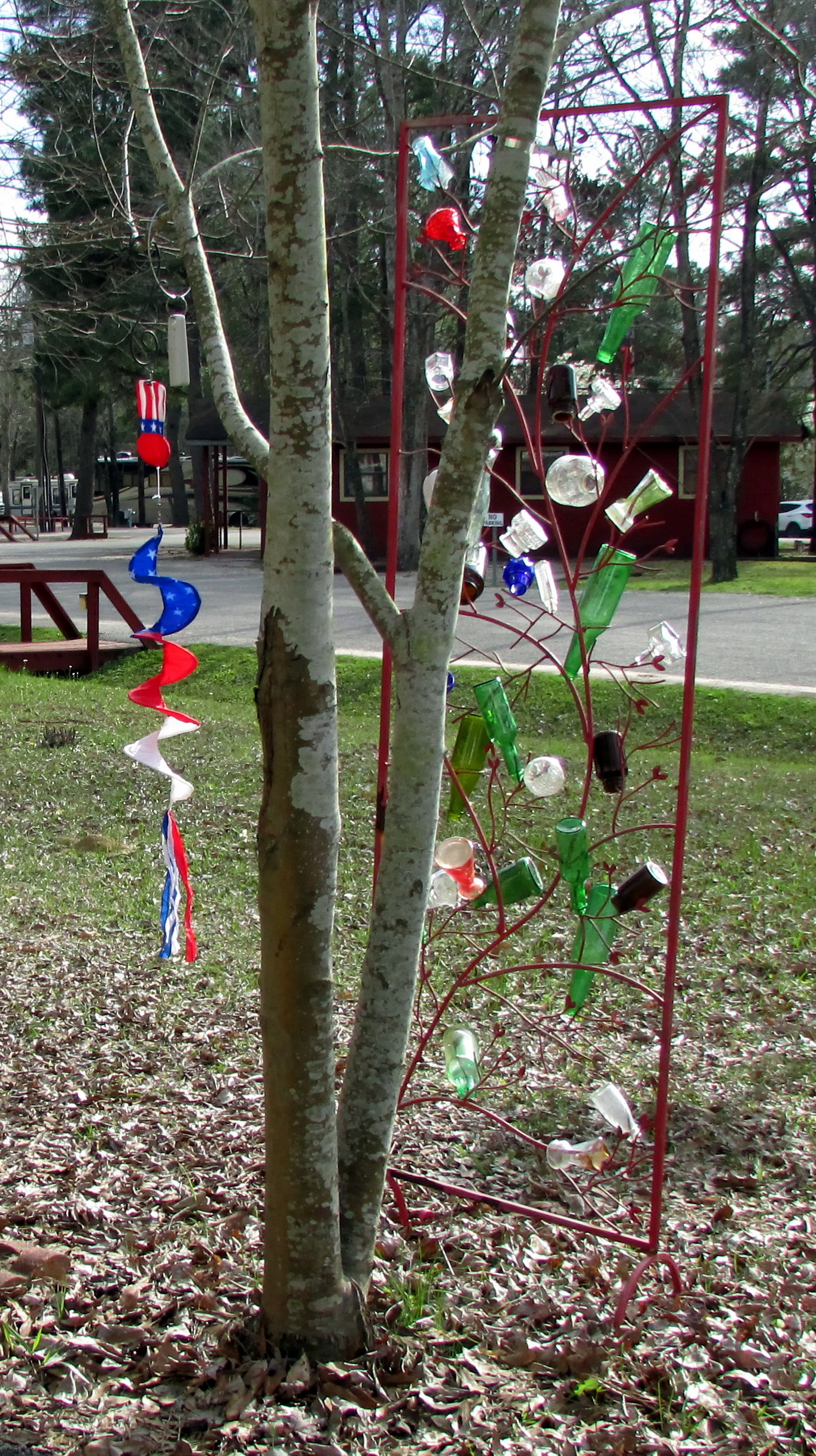 The small bottles, etc., were removed from their hiding place in the cargo trailer and attached to the framework. I’ll put a price tag on the item but speculate Lorraine may be the only person who sees beauty in her “art work.” OMG, so many out-of-the-ordinary yard items!