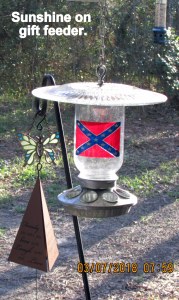 As previously stated, I am obsessive-compulsive. Here is another “through the window” (from my easy chair) picture. You won’t find that bird feeder in retail stores because it’s the craftsmanship of a woman with imagination. A gift to Lorraine because she (it) is “for the birds” (lol). The seed is rapidly consumed from this feeder so sunshine on empty glass feeder caught my attention.