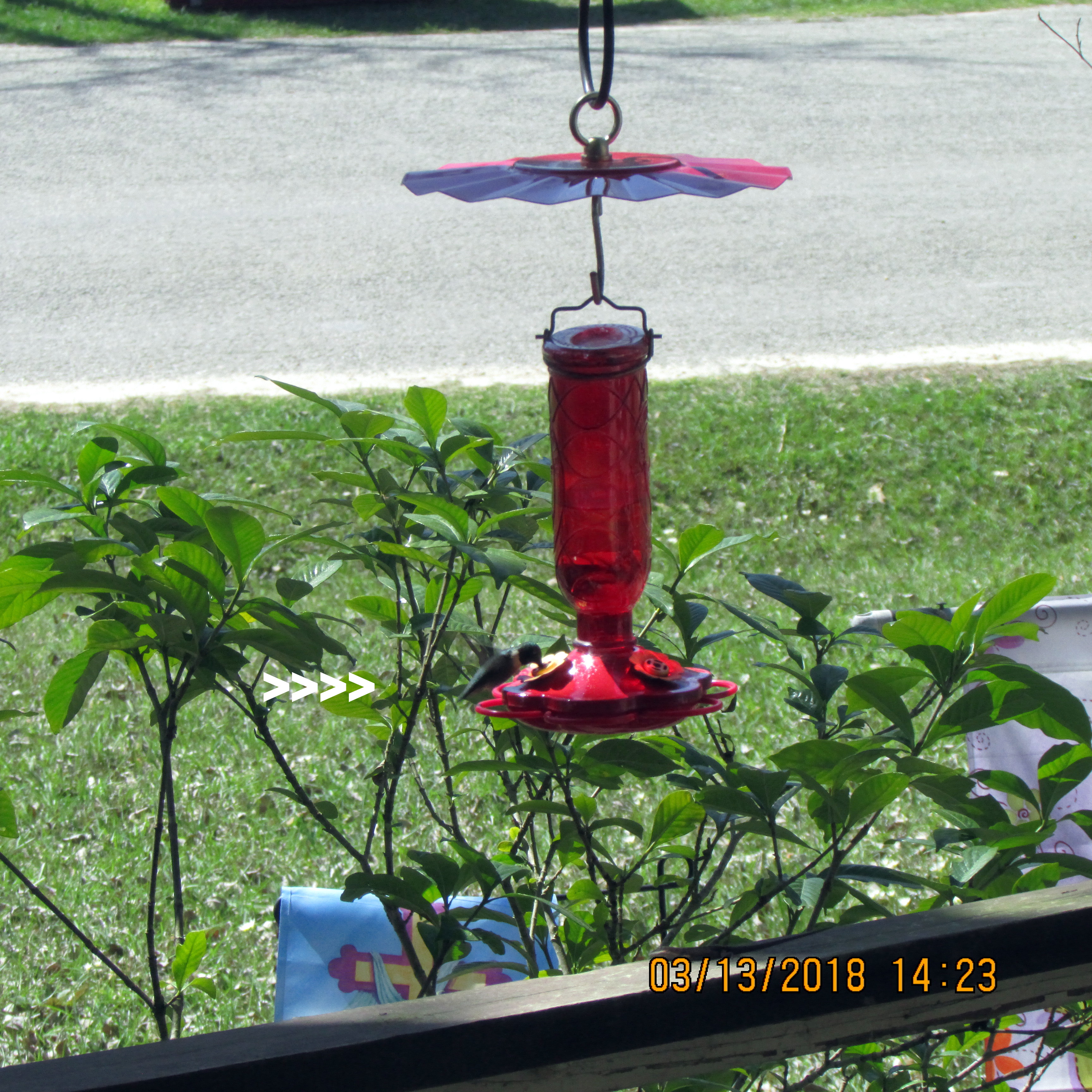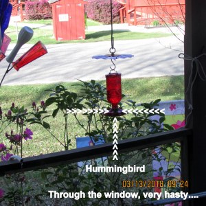 Click the picture for large view and then place the “plus” mark between the white arrows. Not a prize-winning photo but documentation that a Hummingbird found the feeder in less than twenty hours.