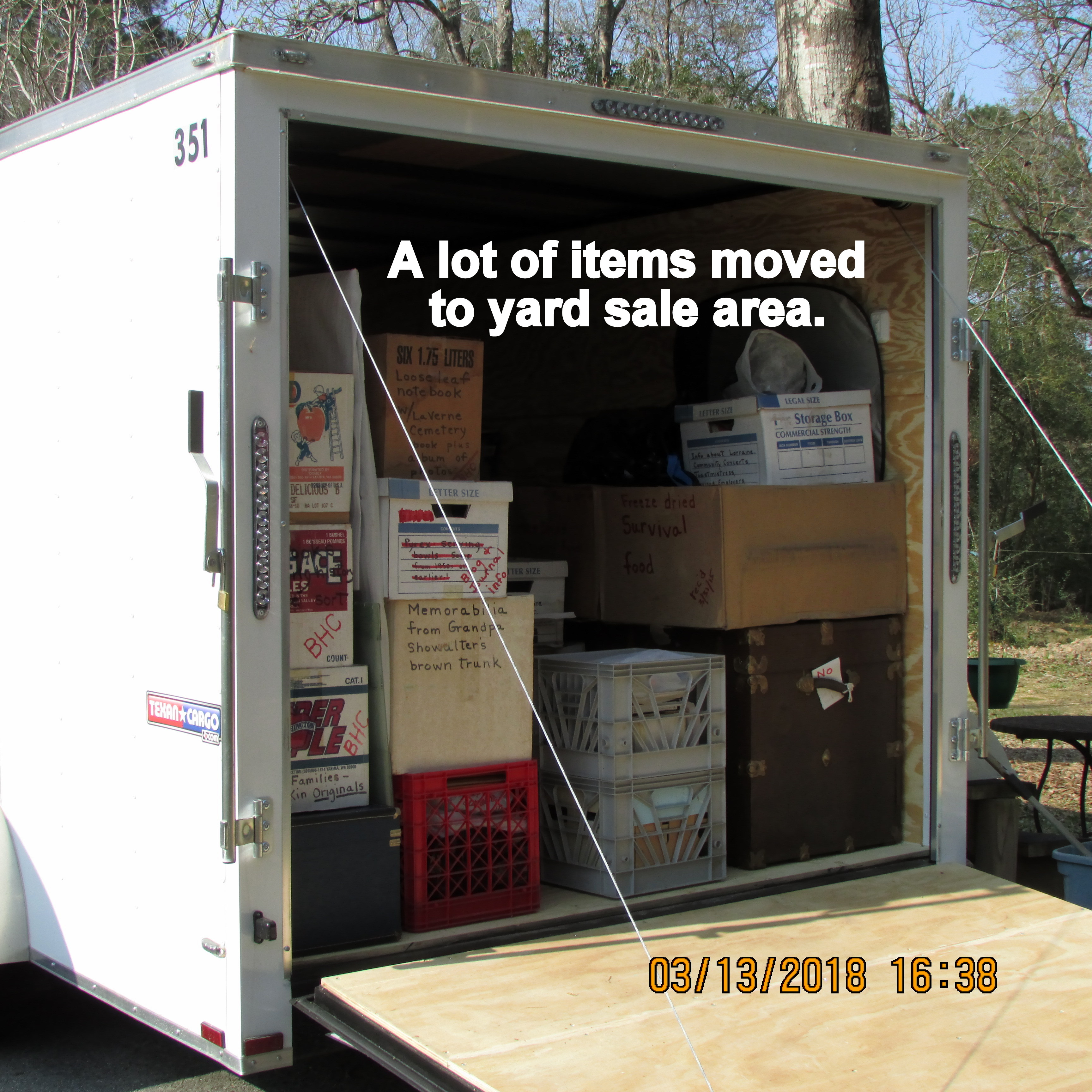 Tackle trailer Tuesday Mar13 by Lorraine Frantz Edwards . Before the yard sale, I need to shift around a lot more items in the cargo trailer. More things will be offered for sale. ~~ Correction: First time I’ve opened the “cargo” door. ~~ Busy day, lots accomplished (but nothing major to brag about.) Share this: Click to share on X (Opens in new window) X Click to share on Facebook (Opens in new window) Facebook Like Loading...