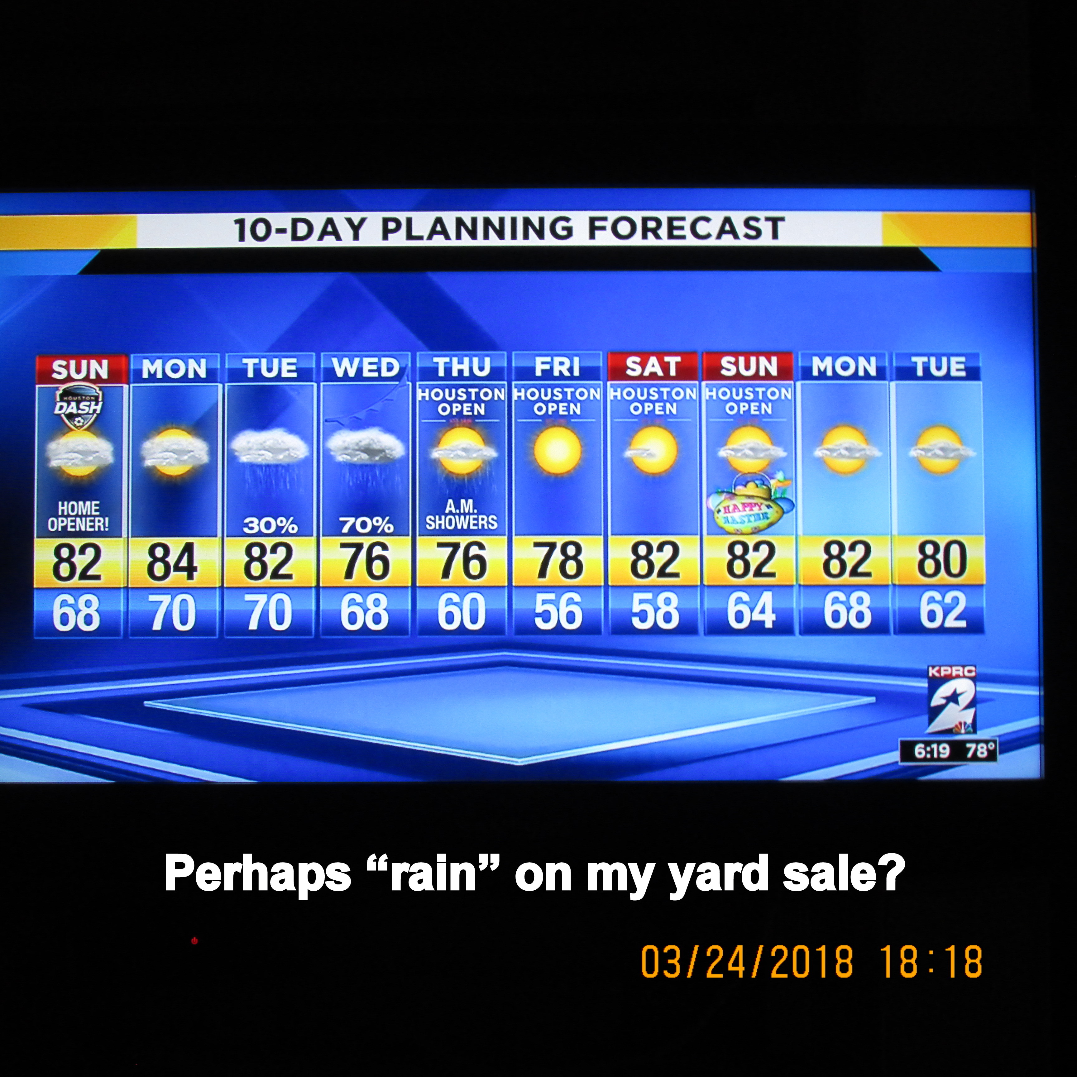 Where did the day go? ~~ I can document that most of the items are “priced” and I’m “almost” ready for the yard sale. ~~ Neighbors caution the weather may “put a damper” on my sale. ~~ Cereal for supper!!