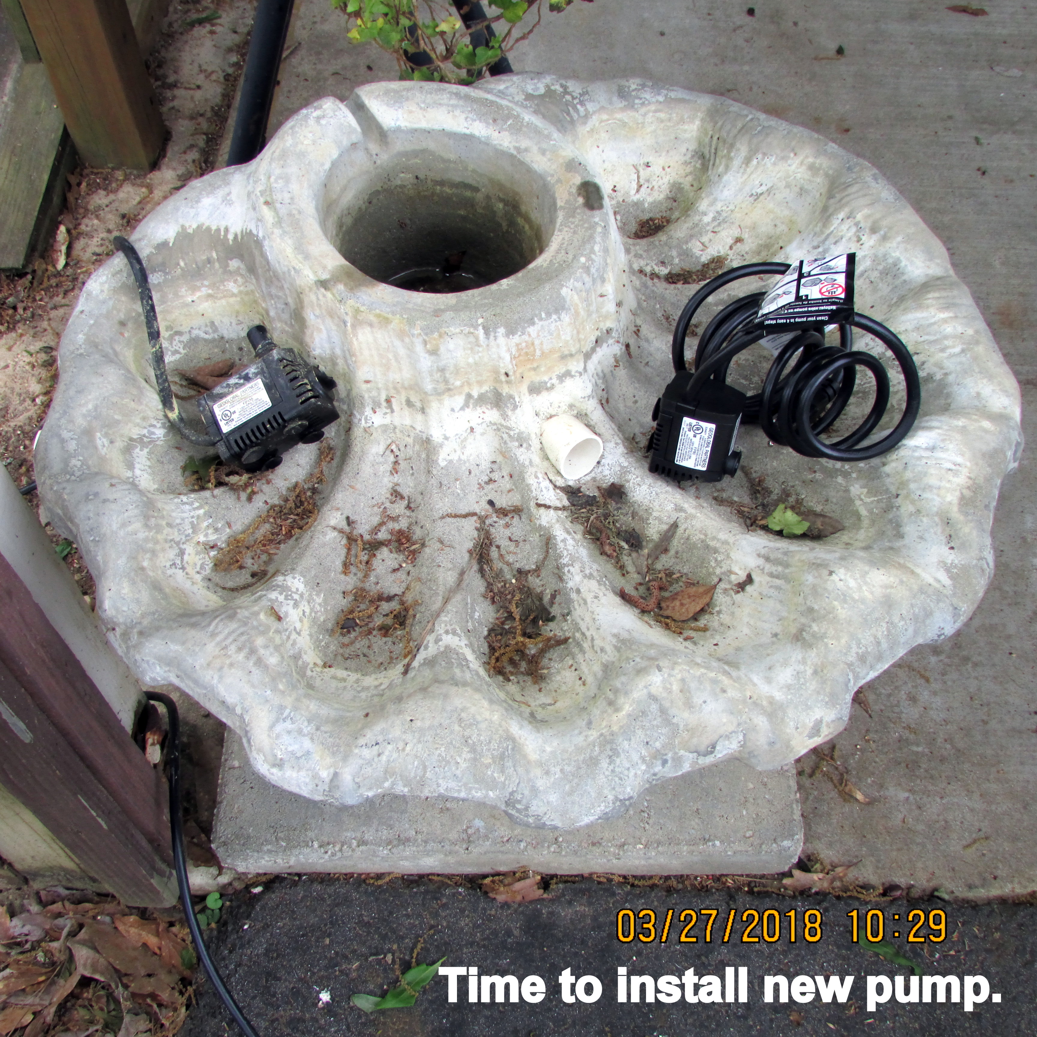 The new pump was purchased at Lowe’s several weeks ago. This morning–while waiting for customers–I installed the new pump. I love the soothing sound of the running water; relaxing. Visitors love the fountain, too, but I’m quick to say “It’s not for sale.”