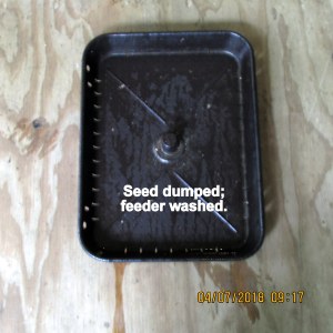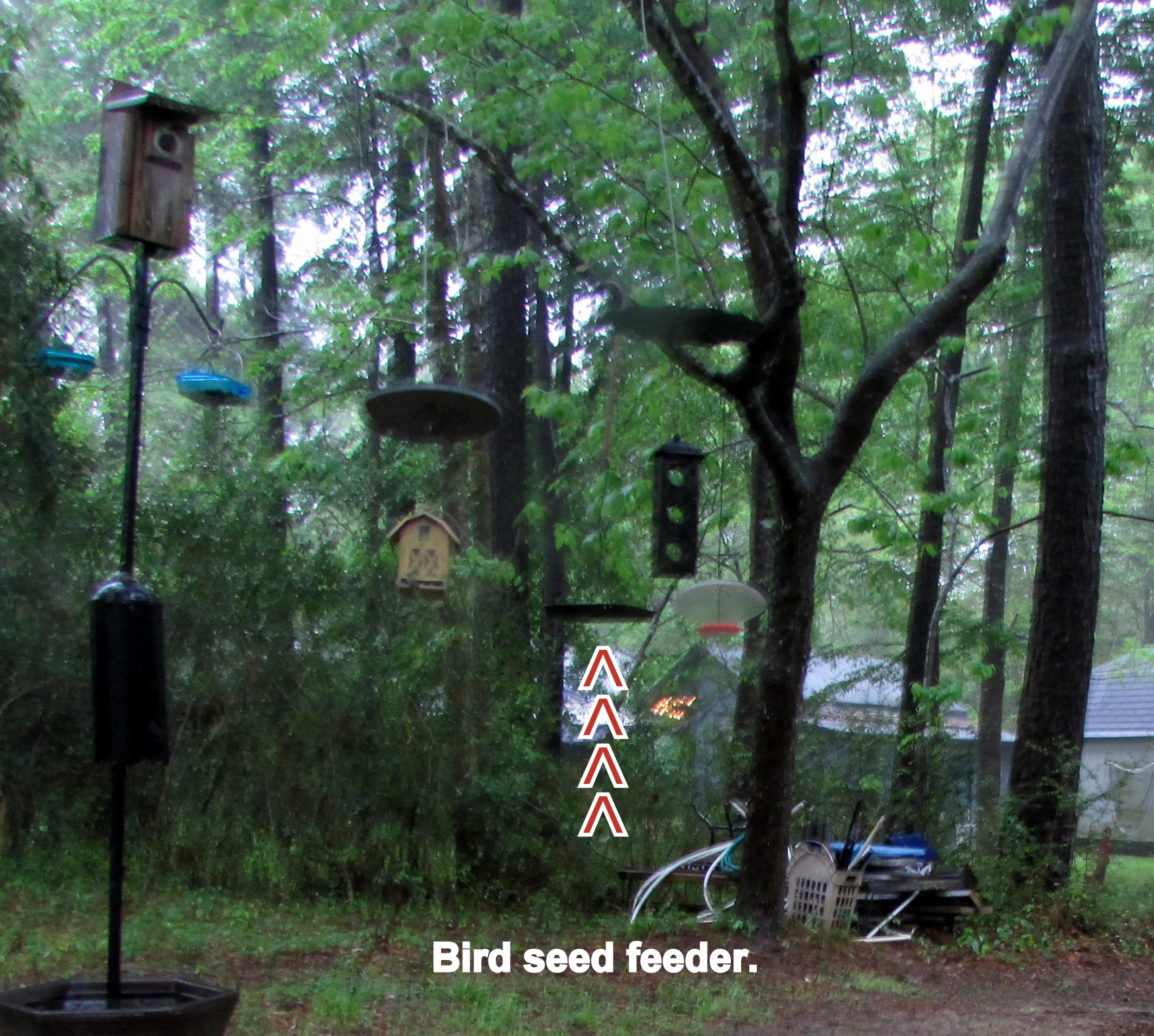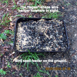 I have a mystery. The bird seed feeder was on the ground and supporting hanger is nowhere in sight. (Third picture shows the array of feeders in an earlier blog message.)