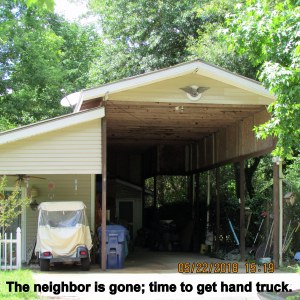 The pictures, and narrative, are not in chronological order. First, I confess to “helping myself” to the heavy-duty hand truck when I saw the neighbor leaving. Then I rushed to the area where I’ve been nursing plants damaged in January hard freeze. Miraculously I was able to tilt the hand truck and get three plants moved to their new location.