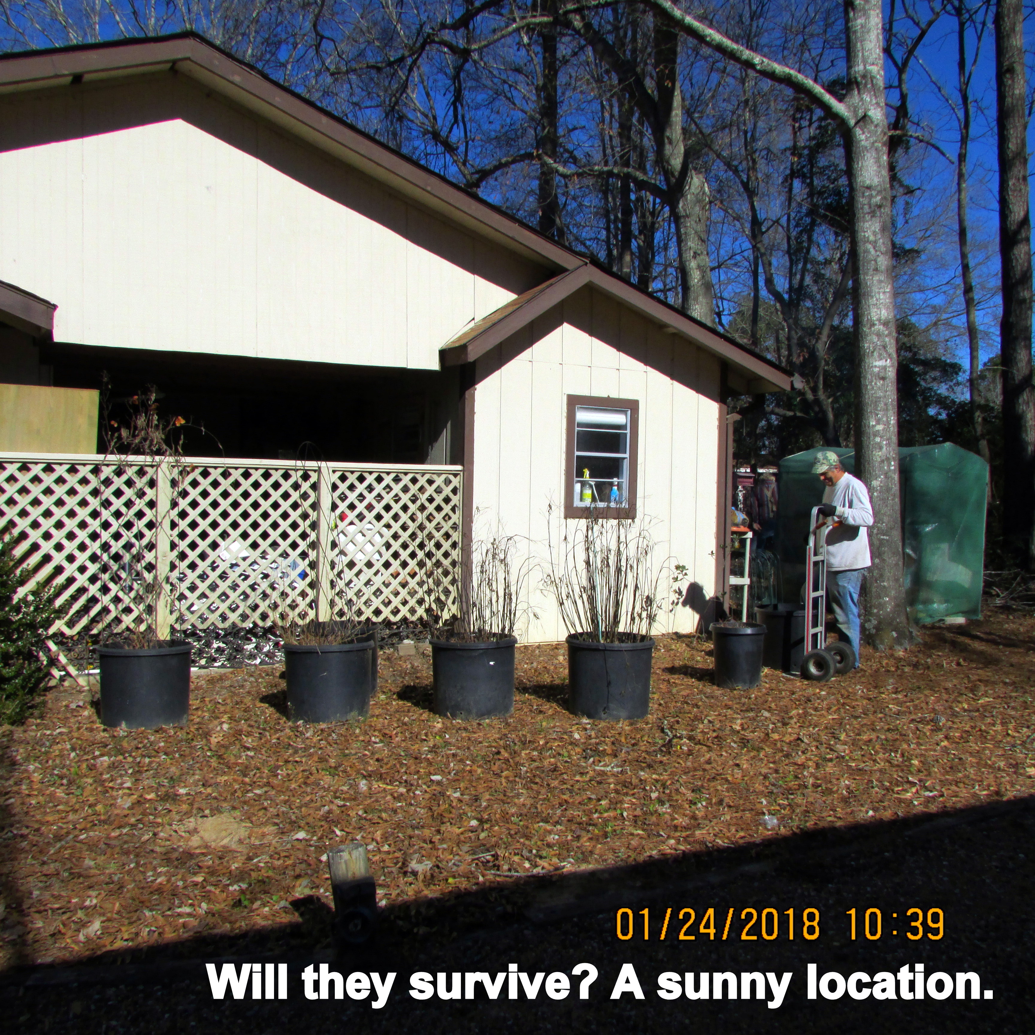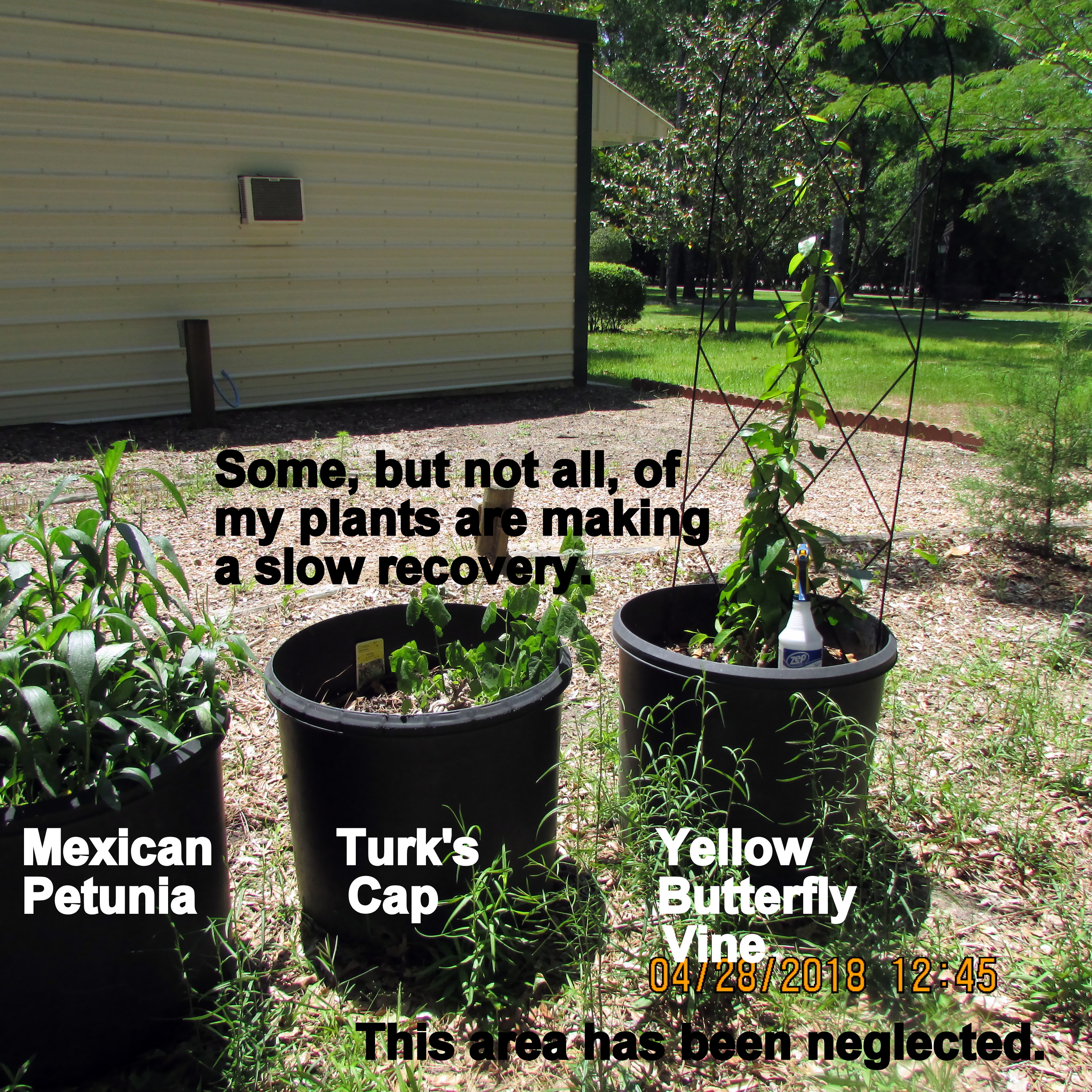 The pictures, and narrative, are not in chronological order. First, I confess to “helping myself” to the heavy-duty hand truck when I saw the neighbor leaving. Then I rushed to the area where I’ve been nursing plants damaged in January hard freeze. Miraculously I was able to tilt the hand truck and get three plants moved to their new location.