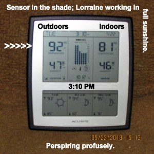 Gratefully, a friend stopped by and we sat in the comfort of the patio for TWO HOURS. I thought he would never leave!! I say “gratefully” because I would have continued to work in the heat. Now (3:30 PM) it is seriously too hot to be outdoors (92 degrees in the shade).