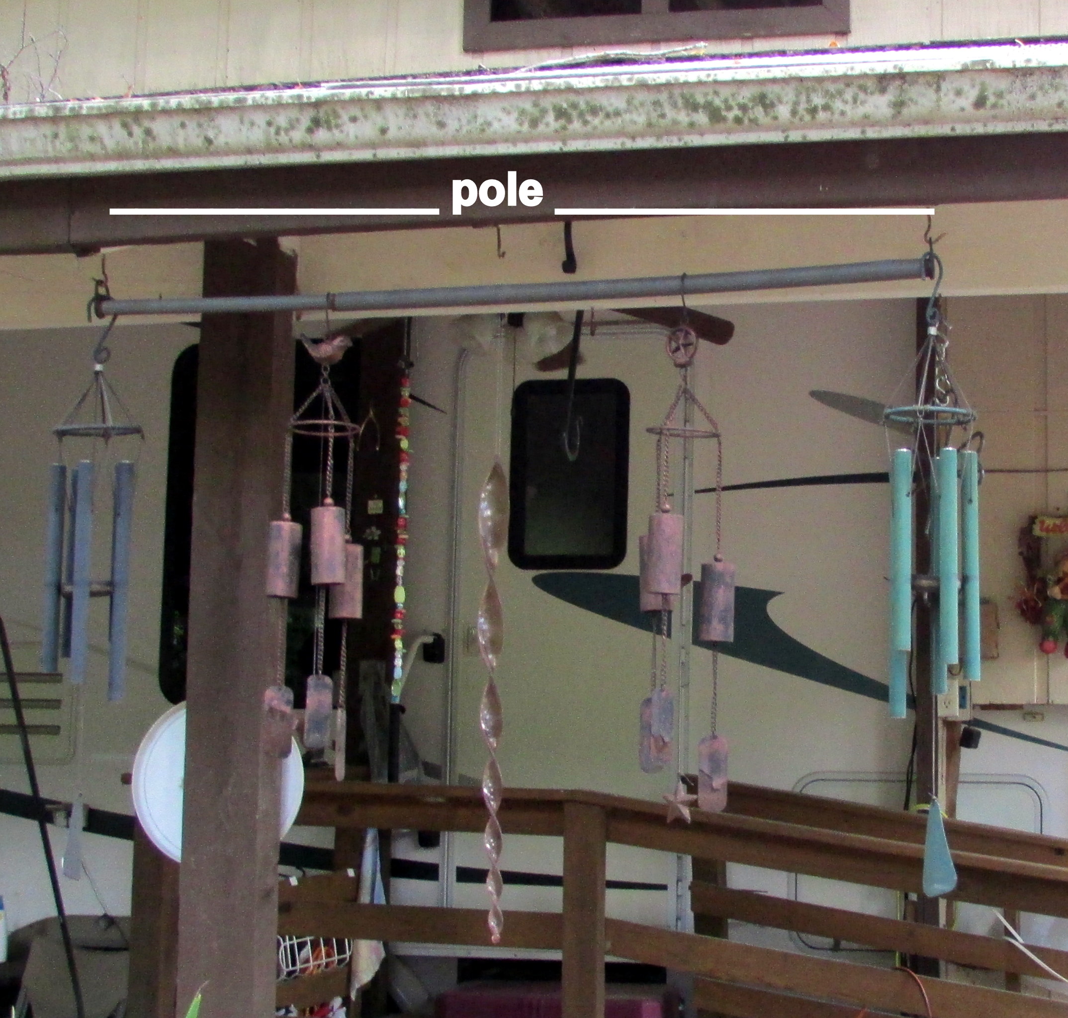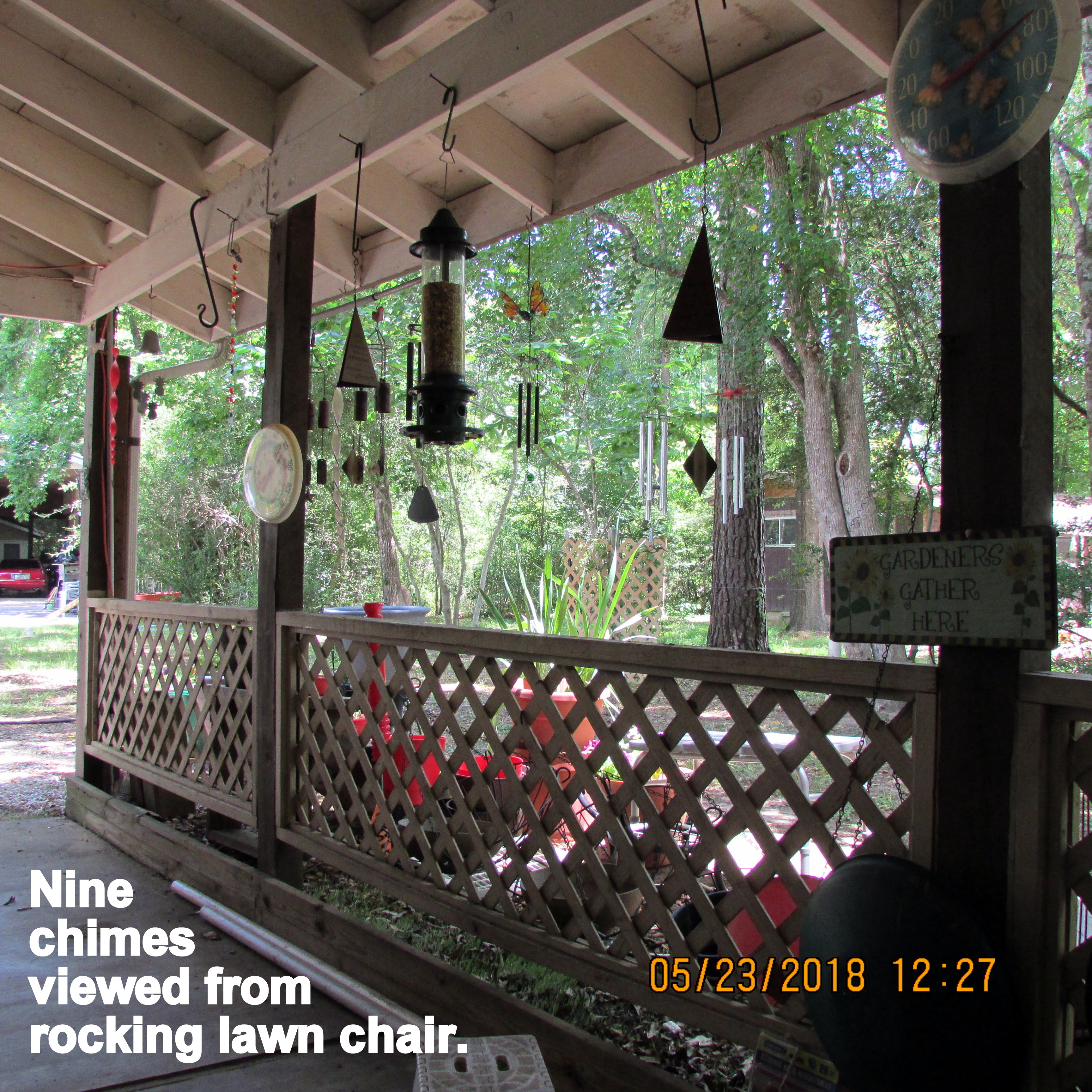 Recently, many bird feeders were removed, emptied and stored because I suspect the birds have flown further North. The only action on the feeders: SQUIRRELS. So the packed-away-out-of-sight wind chimes were introduced to my patio.