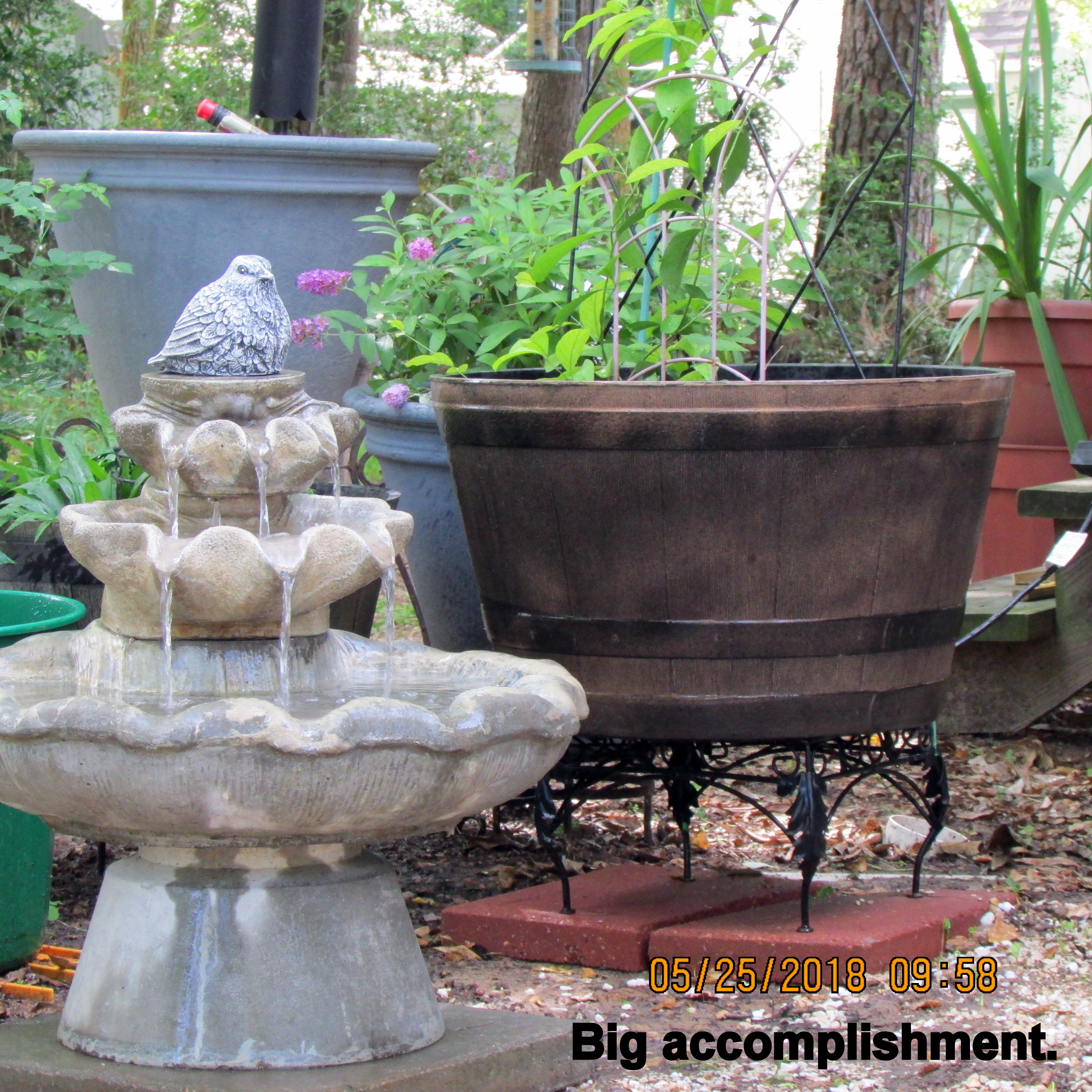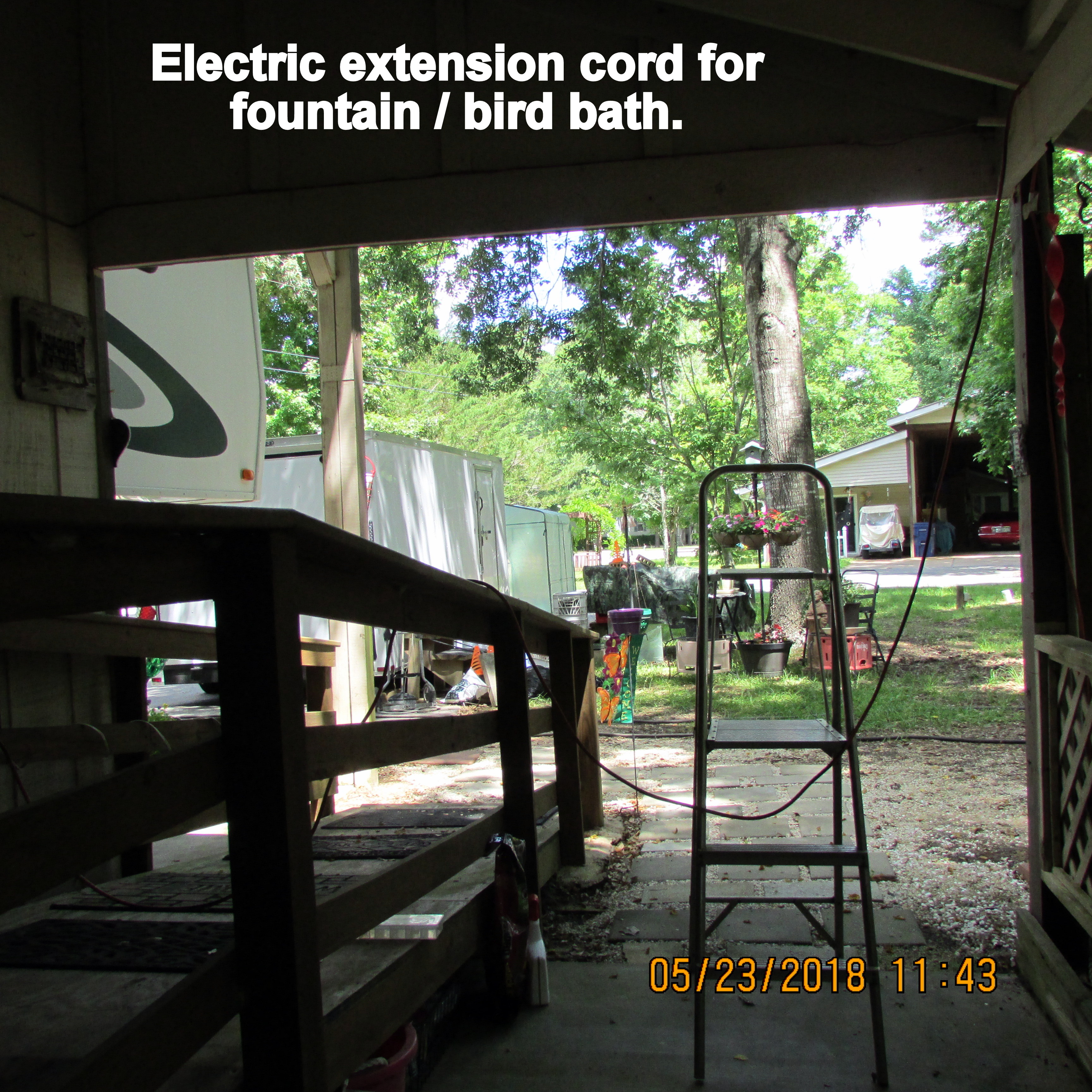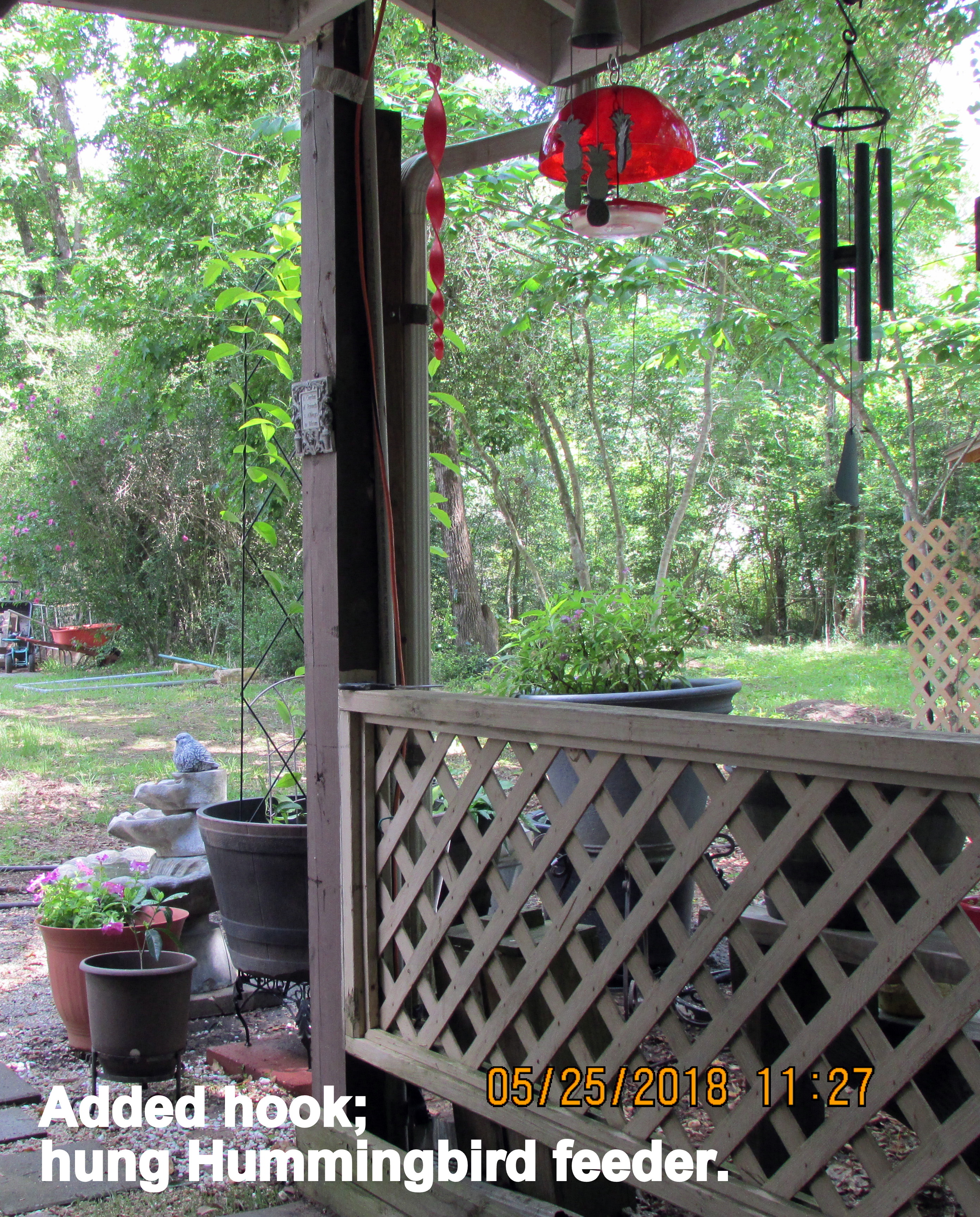 Not a single penny spent on projects this morning. From my personal “hardware store,” the hooks I needed. Furthermore, I already possessed the proper length electric extension cord for (eventually relocated)) fountain-bird bath.