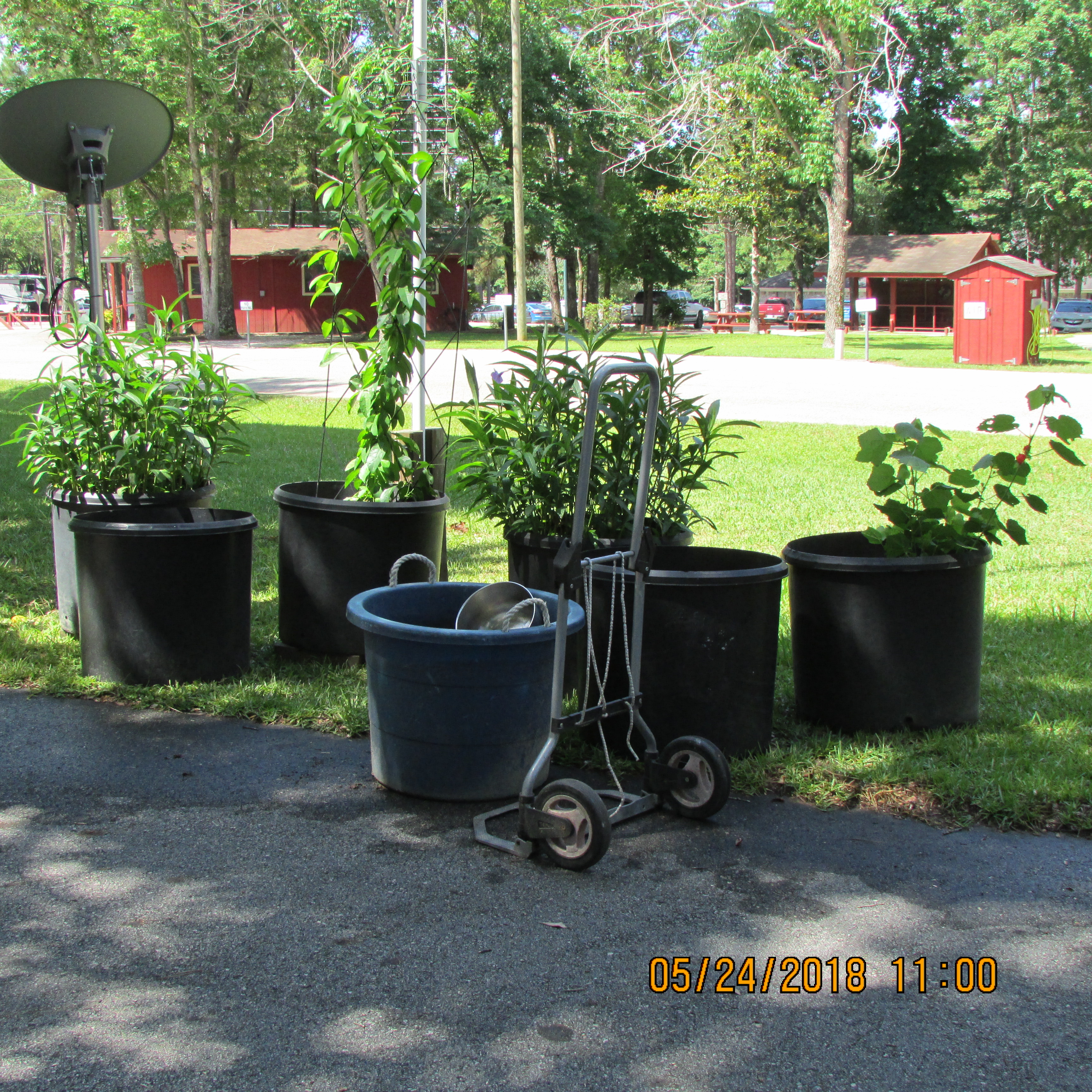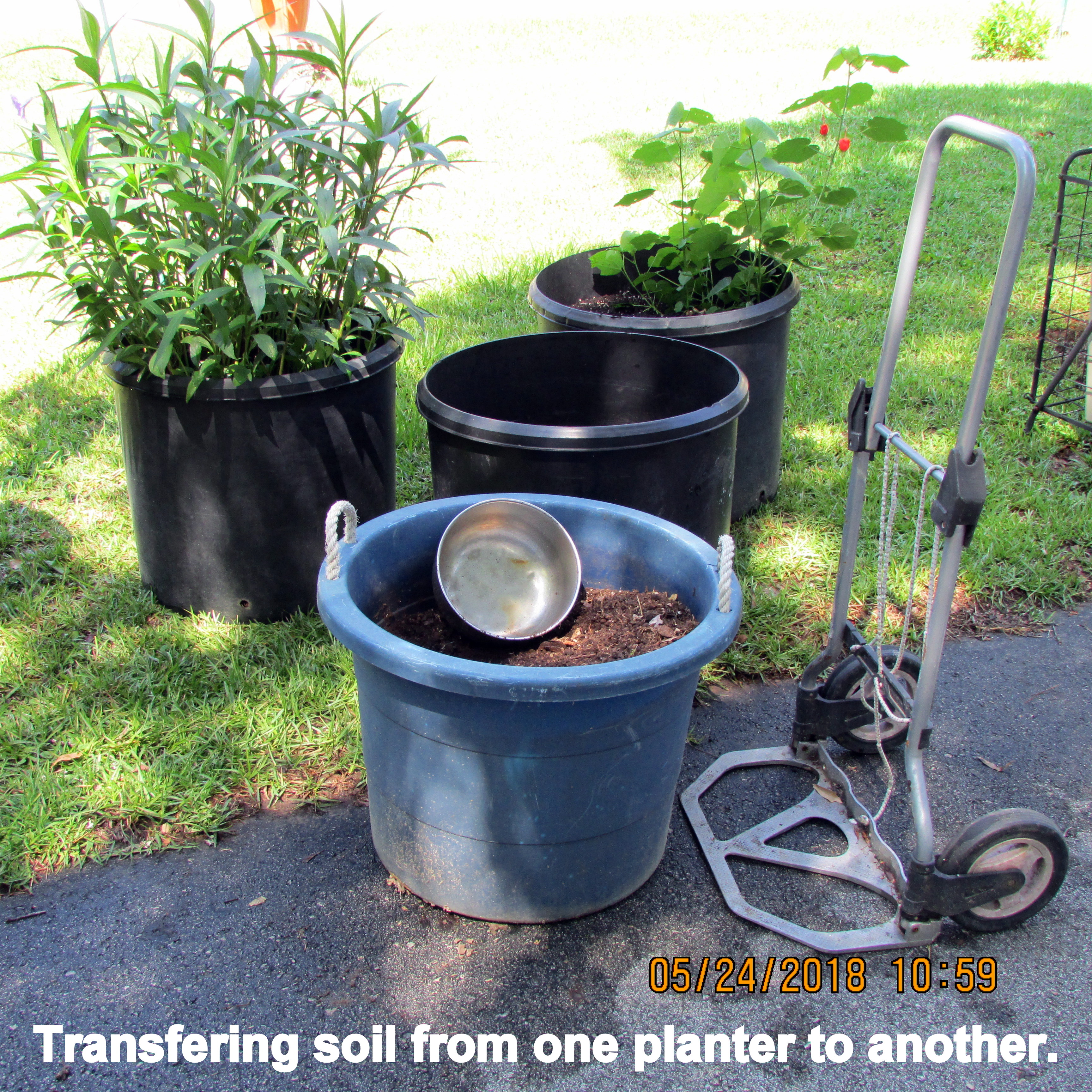 It was more than ninety-two degrees in the hot humid sunshine but I persevered. It’s difficult to tilt a planter on to the hand truck. I needed another pair of hands; two planters did not get moved.