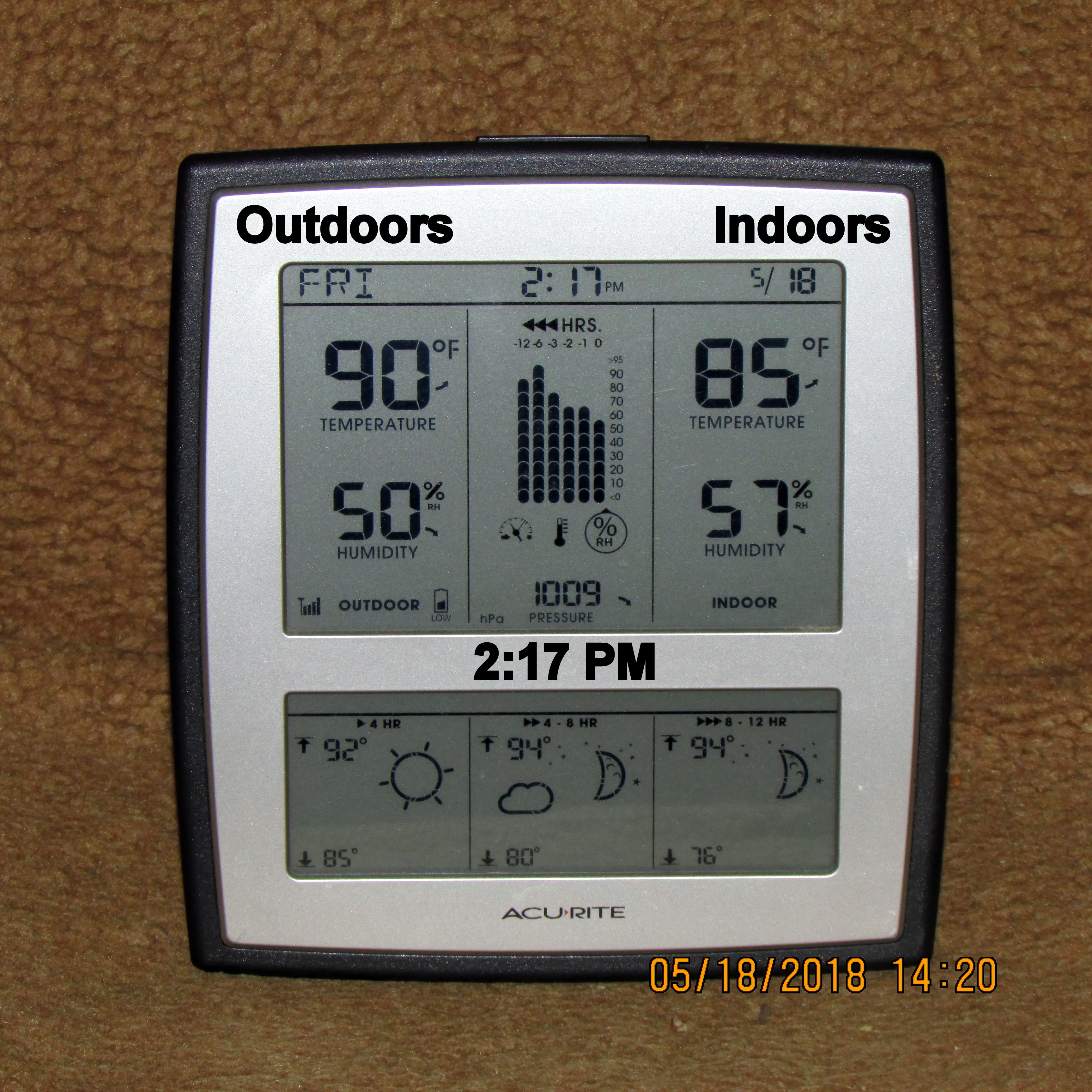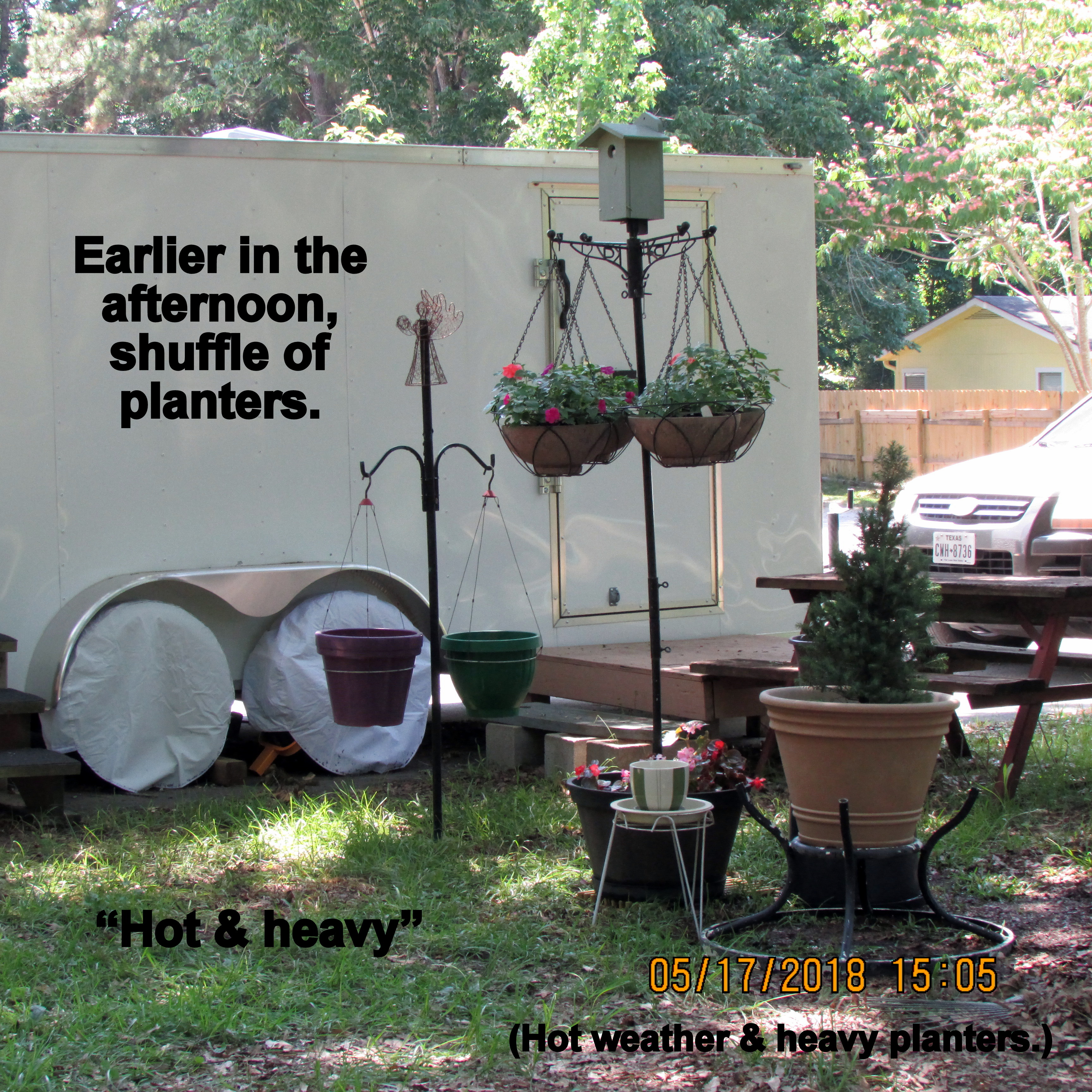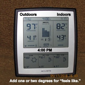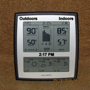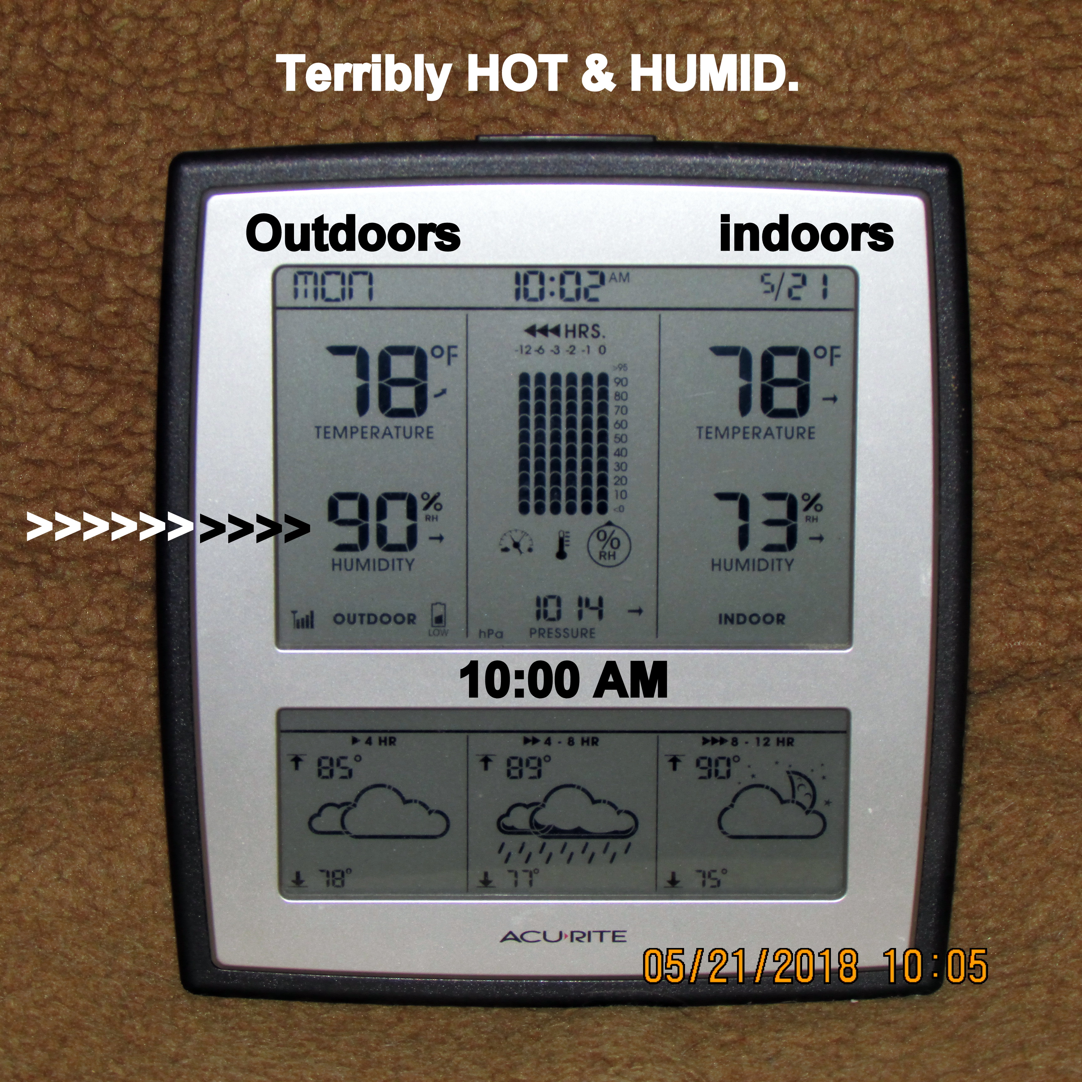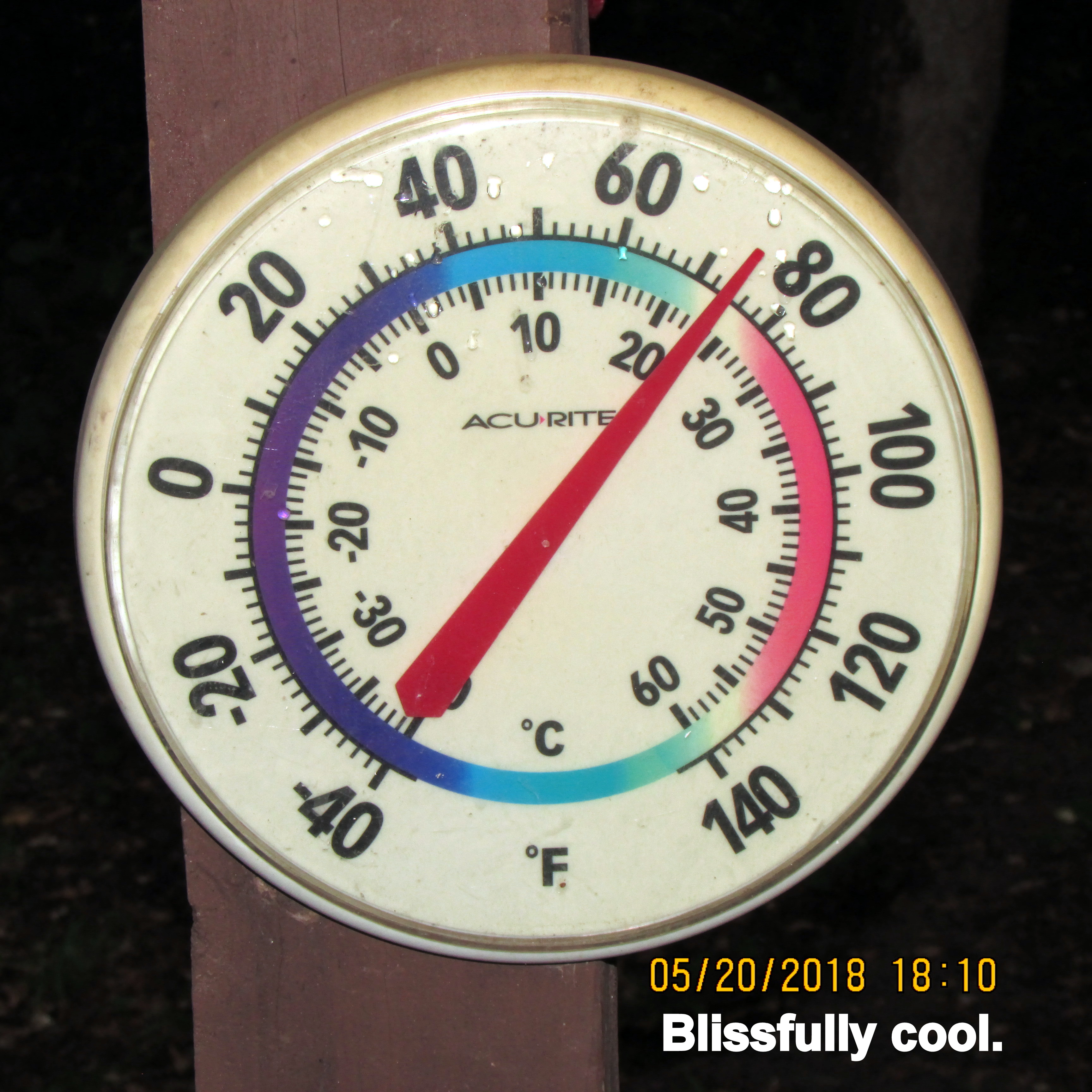 “Yes,” time spent in the yard. When I grabbed the garden hose to wash an area of the driveway, NO WATER. I checked for kinks in the hose and found none; I came into the trailer to double-check. NO WATER (several properties are on a well) . So I made a cup of coffee (from my filtered water supply), fixed a bowl of cereal and started this message. Earlier, I took down yard sale signs and removed evidence of a yard sale. More preparation for eventual planters shuffle. ~~ Hey, seventy-eight degrees doesn’t appear hot but look at the ninety percent humidity!!