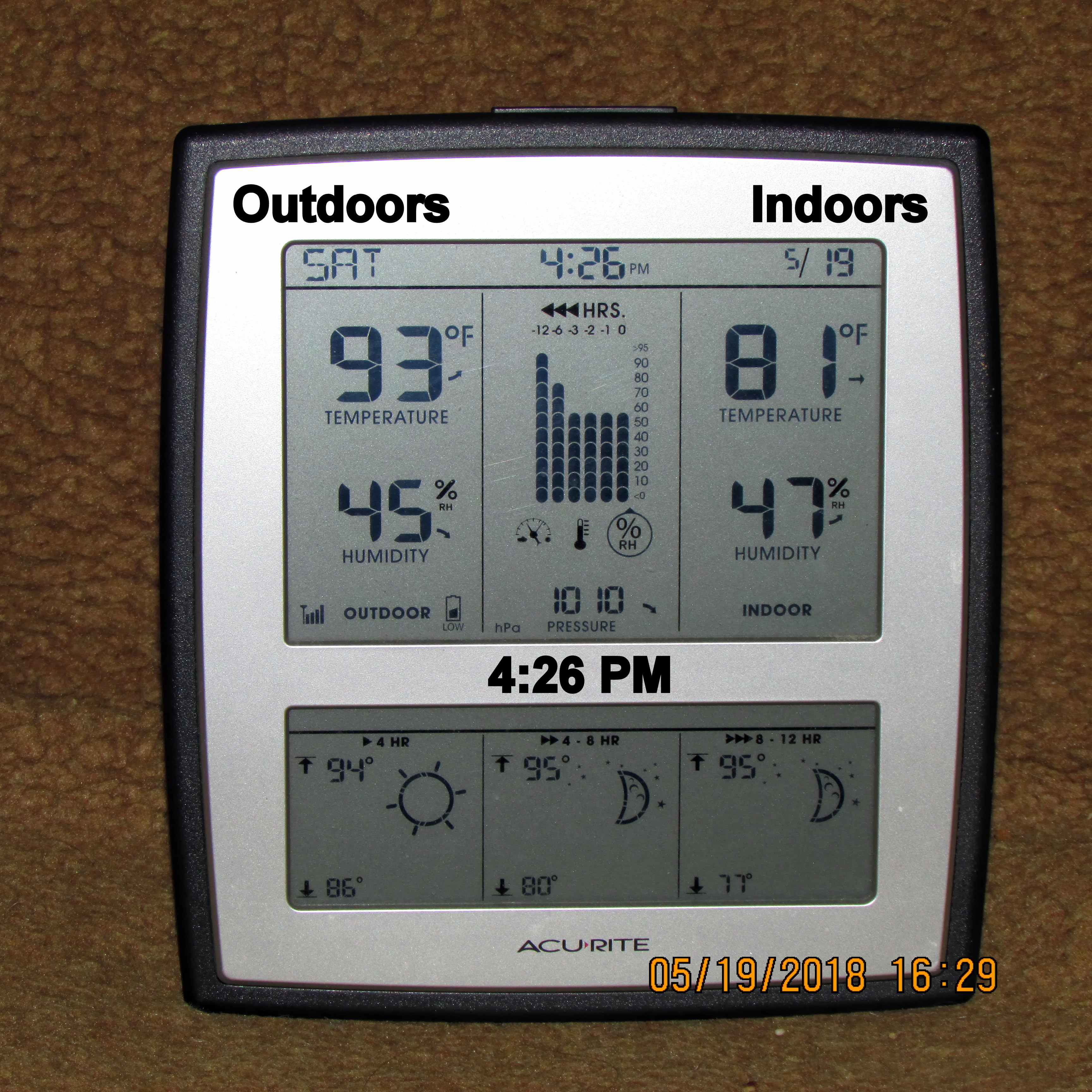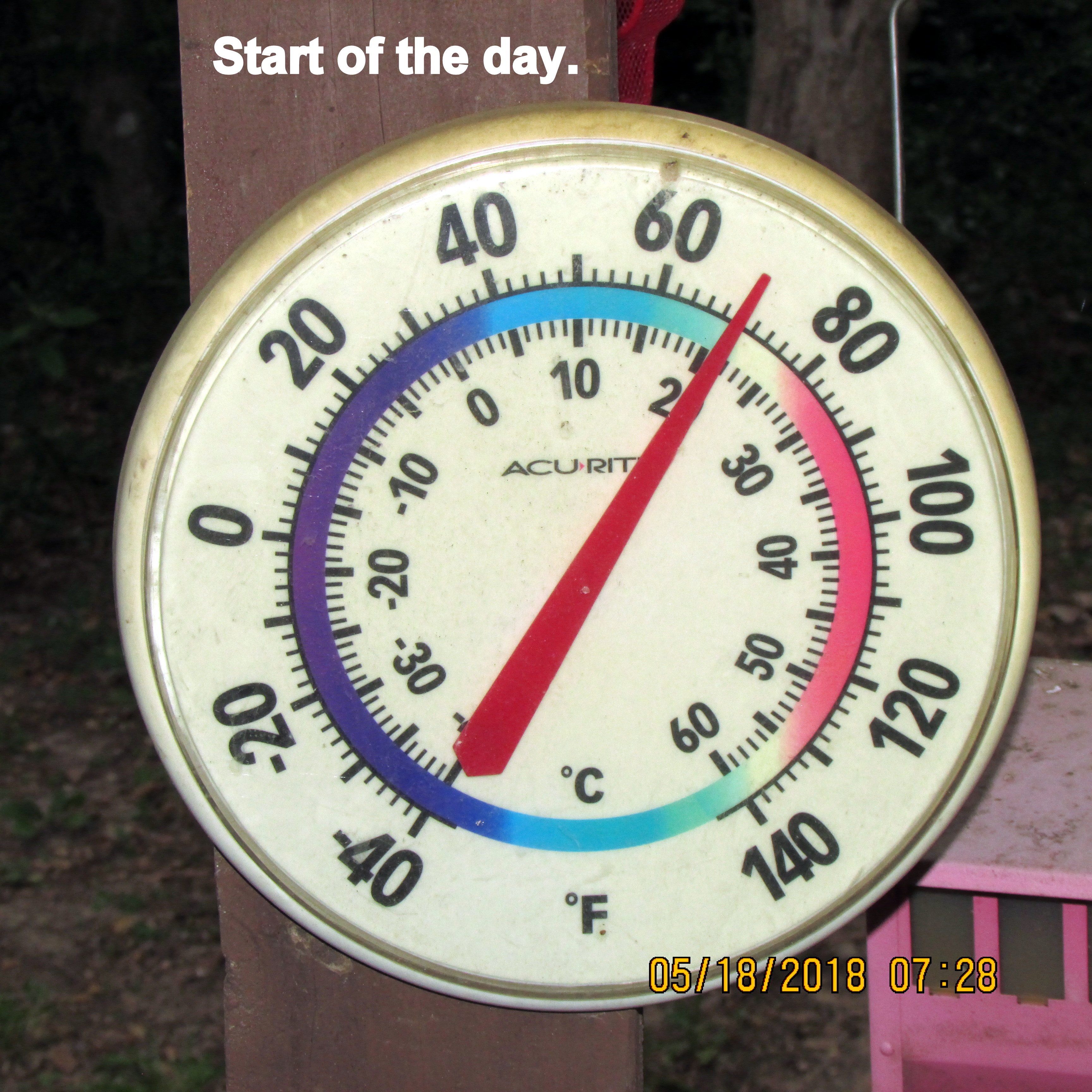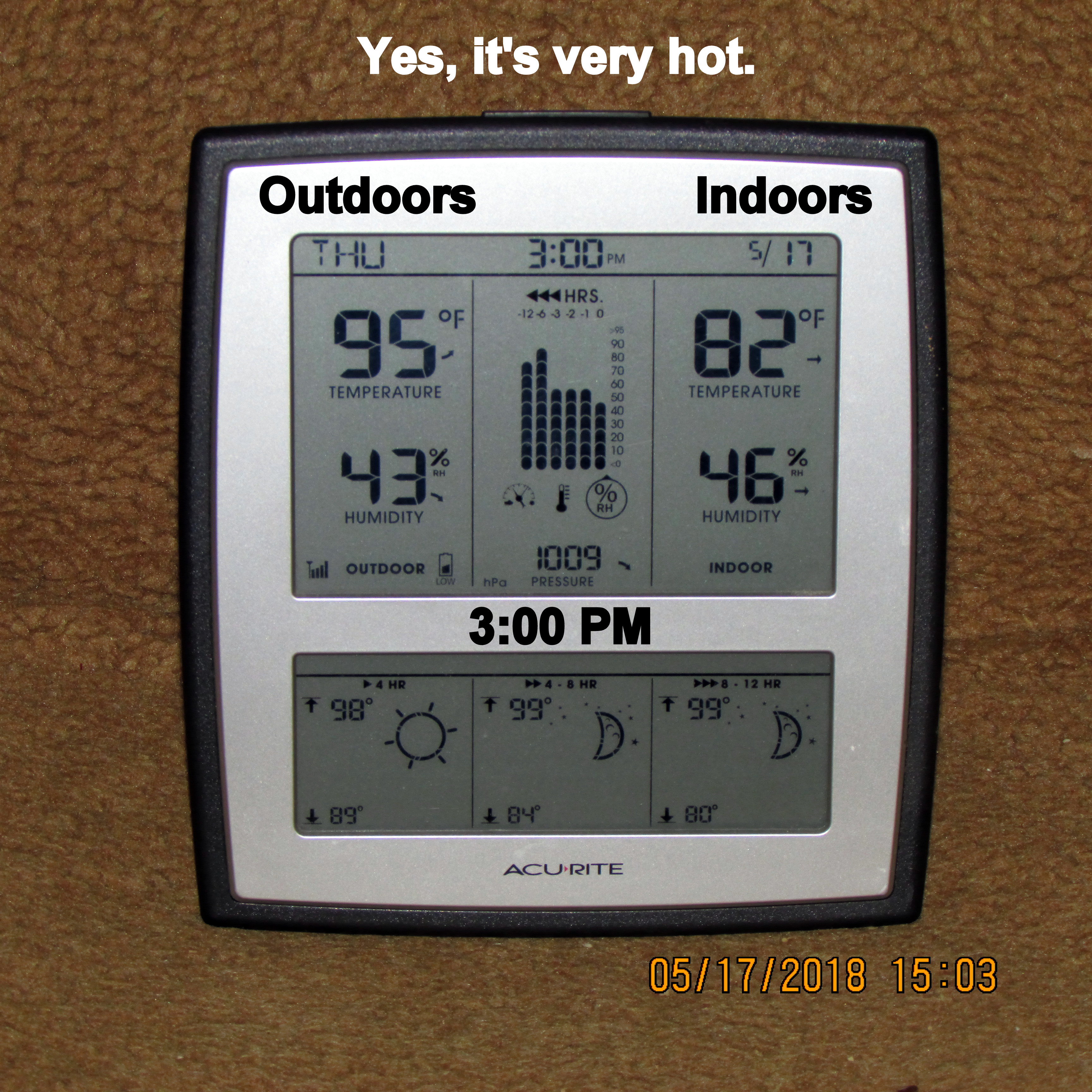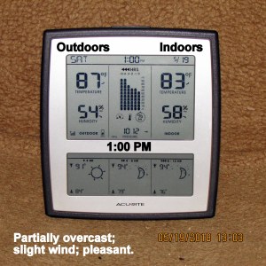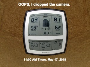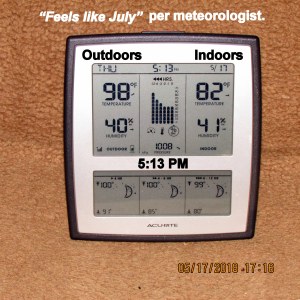“Yes,” time spent in the yard. When I grabbed the garden hose to wash an area of the driveway, NO WATER. I checked for kinks in the hose and found none; I came into the trailer to double-check. NO WATER (several properties are on a well) . So I made a cup of coffee (from my filtered water supply), fixed a bowl of cereal and started this message. Earlier, I took down yard sale signs and removed evidence of a yard sale. More preparation for eventual planters shuffle. ~~ Hey, seventy-eight degrees doesn’t appear hot but look at the ninety percent humidity!!