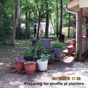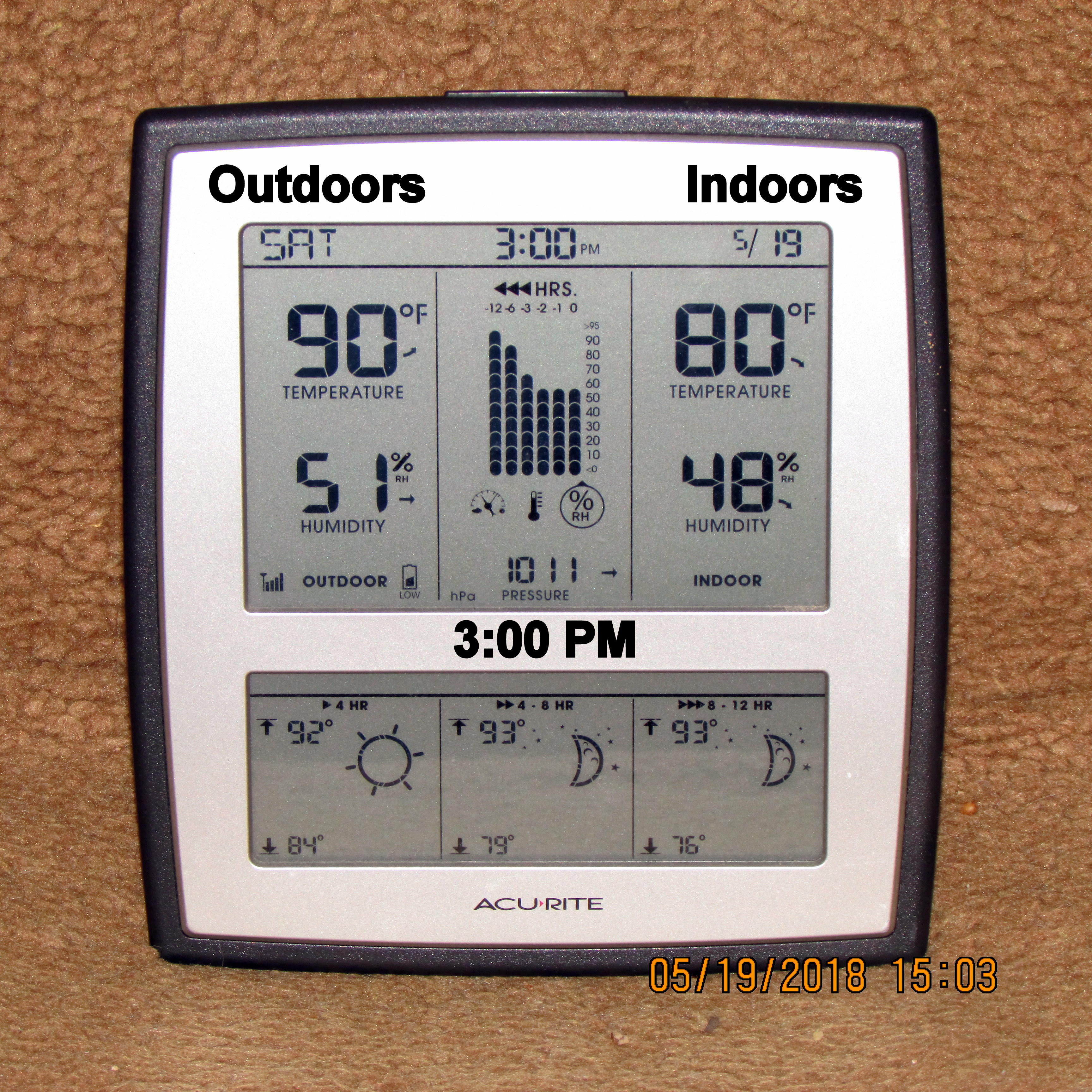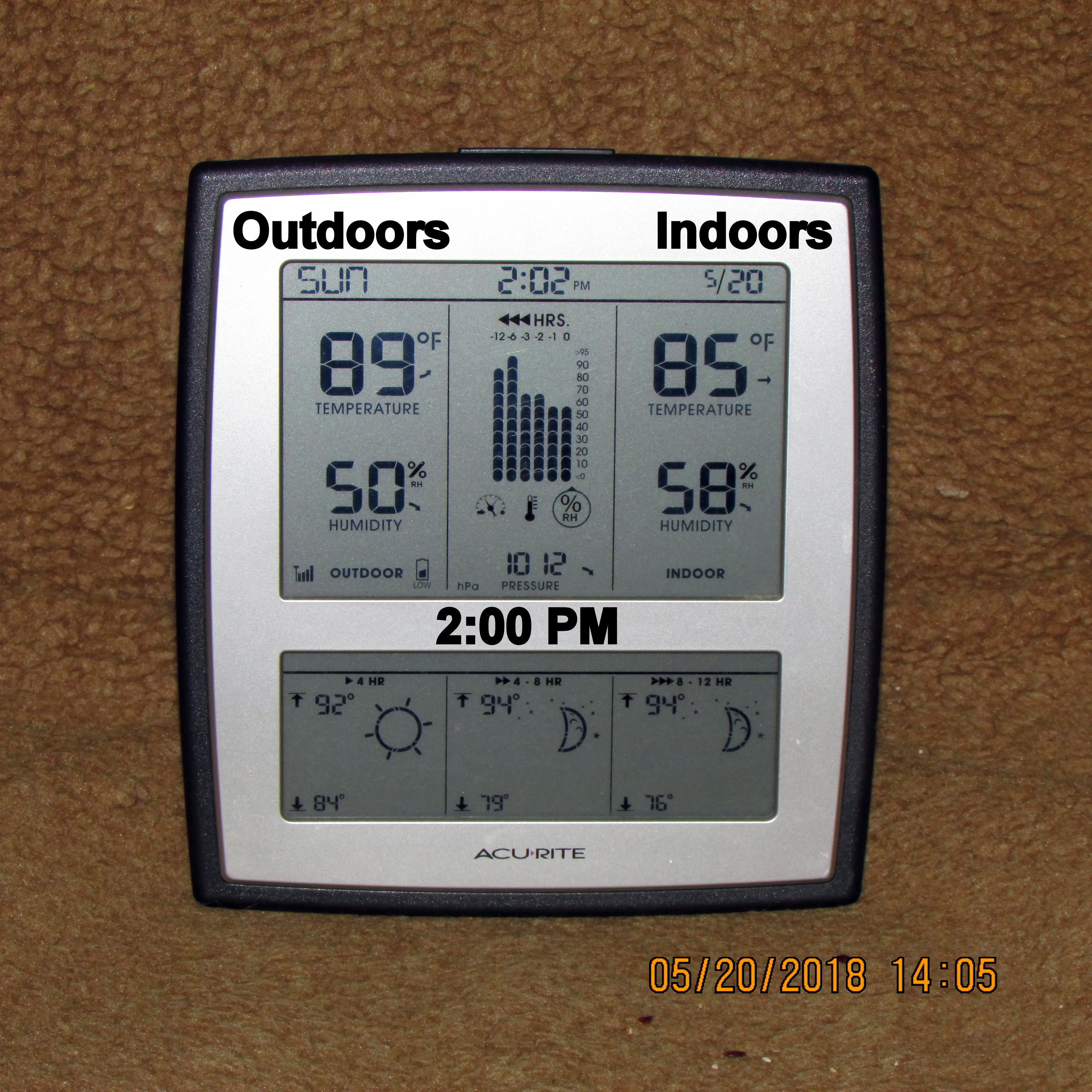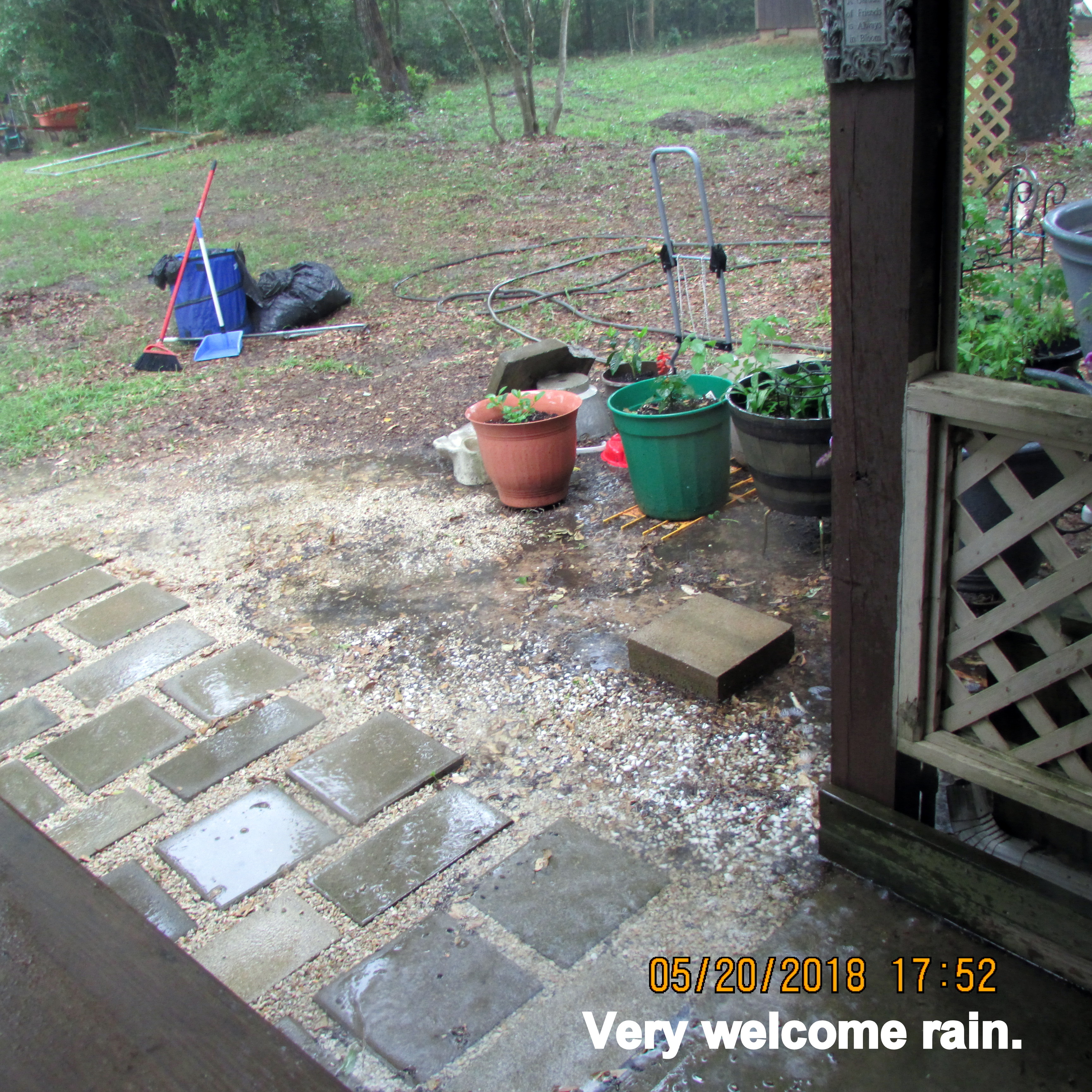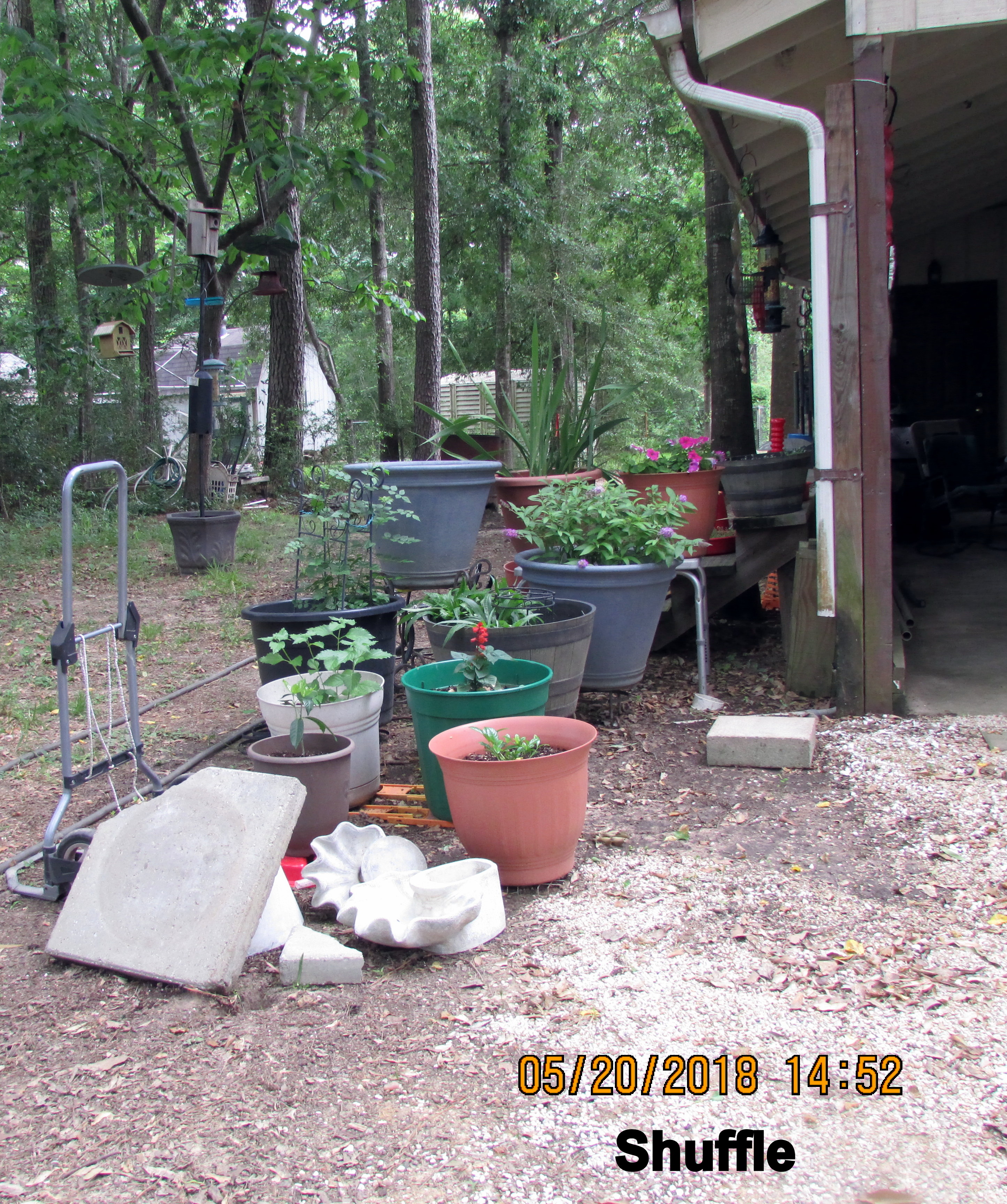 “Yes,” time spent in the yard. When I grabbed the garden hose to wash an area of the driveway, NO WATER. I checked for kinks in the hose and found none; I came into the trailer to double-check. NO WATER (several properties are on a well) . So I made a cup of coffee (from my filtered water supply), fixed a bowl of cereal and started this message. Earlier, I took down yard sale signs and removed evidence of a yard sale. More preparation for eventual planters shuffle. ~~ Hey, seventy-eight degrees doesn’t appear hot but look at the ninety percent humidity!!