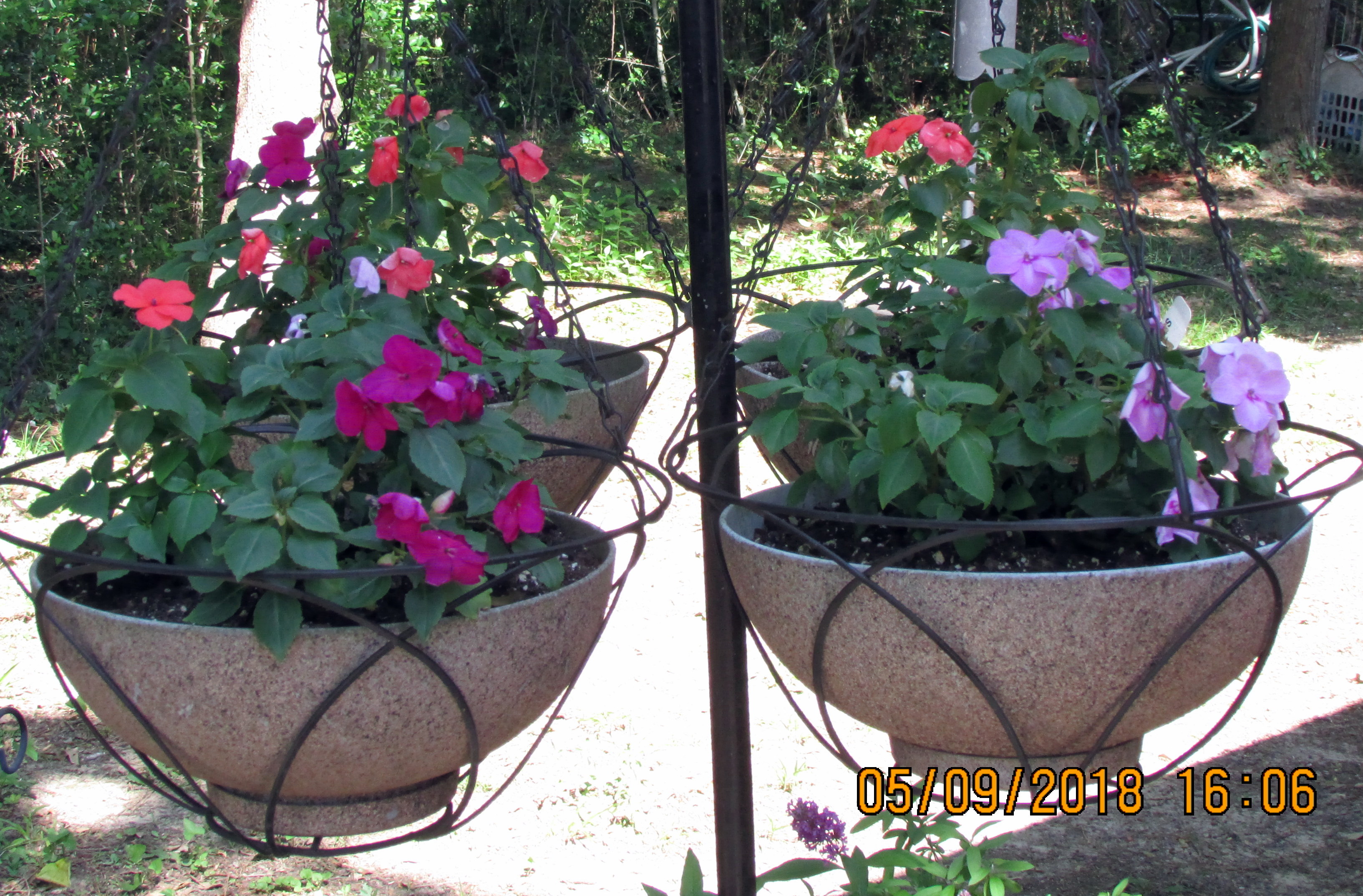 I’ve known Impatiens prefer shade but continued to hang the baskets on “their” hooks on special-built planter.