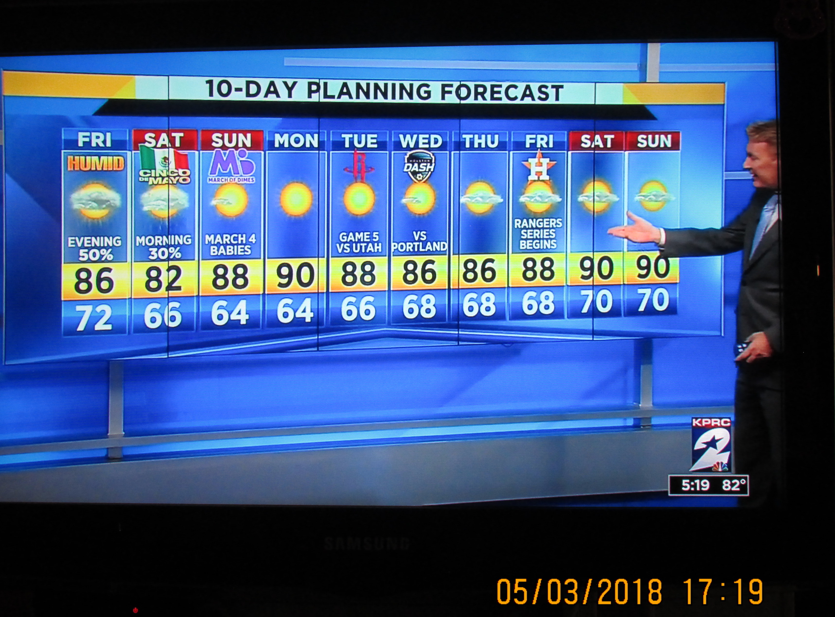 Yesterday, Houston TV meteorologist said it was the hottest day of the year to date–in the nineties. I didn’t check. Today promises to be likewise hot and humid. I hate to start using my air-conditioner so early in the year.