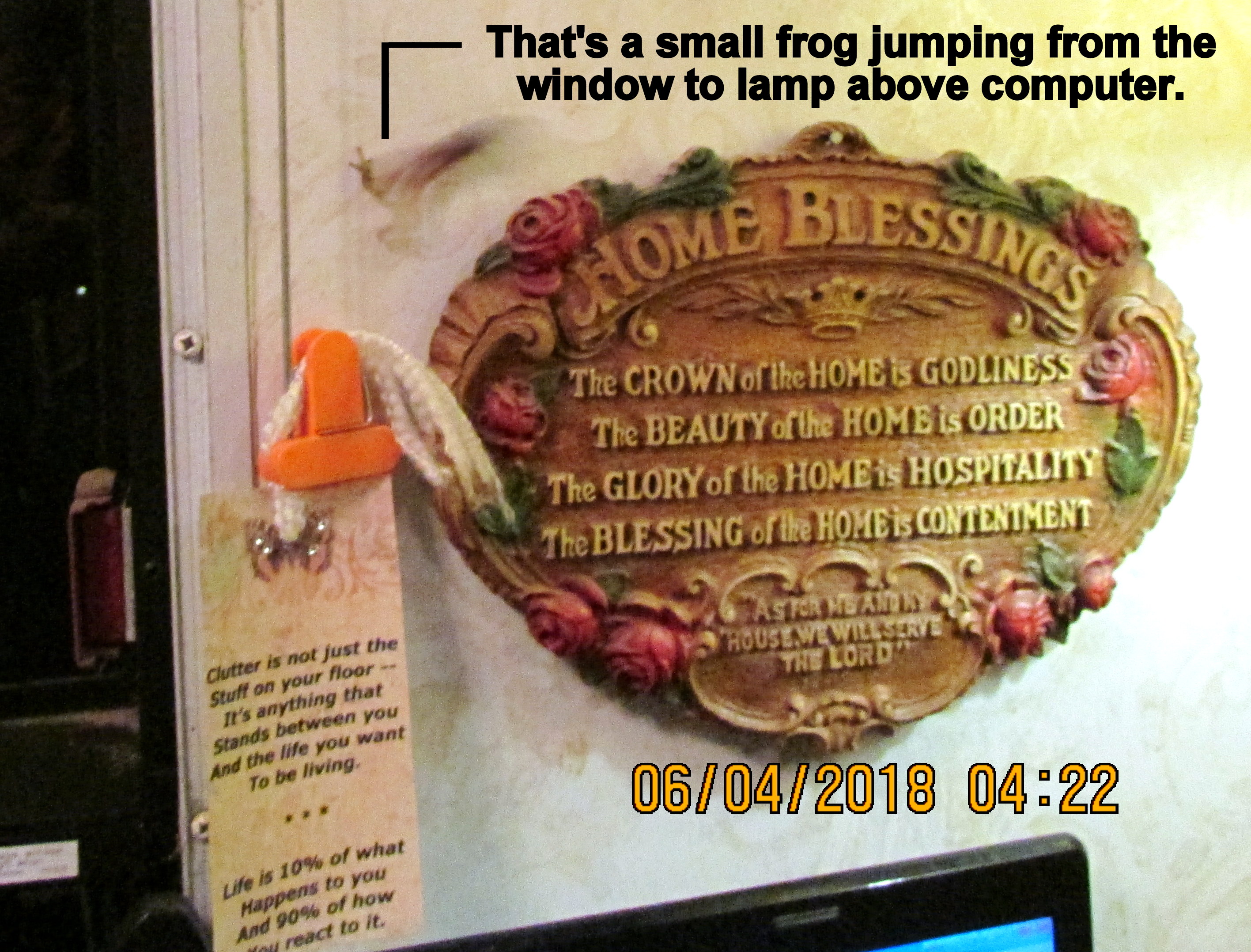 Read the messages above my computer. Maybe the frog was sent to draw my attention to those messages?! I confess to a cluttered trailer home. (I prefer to spend time outdoors in the yard. ) “The beauty of the home is order.” I definitely do not have “order” in my life. “Clutter is not just the stuff on your floor; It’s anything that stands between you and the life you want to be living.”