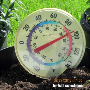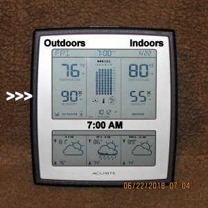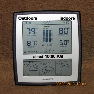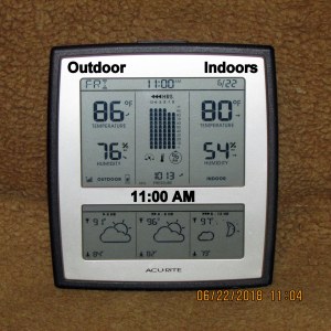 There are clouds intermittently blocking the sun so documented temperature appears comfortable. But look at the humidity. Two fans are moving the air inside my trailer home plus the air-conditioner. My electric bill will be enormous; I hate to drop the thermostat below eighty degrees.